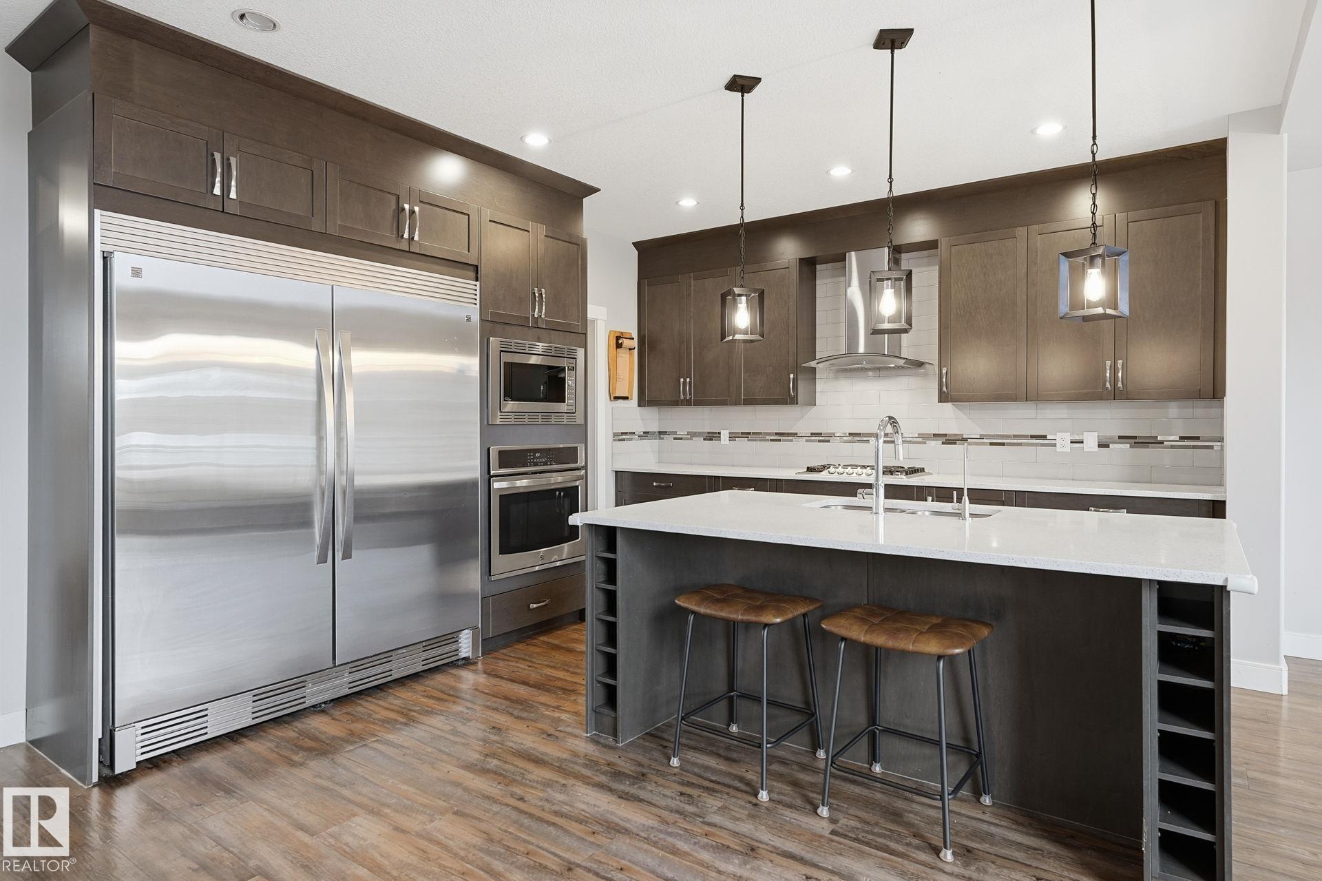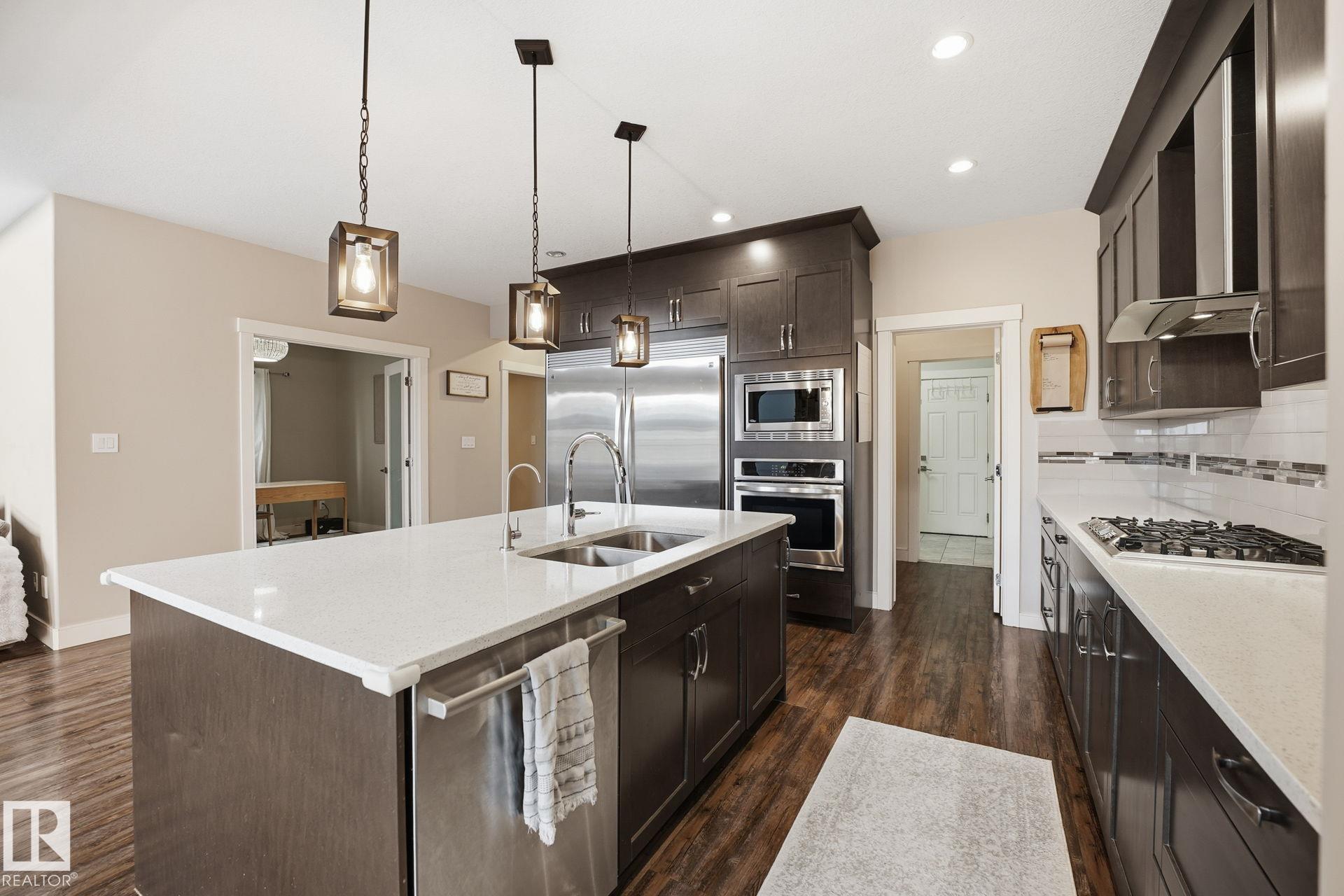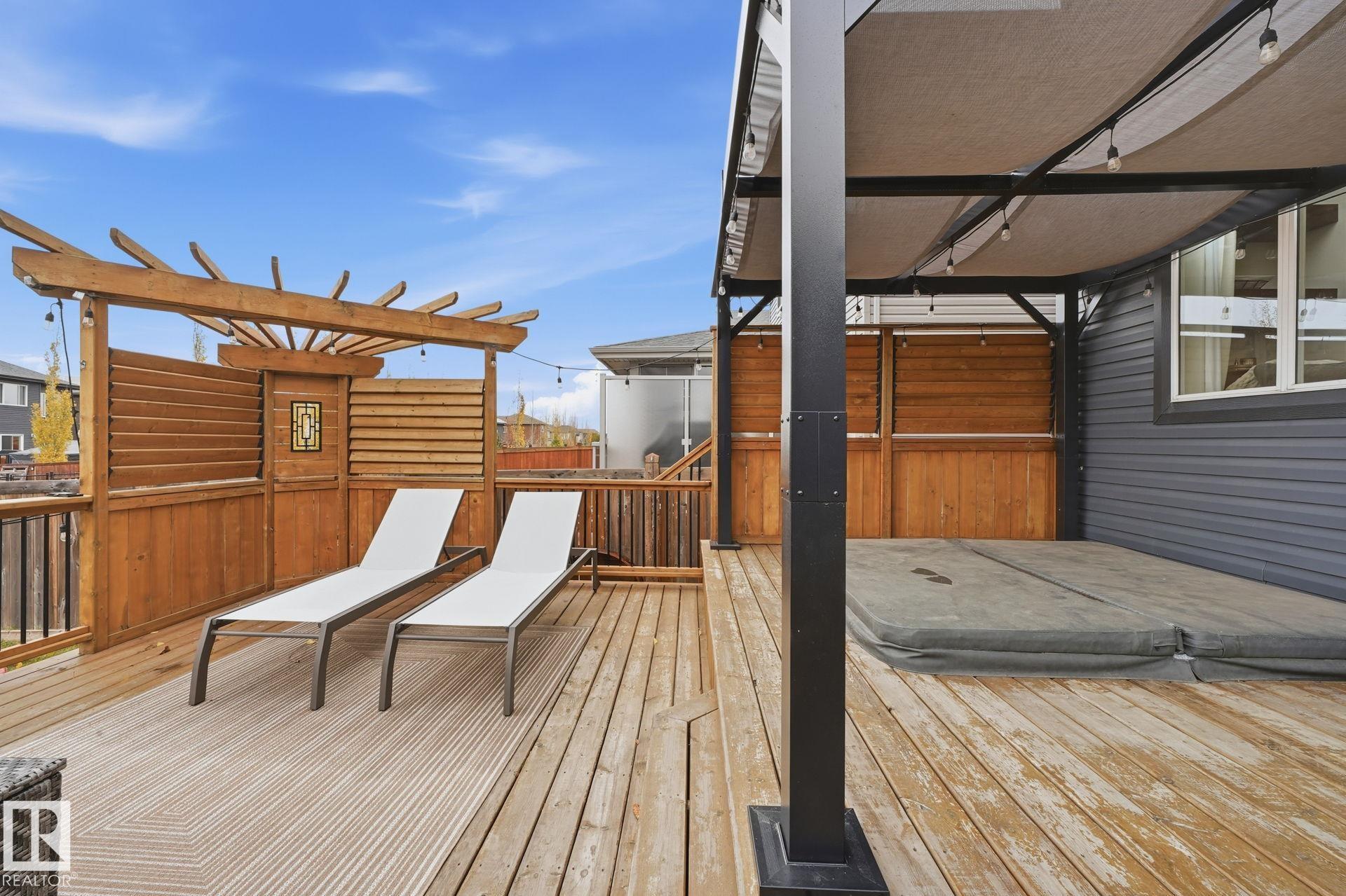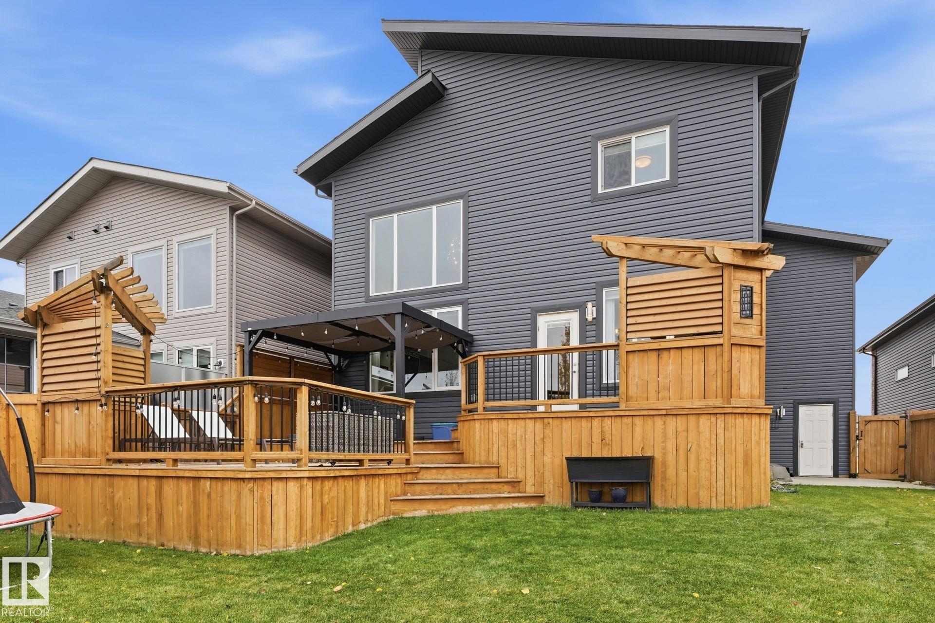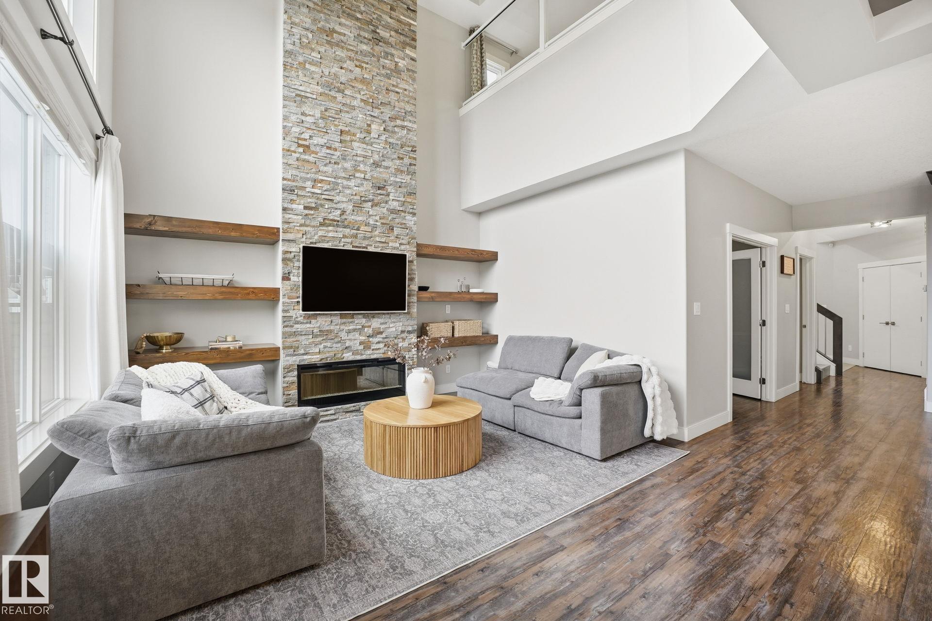 Tucked away on a quiet street, this architecturally distinct home blends thoughtful design with everyday function. Backing onto a beautiful multi-use path and steps from both Public and Catholic schools, it offers the perfect mix of privacy and community. Inside, soaring ceilings and oversized windows fill the open-concept main floor with natural light, showcasing the stone fireplace, coffered ceilings, and sleek quartz finishes. The layout includes 4 bedrooms, 4 bathrooms, a main-floor den, bonus room, and a fully finished basement. The massive triple-tandem garage features loft storage, an 18-ft door, and room for RV parking. The spa-inspired primary suite impresses with vaulted ceilings, electric blinds, a barn door, a walk-in shower with body jets, and a skylight that floods the ensuite with natural light. Outside, a multi-tiered deck with privacy walls and a hot tub extends the living space. Complete with durable vinyl plank flooring, designer lighting, gas range, gourmet fridge, and central air.