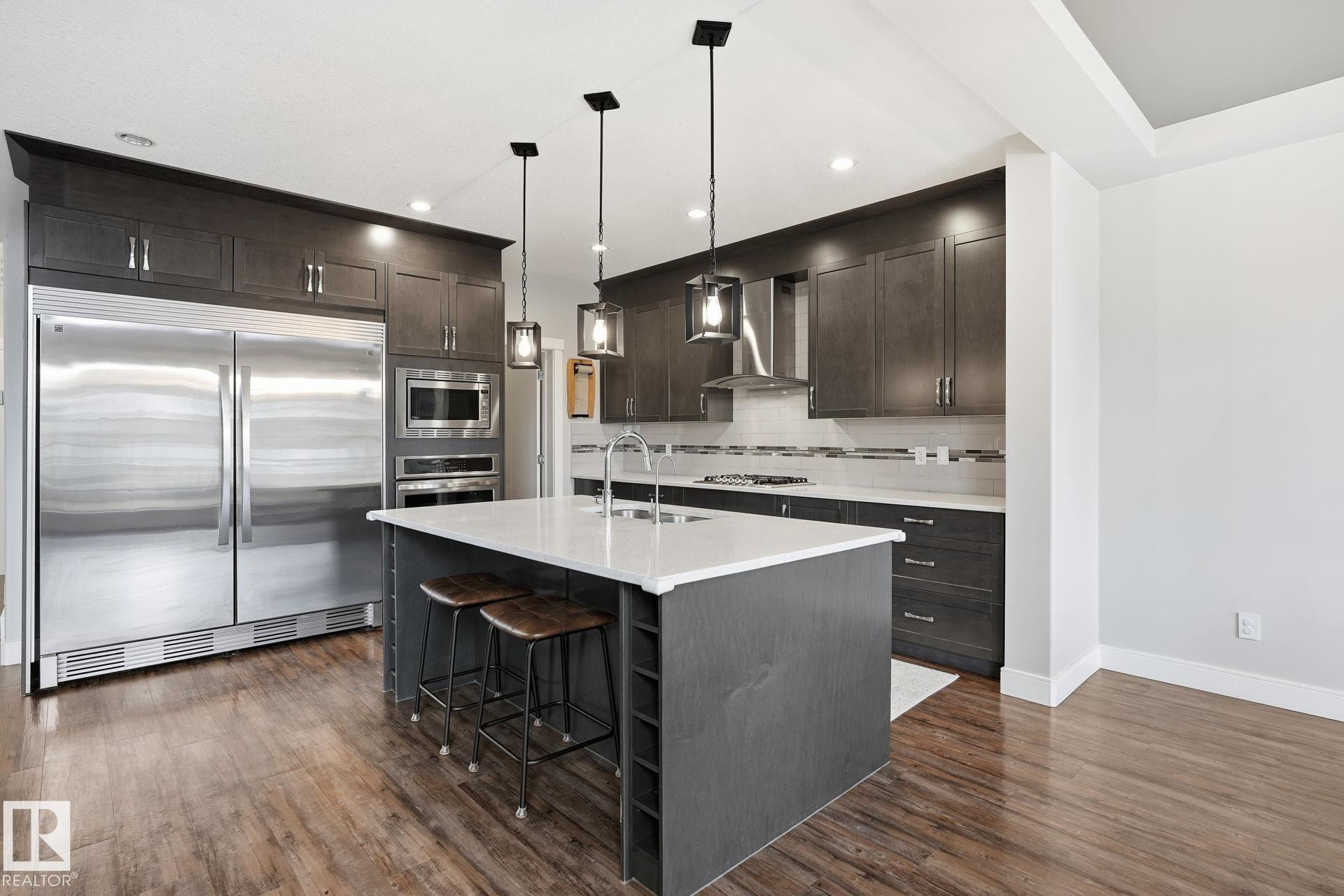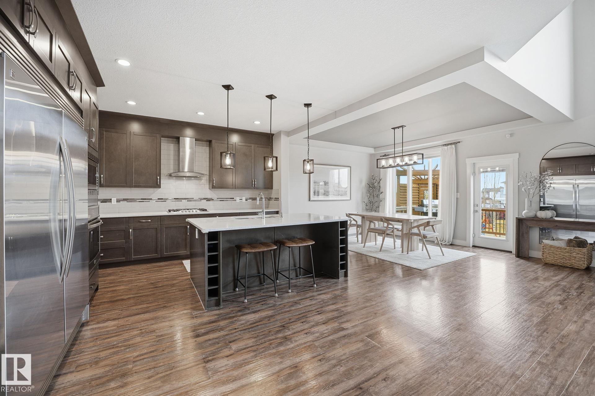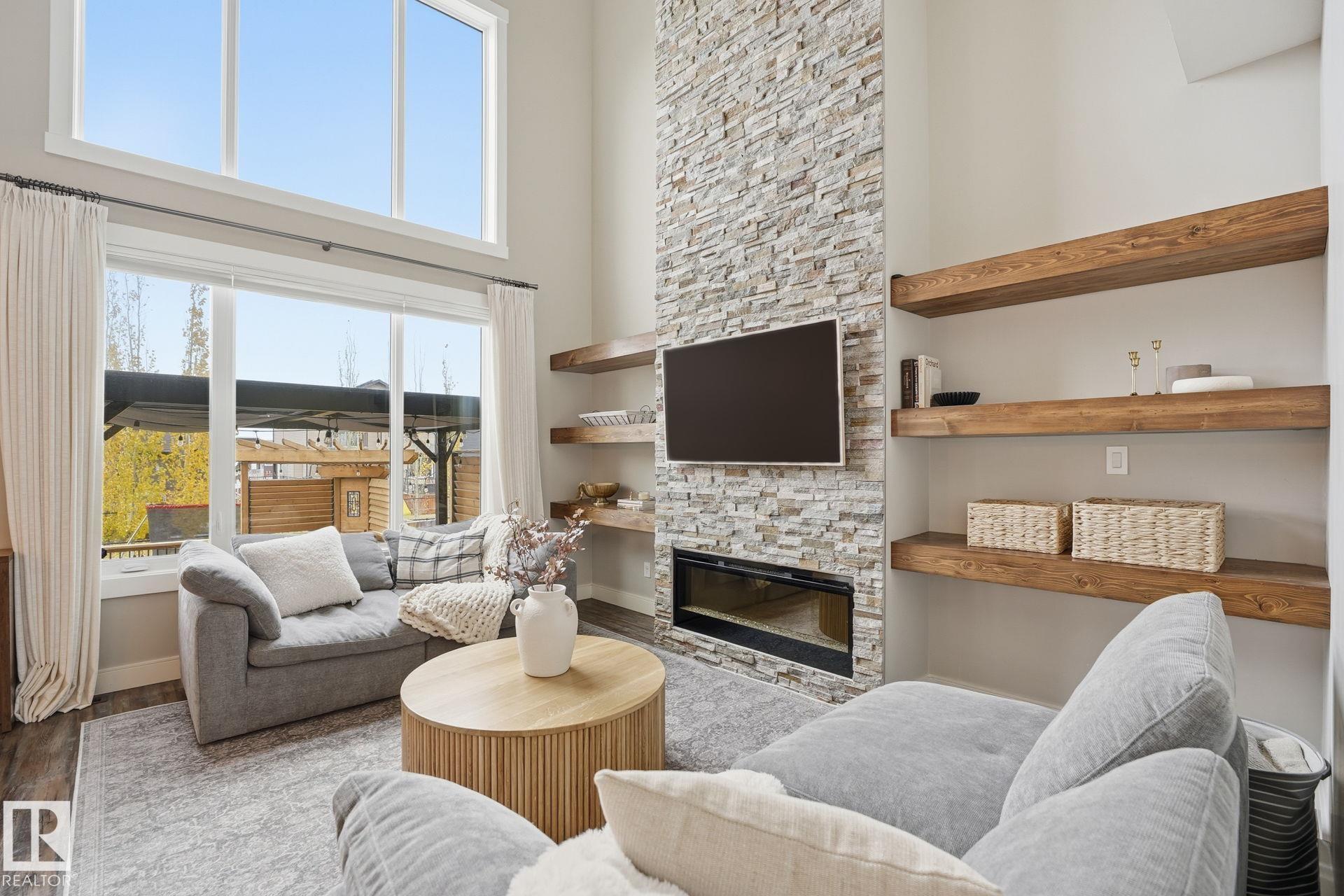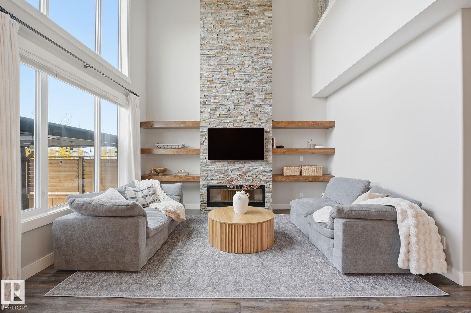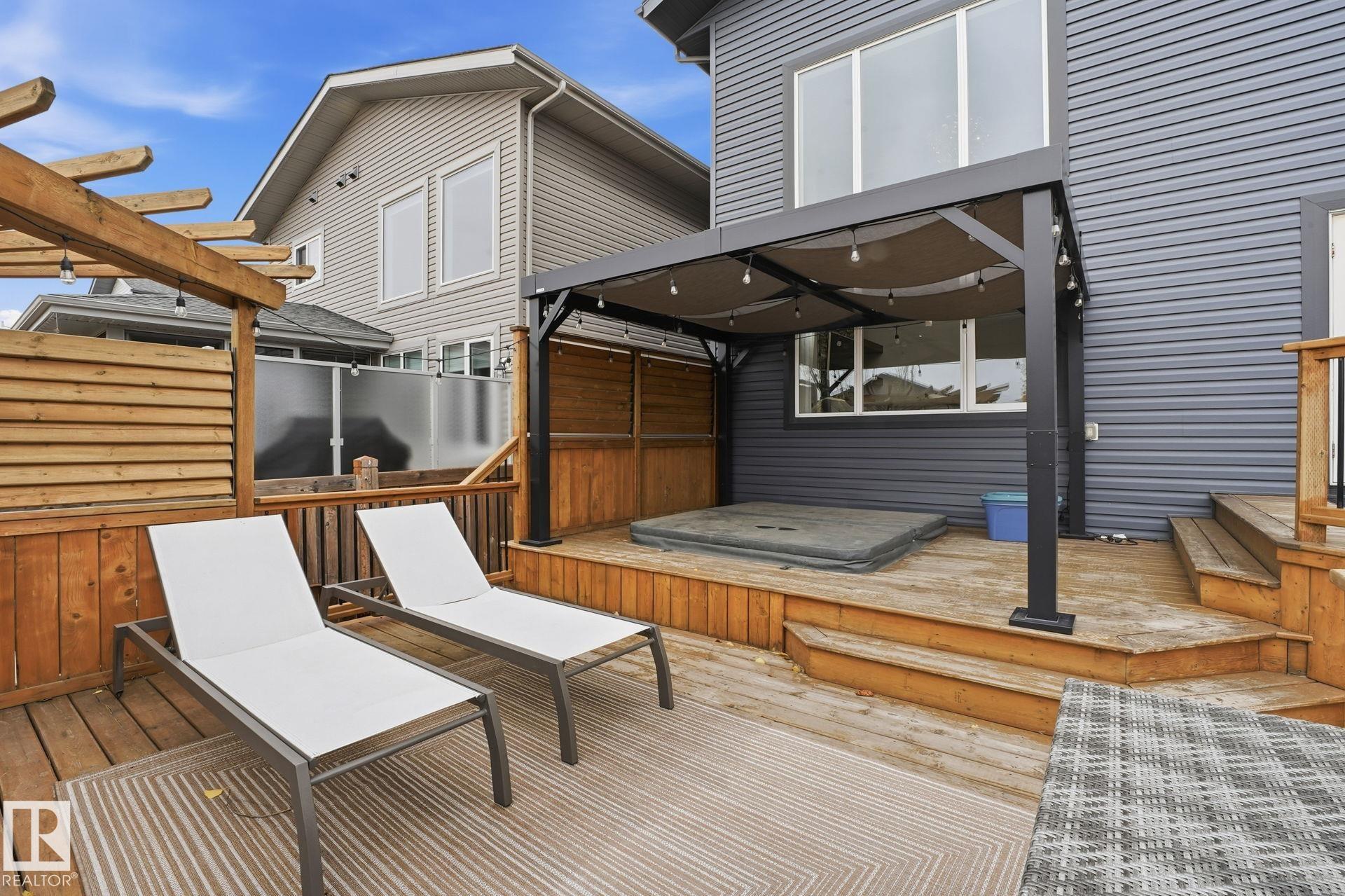 Tucked away on a quiet street, this architecturally distinct home blends thoughtful design with everyday function. Backing onto a beautiful multi-use path and steps from both Public and Catholic schools, it offers the perfect mix of privacy and community. Inside, soaring ceilings and oversized windows fill the open-concept main floor with natural light, showcasing the stone fireplace, coffered ceilings, and sleek quartz finishes. The layout includes 4 bedrooms, 4 bathrooms, a main-floor den, bonus room, and a fully finished basement. The massive triple-tandem garage features loft storage, an 18-ft door, and room for RV parking. The spa-inspired primary suite impresses with vaulted ceilings, electric blinds, a barn door, a walk-in shower with body jets, and a skylight that floods the ensuite with natural light. Outside, a multi-tiered deck with privacy walls and a hot tub extends the living space. Complete with durable vinyl plank flooring, designer lighting, gas range, gourmet fridge, and central air.