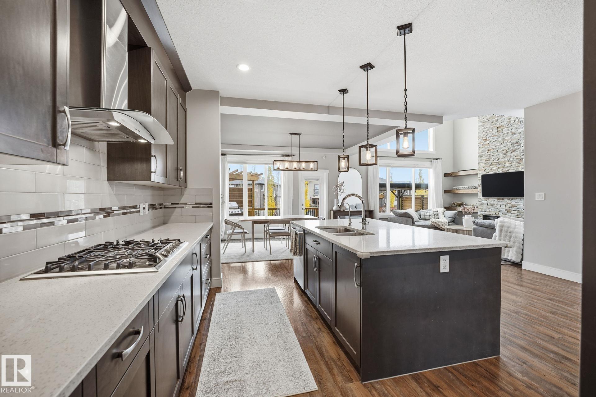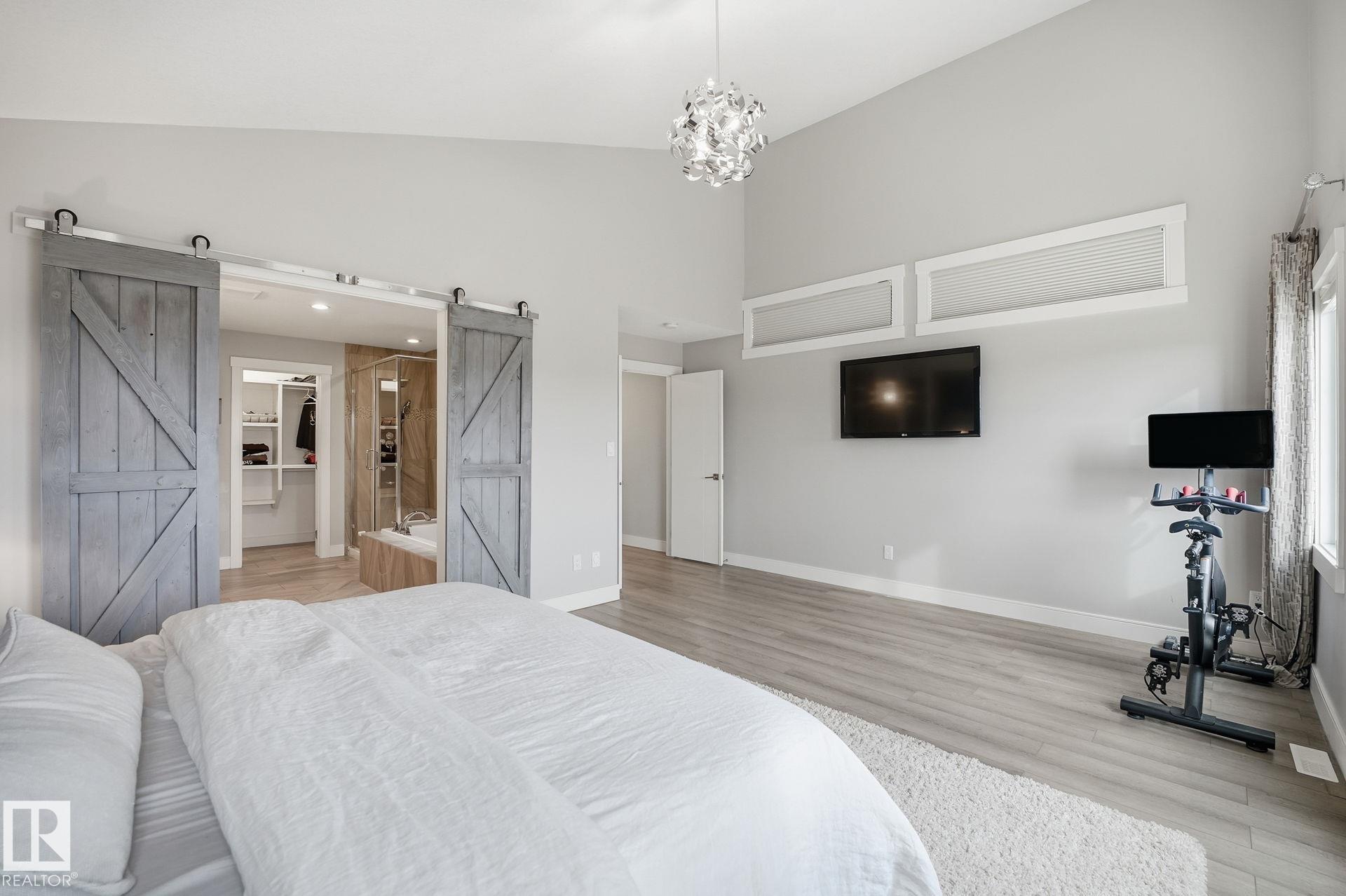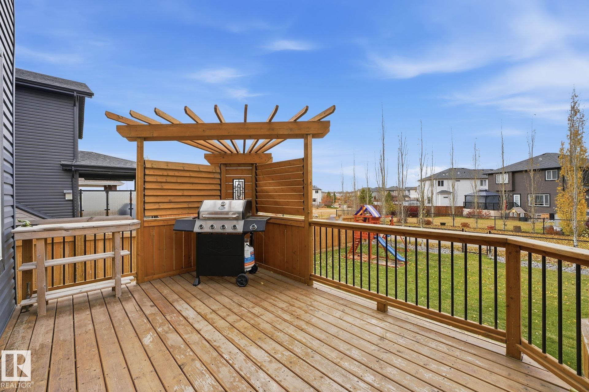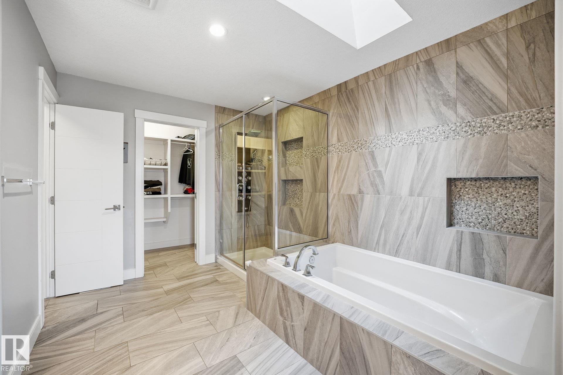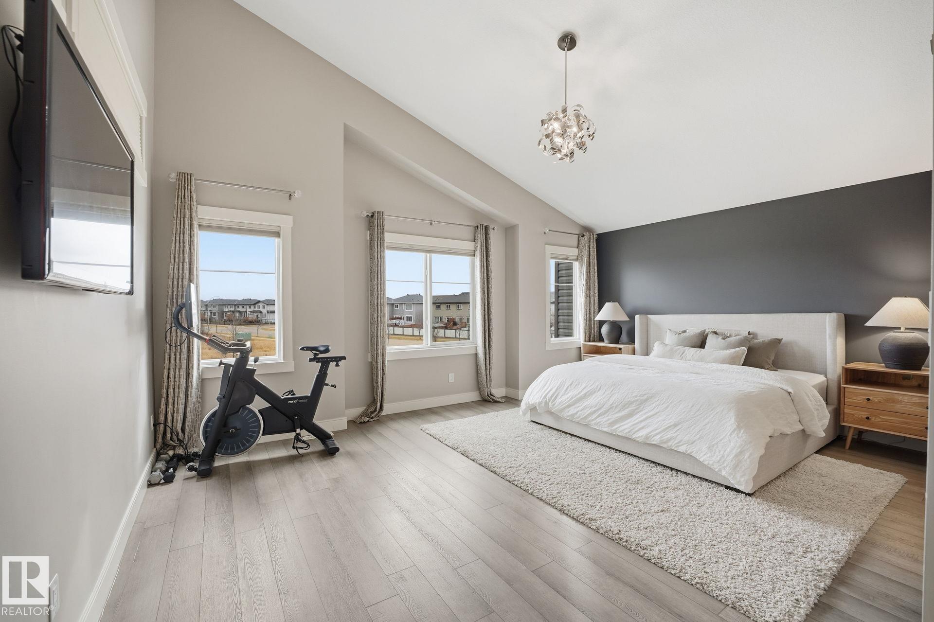 Tucked away on a quiet street, this architecturally distinct home blends thoughtful design with everyday function. Backing onto a beautiful multi-use path and steps from both Public and Catholic schools, it offers the perfect mix of privacy and community. Inside, soaring ceilings and oversized windows fill the open-concept main floor with natural light, showcasing the stone fireplace, coffered ceilings, and sleek quartz finishes. The layout includes 4 bedrooms, 4 bathrooms, a main-floor den, bonus room, and a fully finished basement. The massive triple-tandem garage features loft storage, an 18-ft door, and room for RV parking. The spa-inspired primary suite impresses with vaulted ceilings, electric blinds, a barn door, a walk-in shower with body jets, and a skylight that floods the ensuite with natural light. Outside, a multi-tiered deck with privacy walls and a hot tub extends the living space. Complete with durable vinyl plank flooring, designer lighting, gas range, gourmet fridge, and central air.