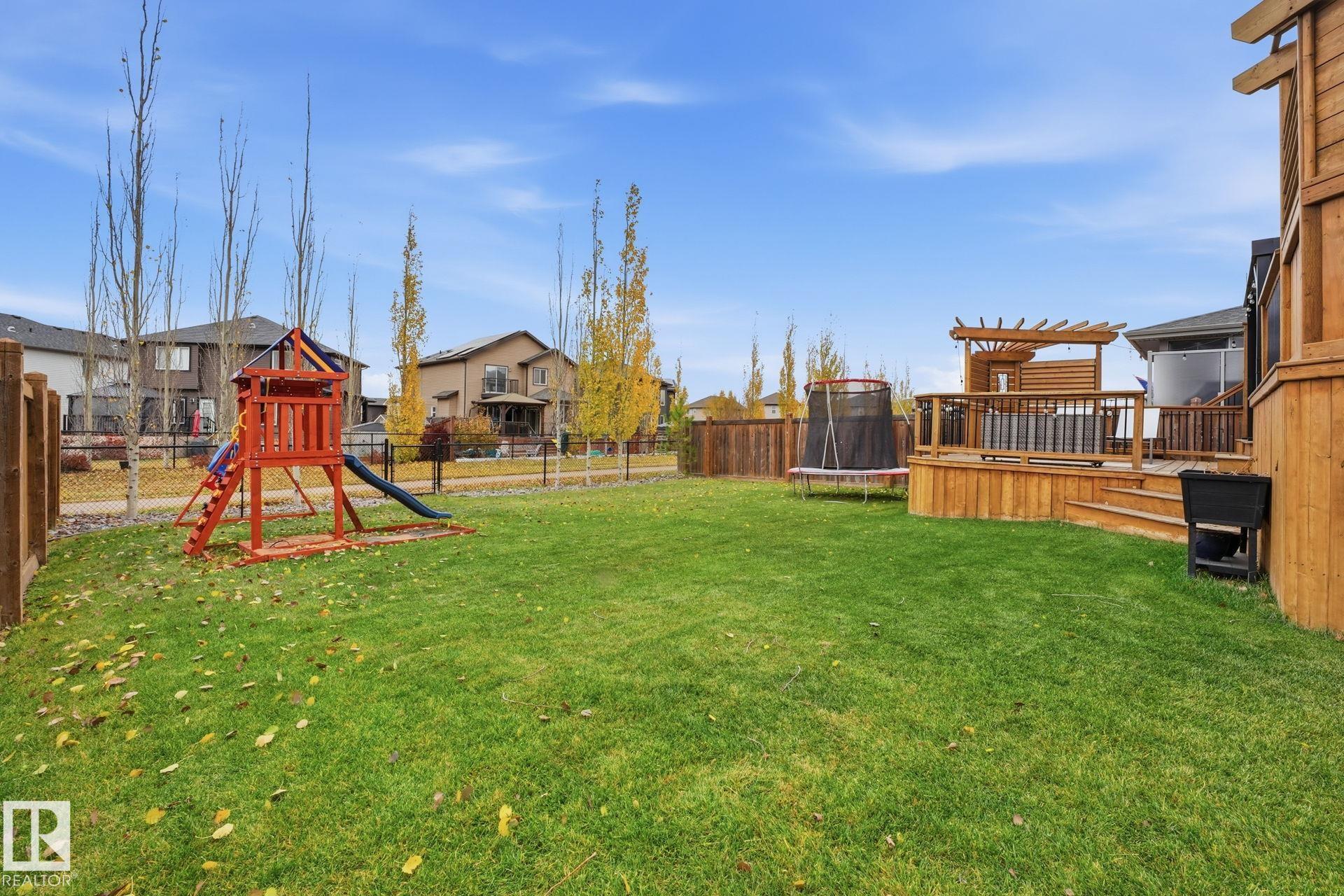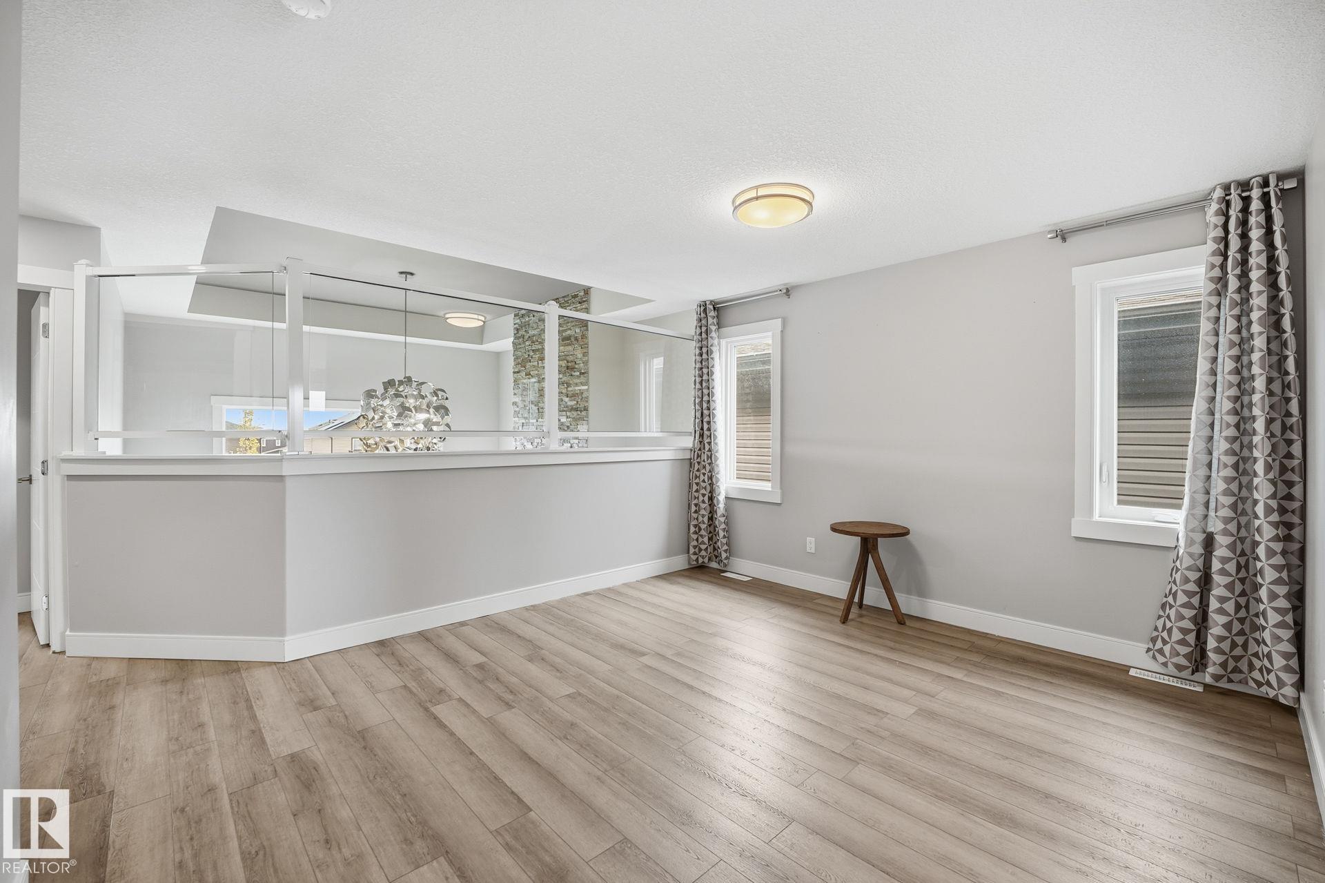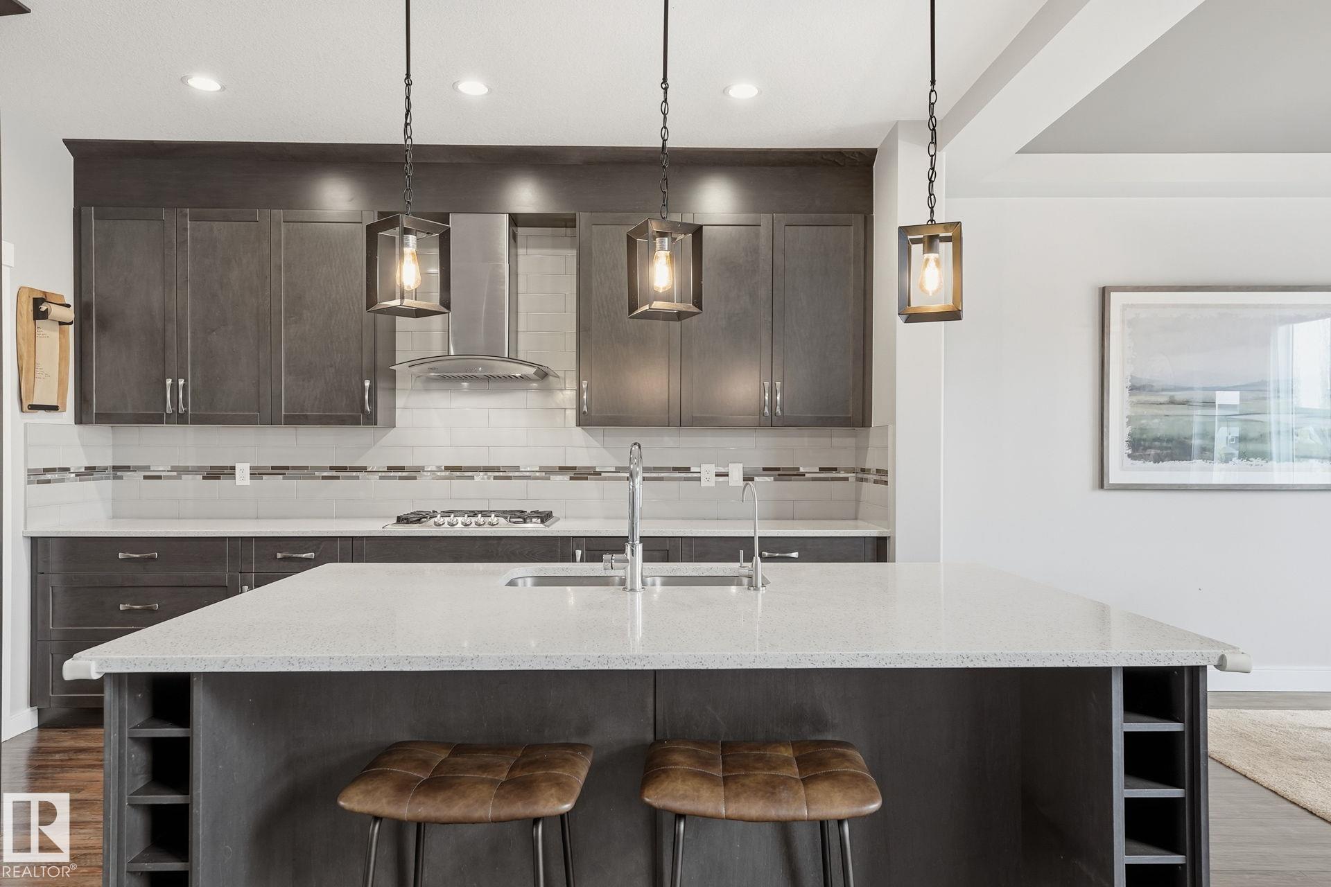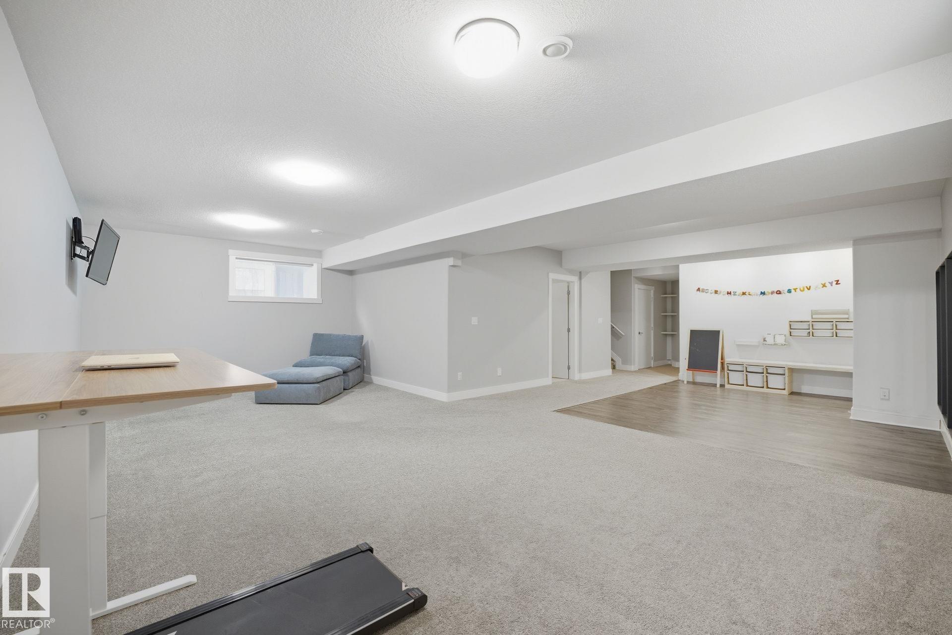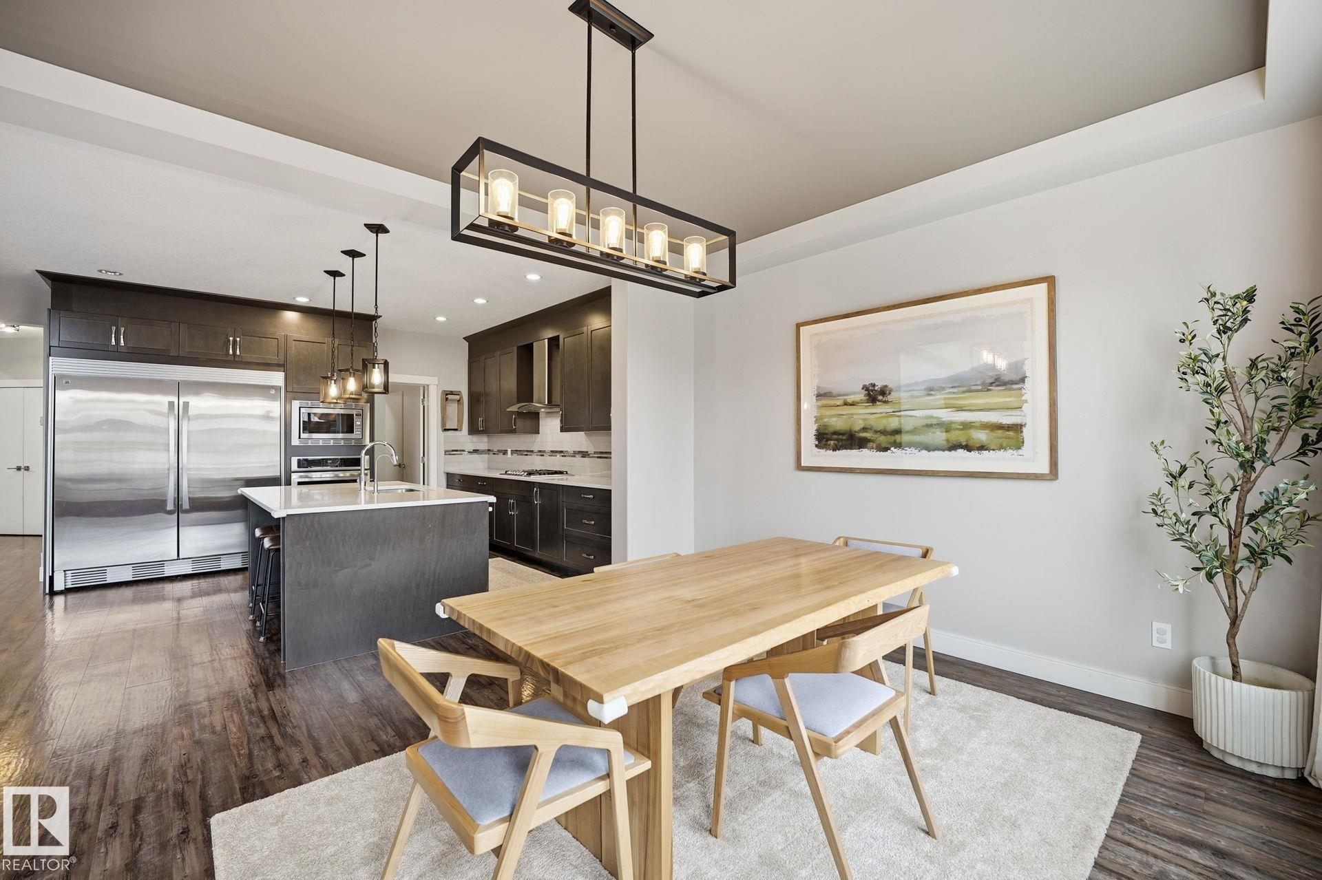Tucked away on a quiet street, this architecturally distinct home blends thoughtful design with everyday function. Backing onto a beautiful multi-use path and steps from both Public and Catholic schools, it offers the perfect mix of privacy and community. Inside, soaring ceilings and oversized windows fill the open-concept main floor with natural light, showcasing the stone fireplace, coffered ceilings, and sleek quartz finishes. The layout includes 4 bedrooms, 4 bathrooms, a main-floor den, bonus room, and a fully finished basement. The massive triple-tandem garage features loft storage, an 18-ft door, and room for RV parking. The spa-inspired primary suite impresses with vaulted ceilings, electric blinds, a barn door, a walk-in shower with body jets, and a skylight that floods the ensuite with natural light. Outside, a multi-tiered deck with privacy walls and a hot tub extends the living space. Complete with durable vinyl plank flooring, designer lighting, gas range, gourmet fridge, and central air.