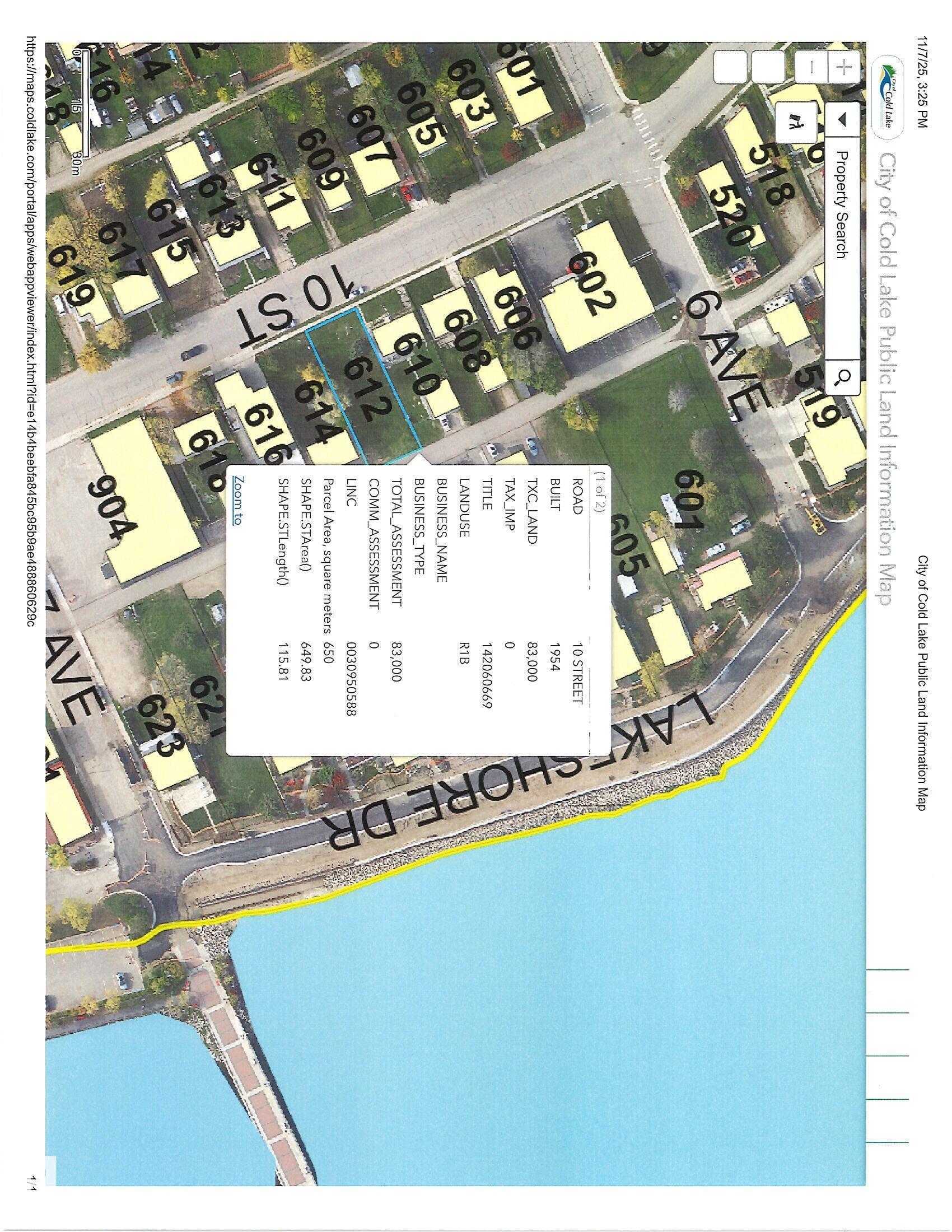 Great opportunity in the heart of Cold Lake North! This vacant lot, zoned R1B, offers 650 square meters of potential for a new build in an established neighbourhood with only a few steps away from the lake. Whether you're a builder, investor, or future homeowner, this unique lot is centrally located with convenient access to schools, shopping, the Cold Lake Marina, and Kinosoo Beach. The property backs onto an paved alley way, making it ideal for those planning a detached garage with a custom home with rear access and/or a great location for a business. No timeline to build, you can buy now and plan for the future. Don?t miss out?this lot is priced to sell and ready for your ideas!