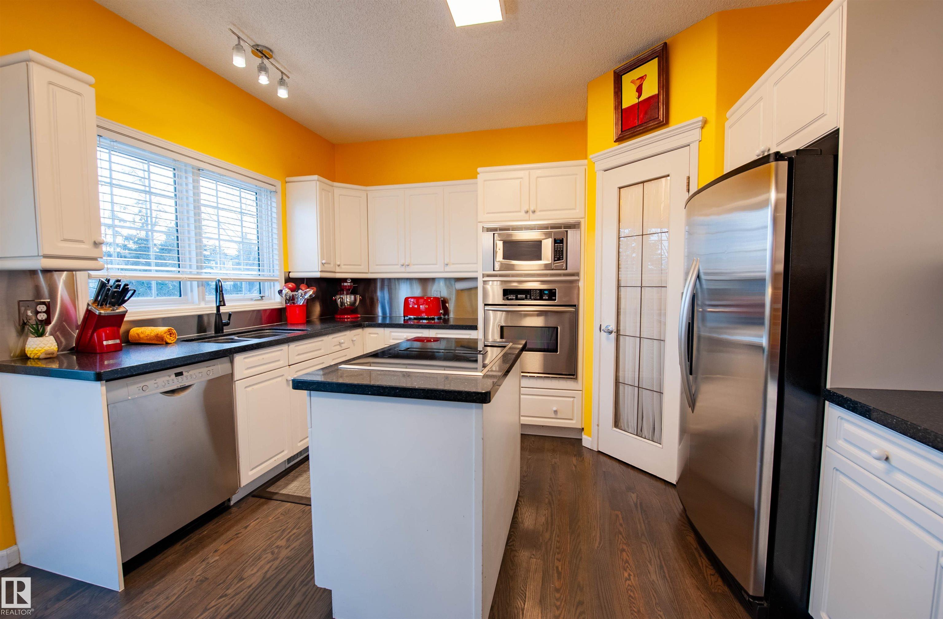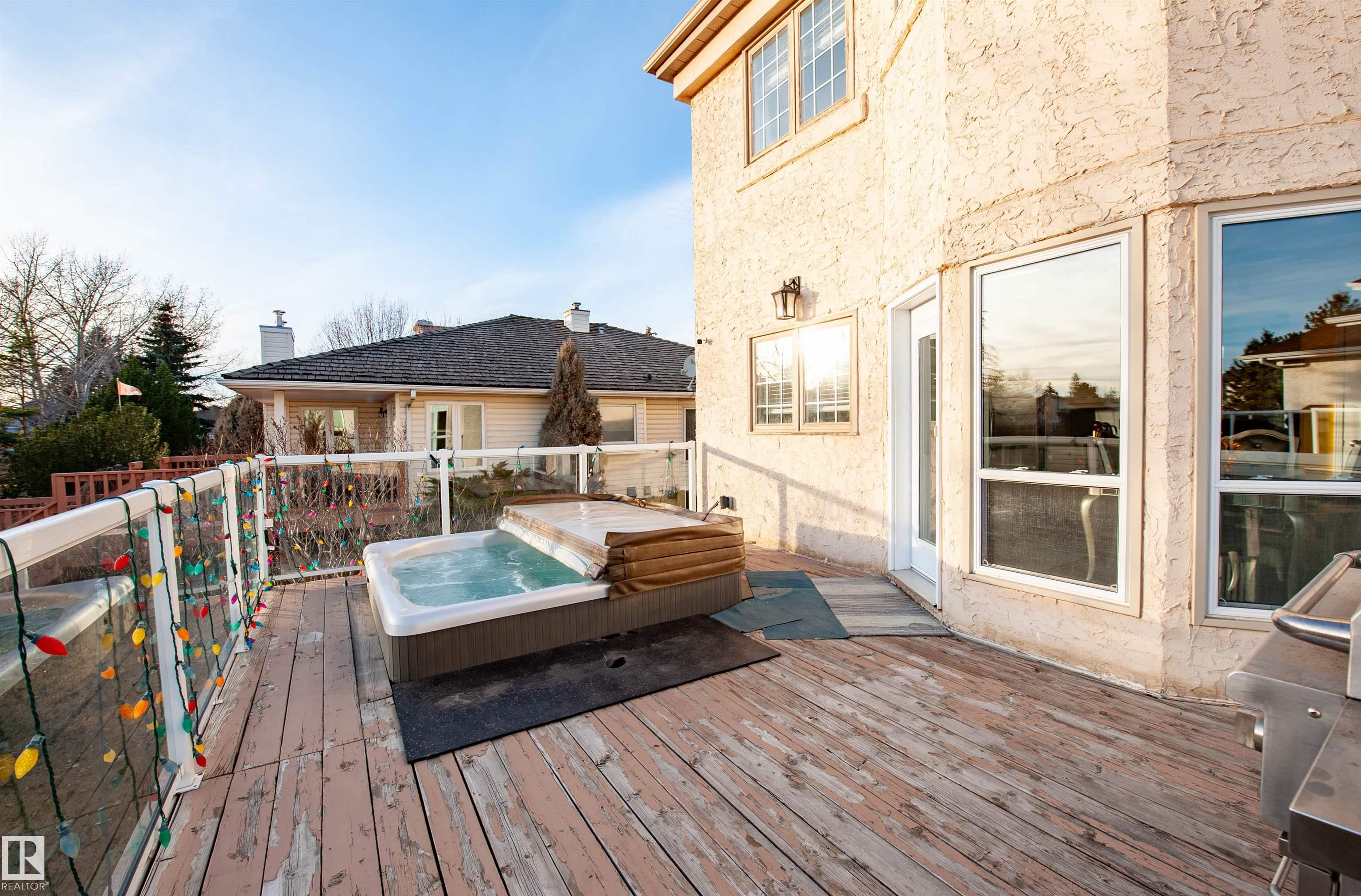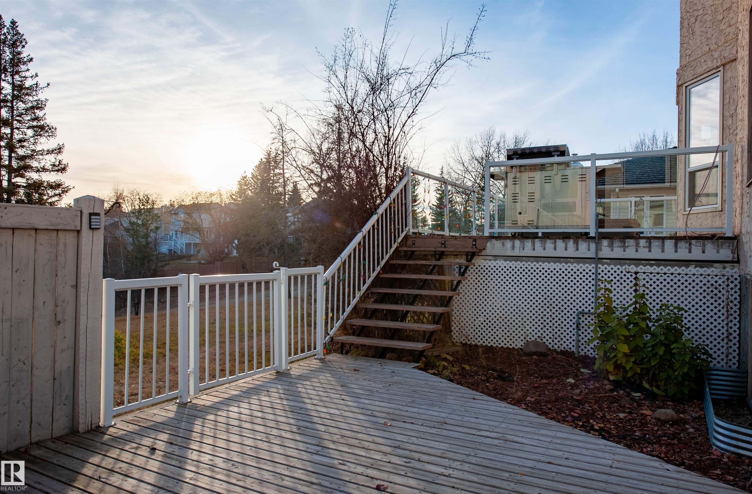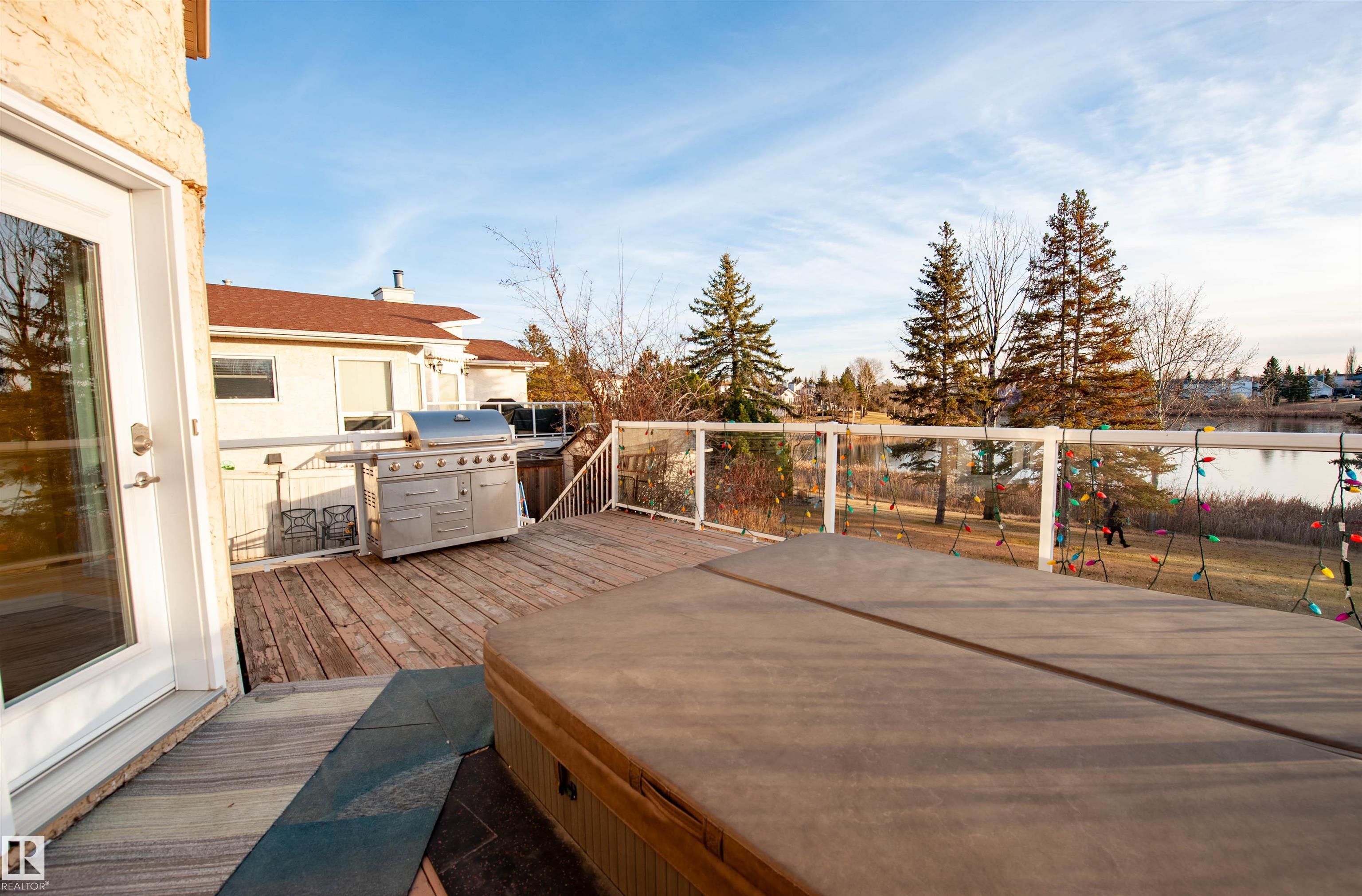 Live the Good Life in Larkspur! This exceptional home is in a quiet cul-de-sac close to schools, shopping, golf, & Whitemud Dr. The south-facing backyard offers a gorgeous Lake view! Enjoy peaceful scenery year-round. Inside, the bright layout features a formal family rm. hardwood floors, a living room with a gas fireplace, a beautifully updated kitchen with granite counters, JennAir cooktop with downdraft, built-in oven & a breakfast nook overlooking the water! The main floor laundry room features an Extra-Large W/D. Upstairs, a rare 4-bedroom layout, including a king-sized primary suite with triple-glazed windows, his-and-hers closets, & a spa-like ensuite. The fully finished 9' tall basement adds 2 more bedrooms (6 total), a full bath. Recently installed: a New High-Efficiency Furnace, On-Demand Hot Water, a Water Softener, & Plush Carpet. Outside, relax in your Hot-Tub & enjoy the view from the 2-tier deck, plus extra RV parking. Some pics virtually staged. Visit REALTORŪ website for more info.