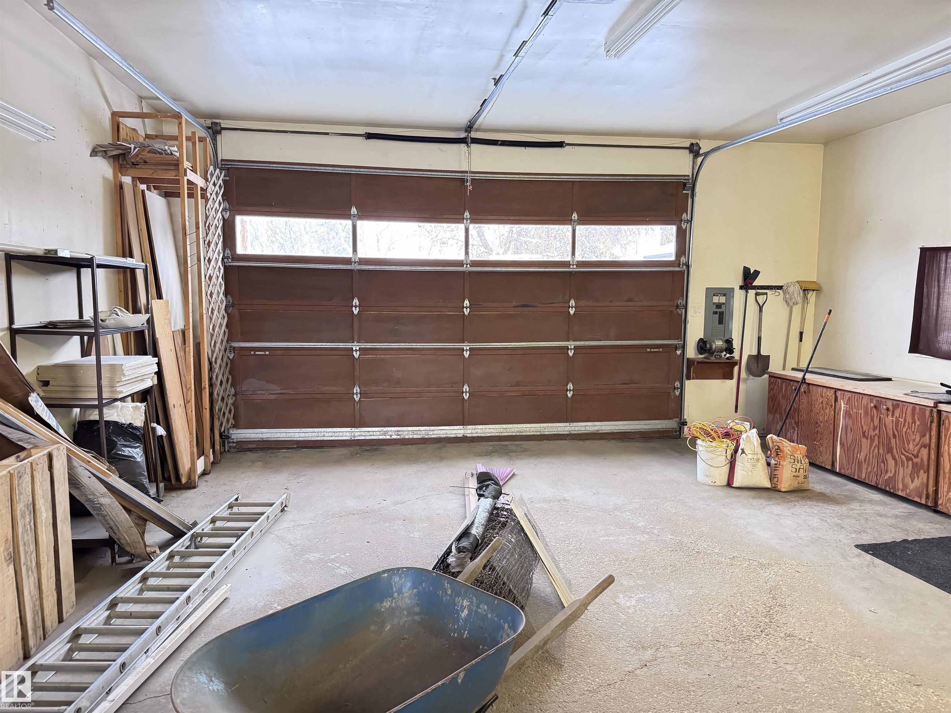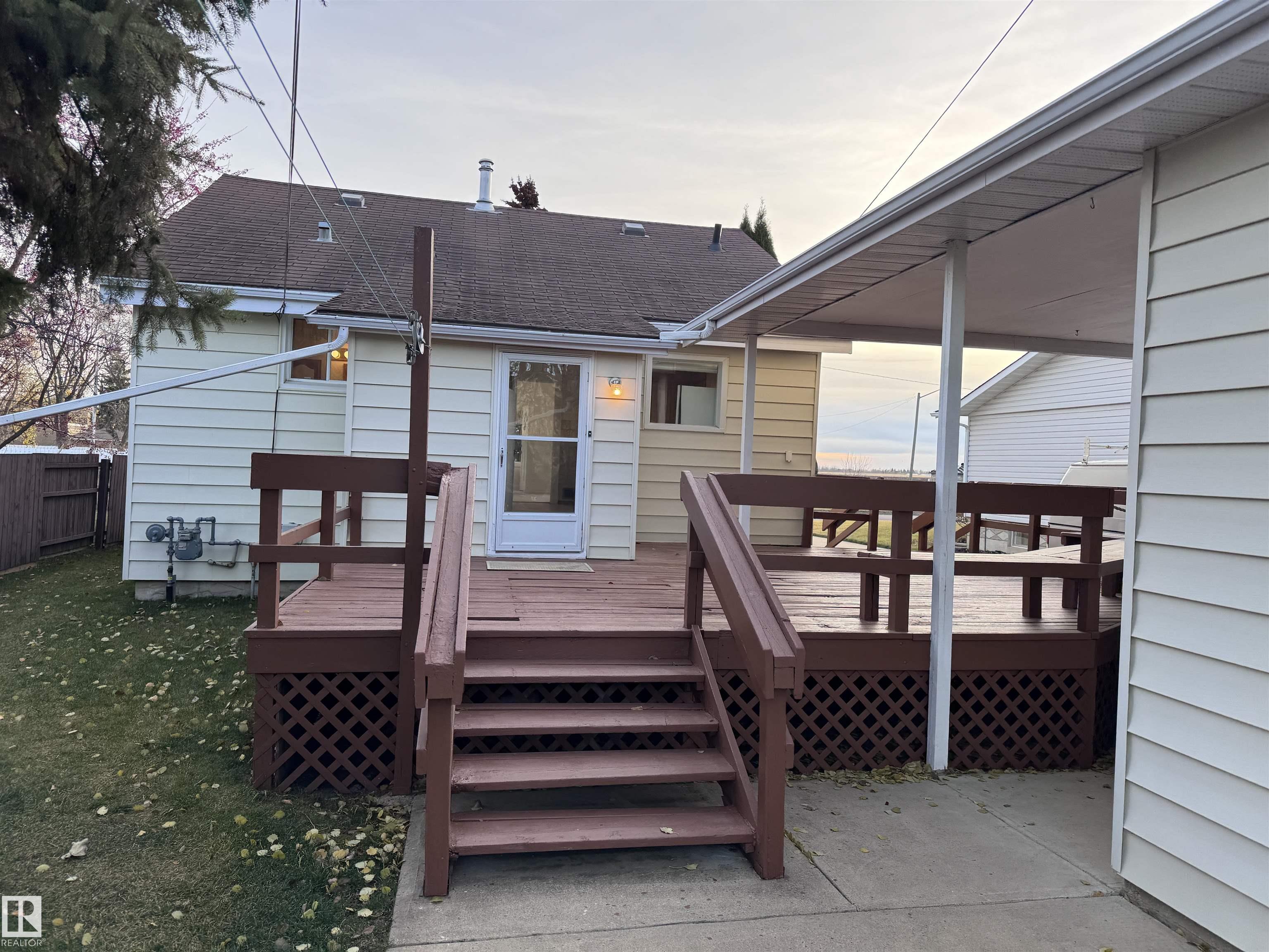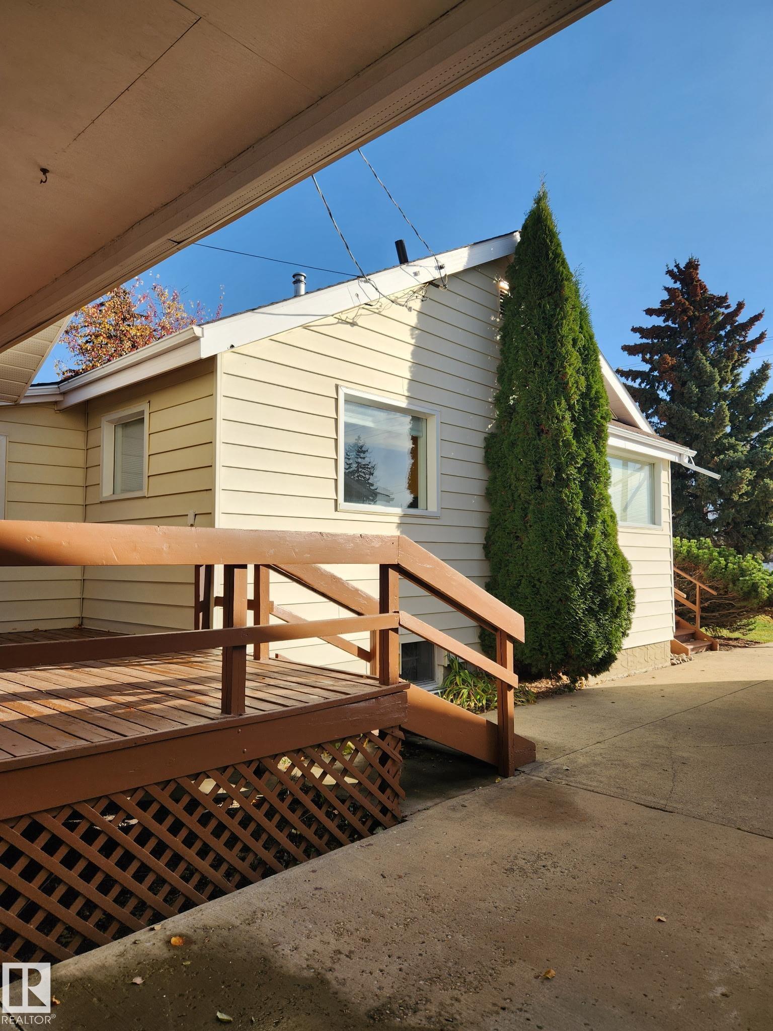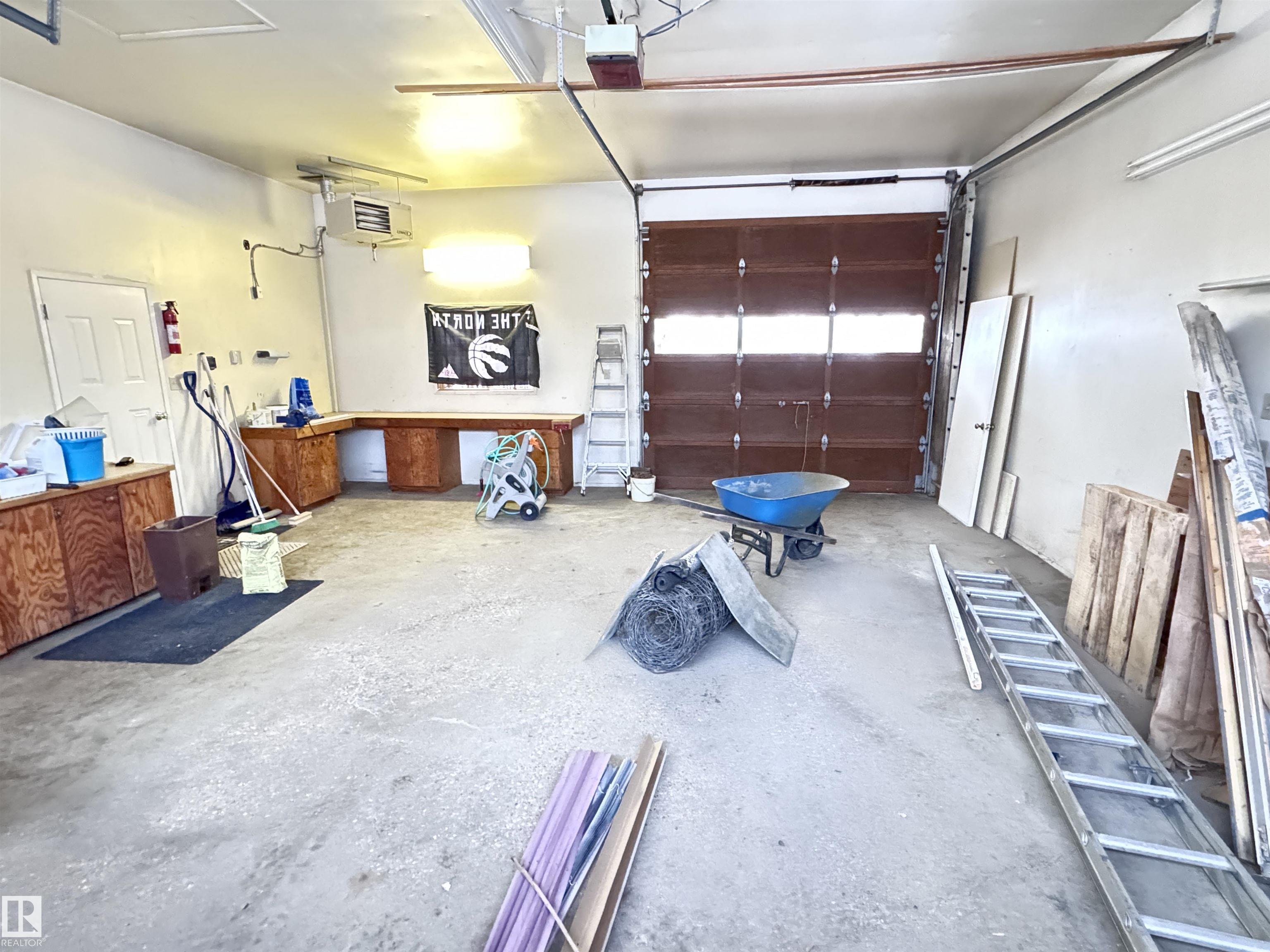 Tidy and full of character is this 900 sq.ft. bungalow in the fabulous Southview area of Westlock. Oak kitchen cabinets with sunshine box light & built-in microwave. Bright living room is right-sized & has a garden window. 2+2 bedrooms. Bright front den. Main floor laundry at rear entrance. Full bathroom is attractively appointed & has a jet-soaker tub. Basement features a 3-piece bathroom, rumpus room, 2 bedrooms & storage. Massive 26x24 heated, lined, 12' high wall, 10' high doors garage with carport on the front of it. Overhead doors on front and rear of garage (drive right through). Covered deck is large and will be repaired to ensure the next summer BBQ is enjoyable. Super-sized driveway in front, plus double parkpad at rear. 2 blocks to downtown core. 2 blocks to Westlock Rotary Spirit Centre (multi-plex sports facility). Close to schools, playground & grocery store. 2012 Hot Water Tank, Newer HE furnace.