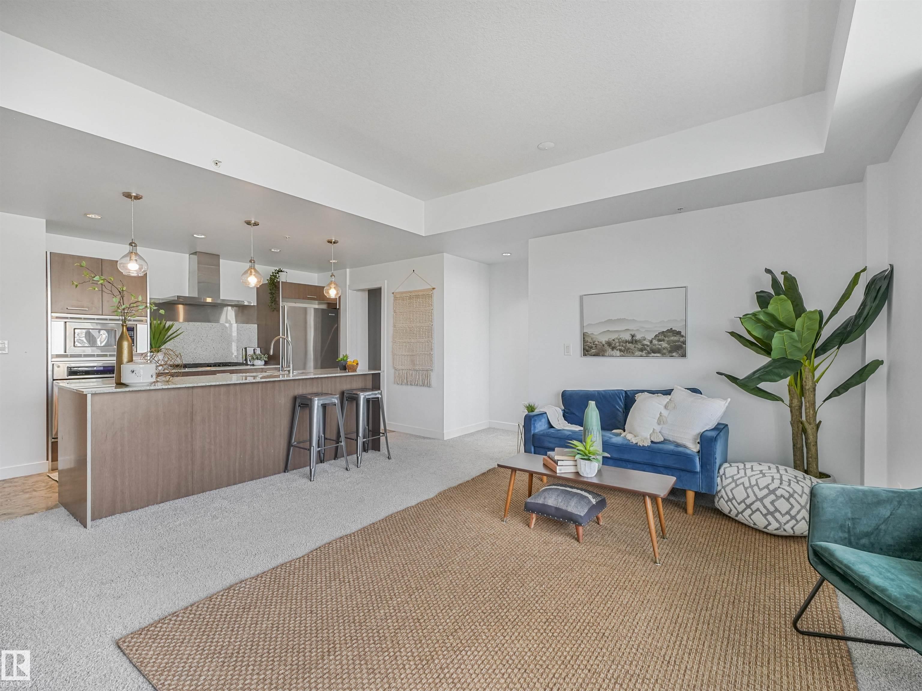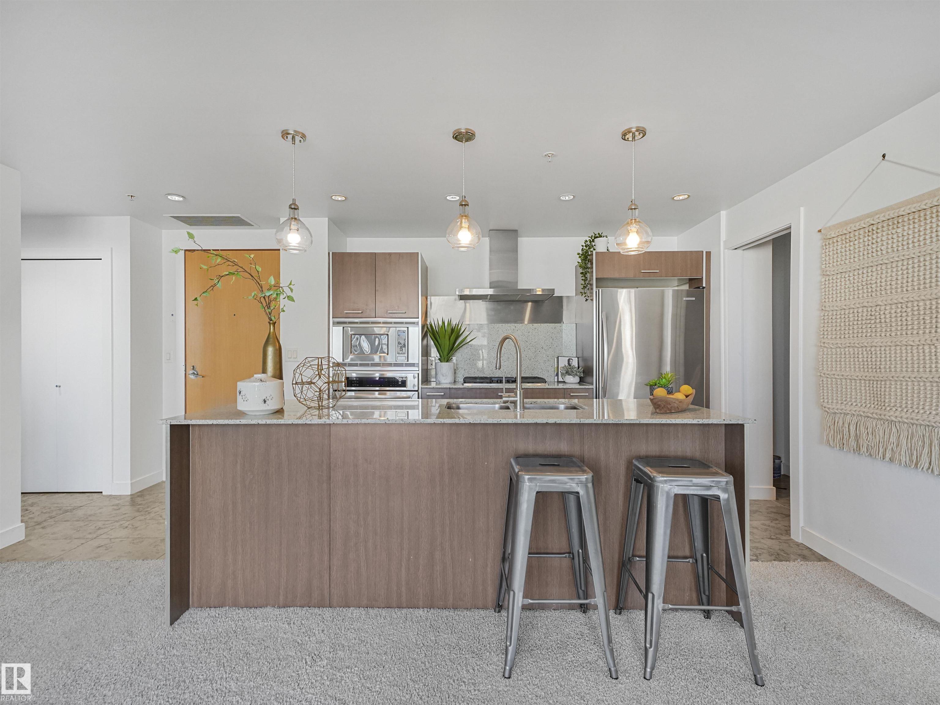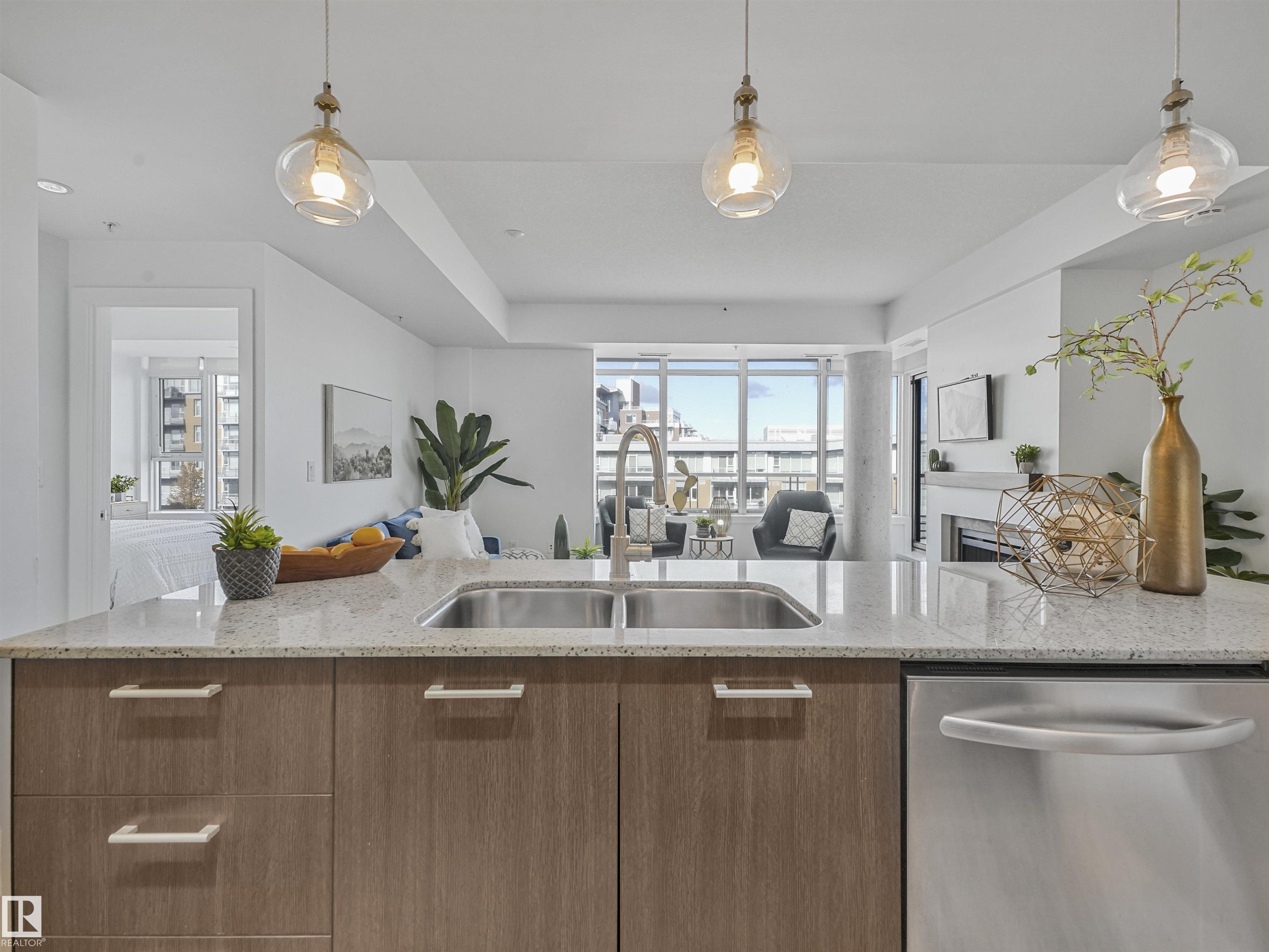Welcome to this stylish 2 bed, 2 bath condo in the heart of Century Park! This bright, open-concept unit features wall-to-wall windows, a fireplace, and a private balcony with a gas BBQ hookup overlooking the serene courtyard. The gourmet kitchen is a chef?s dream with granite countertops, built-in microwave, oven, gas stovetop, and a large island. The luxurious primary suite boasts a 5-piece ensuite with marble tile, a soaker tub, and double vanity. Enjoy the convenience of titled underground parking and a separate titled storage cage. Building amenities include a fitness centre and ALL UTILITIES covered in condo fees. Just steps to the LRT, Century Park shopping plaza, and minutes to Calgary Trail and South Edmonton Common ? this location has it all!