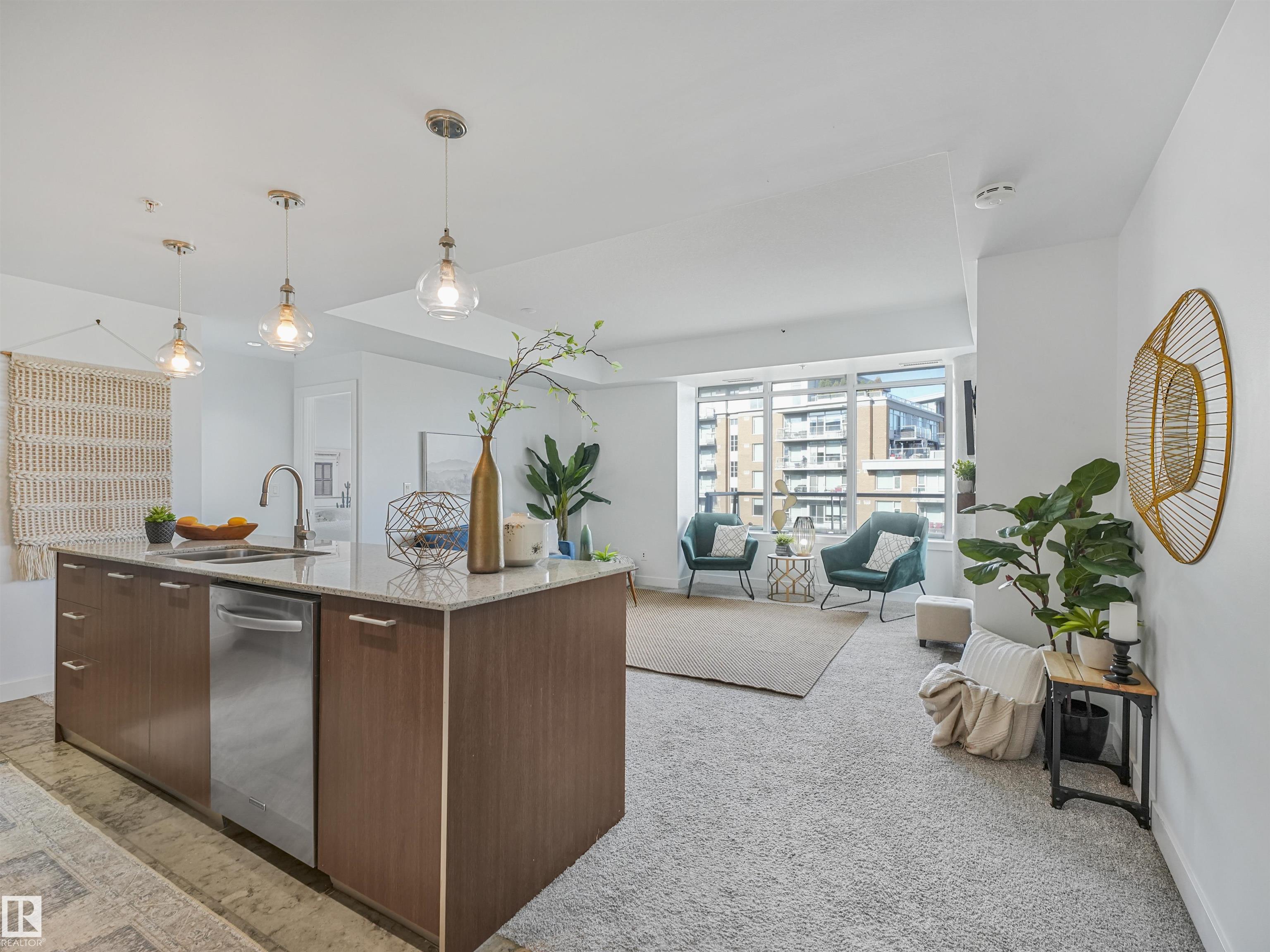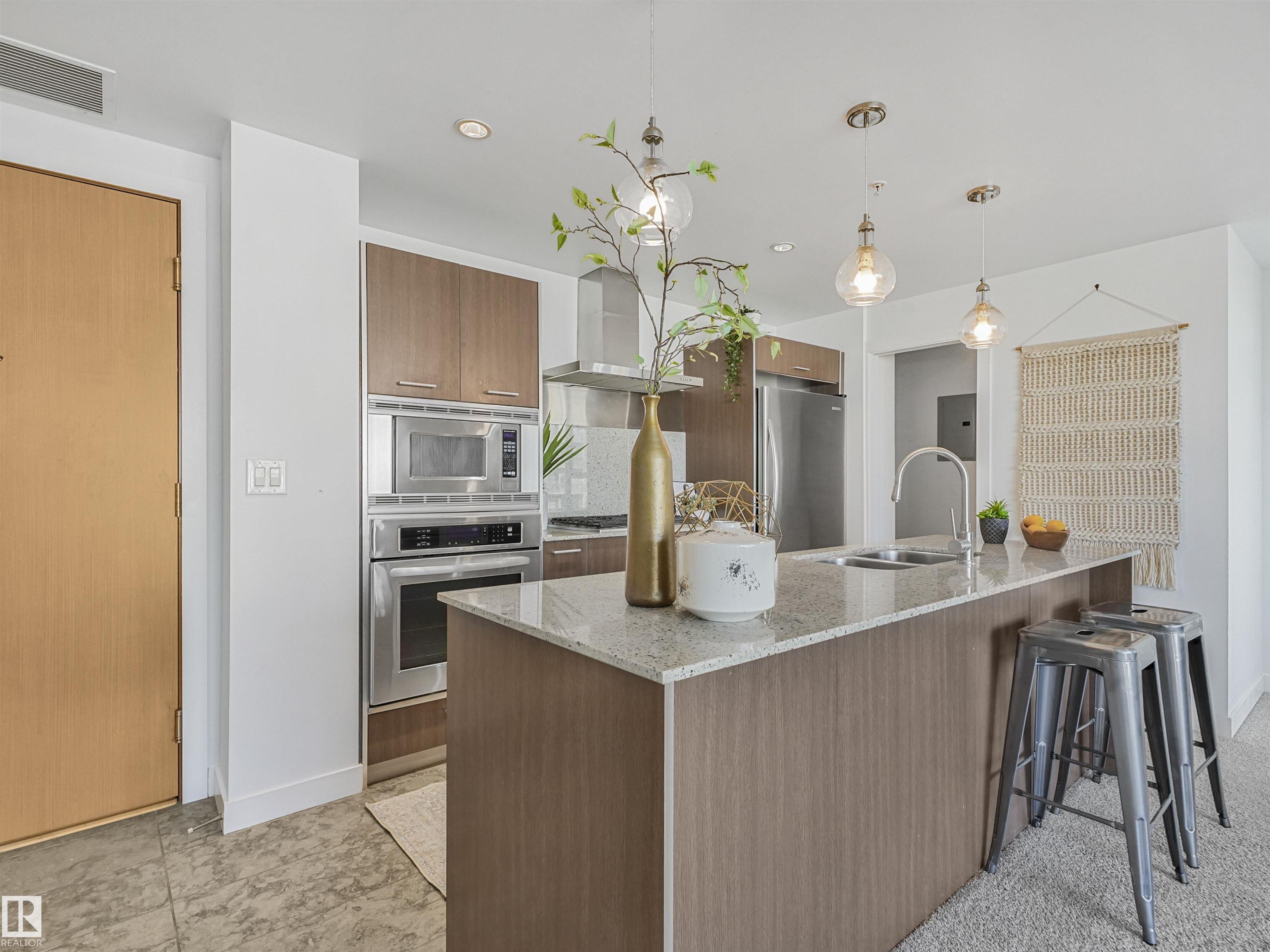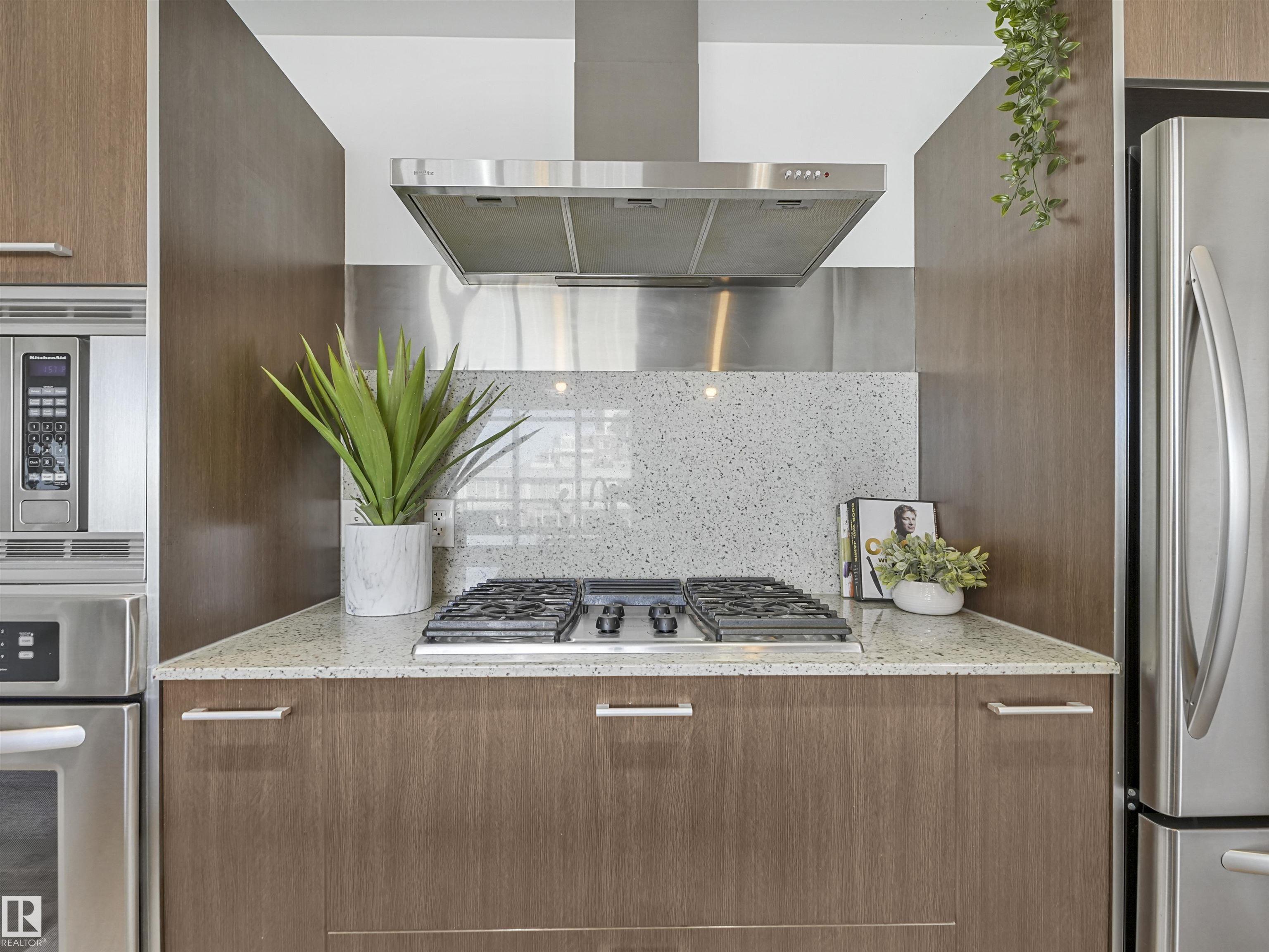 Welcome to this stylish 2 bed, 2 bath condo in the heart of Century Park! This bright, open-concept unit features wall-to-wall windows, a fireplace, and a private balcony with a gas BBQ hookup overlooking the serene courtyard. The gourmet kitchen is a chef?s dream with granite countertops, built-in microwave, oven, gas stovetop, and a large island. The luxurious primary suite boasts a 5-piece ensuite with marble tile, a soaker tub, and double vanity. Enjoy the convenience of titled underground parking and a separate titled storage cage. Building amenities include a fitness centre and ALL UTILITIES covered in condo fees. Just steps to the LRT, Century Park shopping plaza, and minutes to Calgary Trail and South Edmonton Common ? this location has it all!