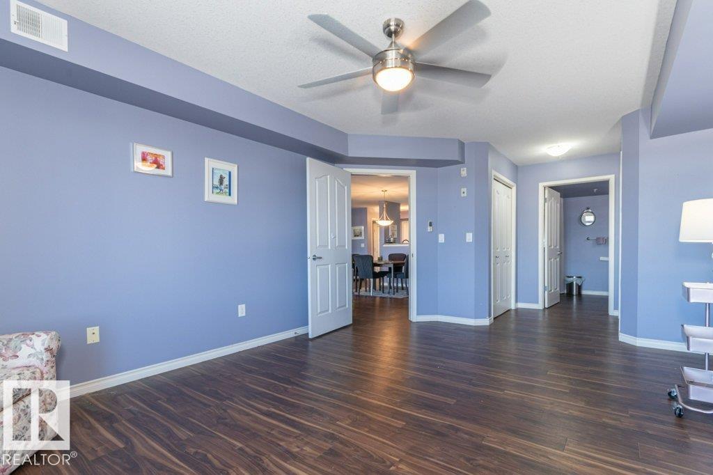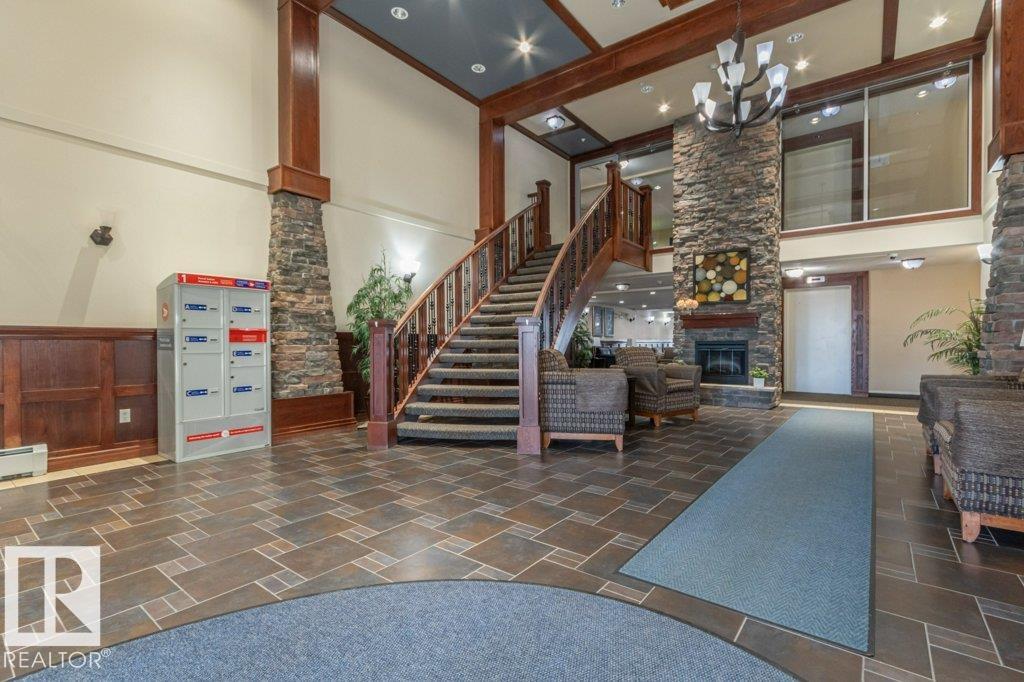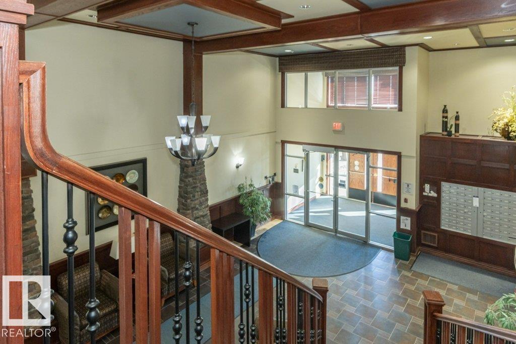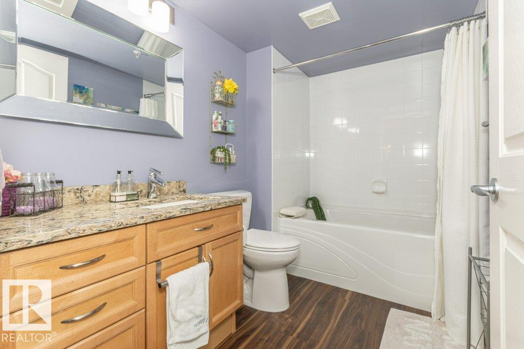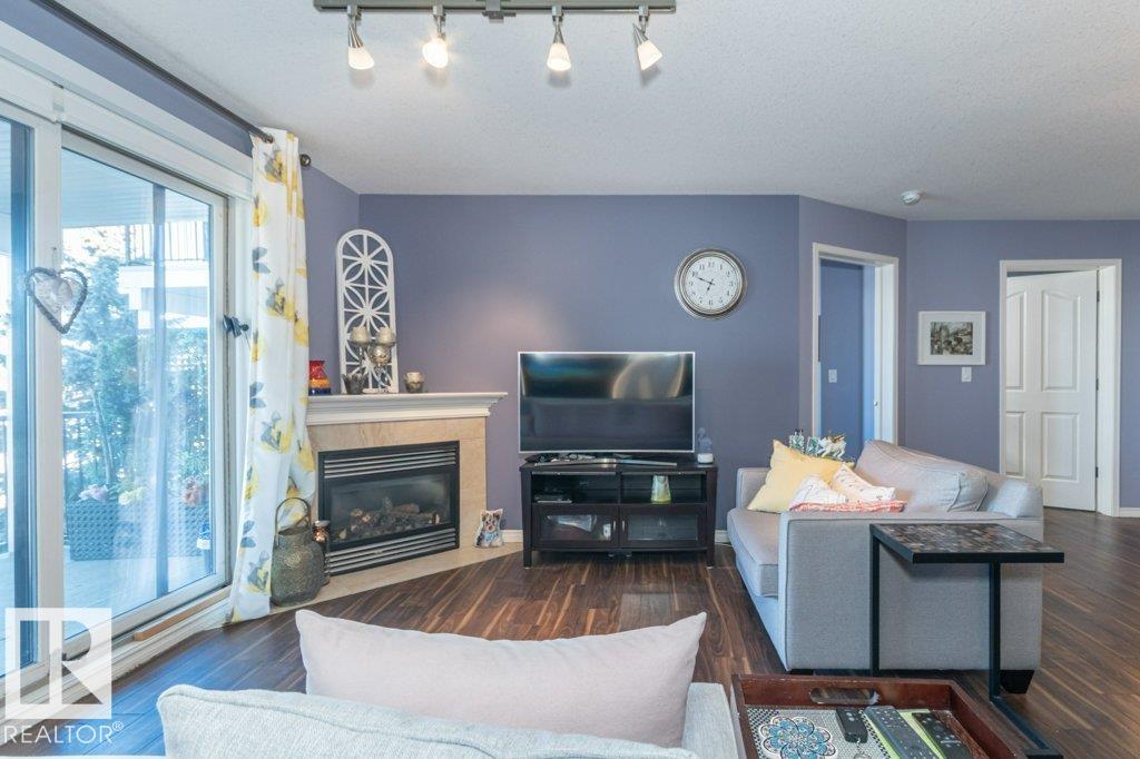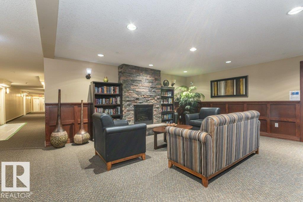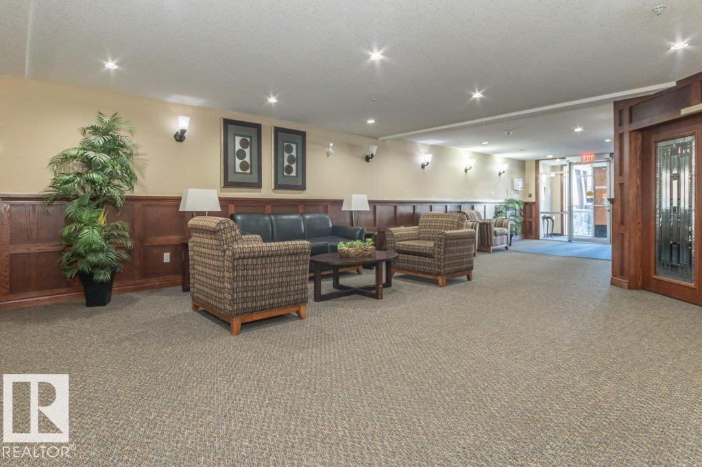 Welcome to Glastonbury Village, an established adult living (18+) community conveniently located on Edmonton?s west side steps from public transportation, parks, trails, shopping and more! The building welcomes you with a grand foyer that leads to the social room on the main level, and up the curved stairs to the guest suite + fitness room on the 2nd level. This updated and loved home feat. a very desirable 2 bdrm PLUS den layout! Home features include an open plan w/updated vinyl plank floors, warm colours, and renovated kitchen w/newer SS appl. (inc. full-size fridge), updated cabinets, stone counters + tile backsplash. There are 2 bdrms that are a very nice size, with the master suite featuring his + her closets and a 3pc ensuite w/large walk-in shower. Completing the plan is a spacious living/dining area w/corner gas F/P, den/office + laundry/storage room. West facing balcony with sunset and community views. Home comes with A/C, 1 titled U/G parking stall and storage cage. Well managed building.