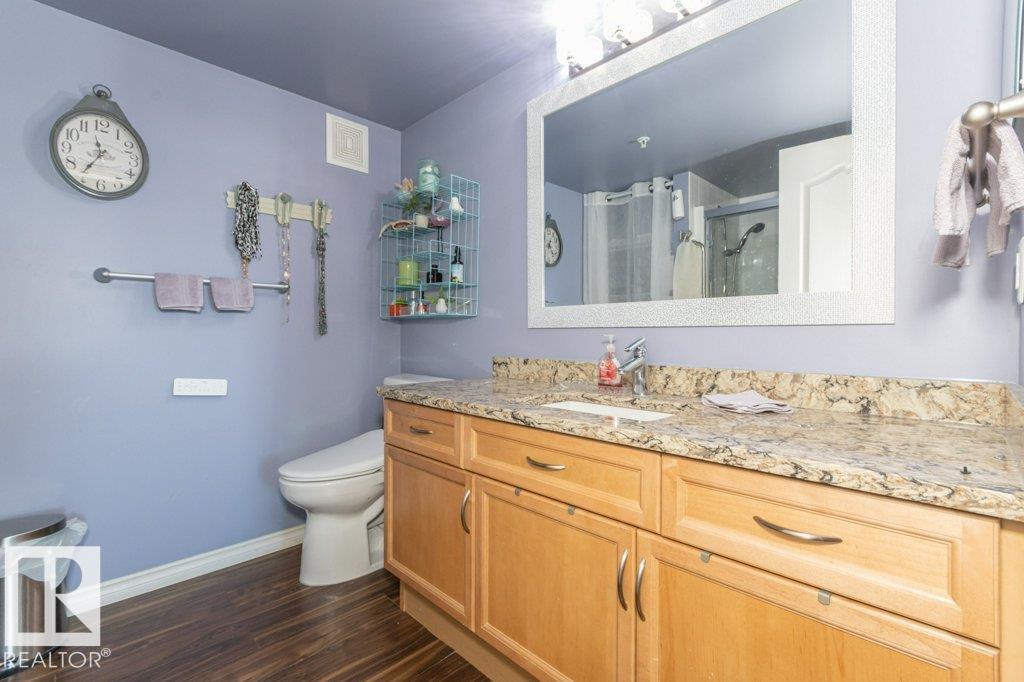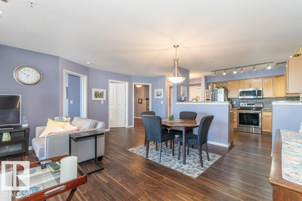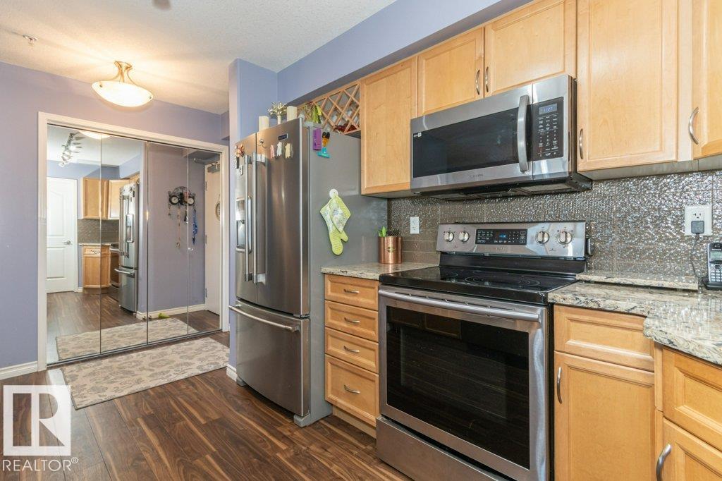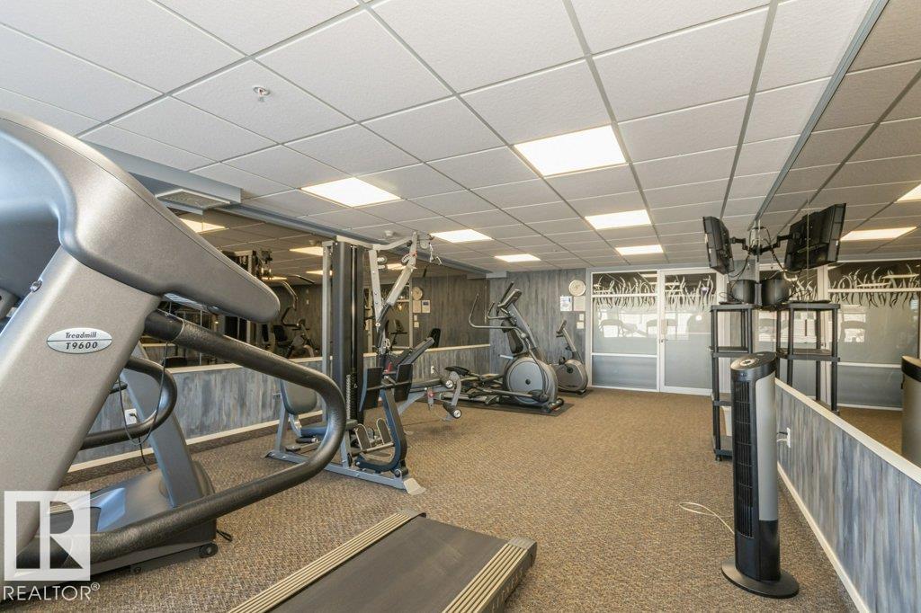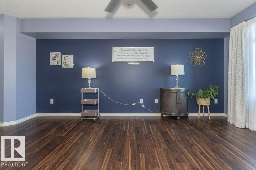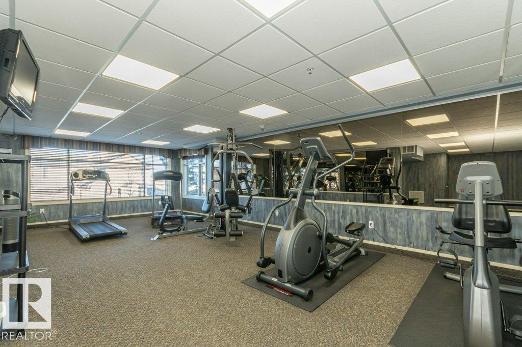 Welcome to Glastonbury Village, an established adult living (18+) community conveniently located on Edmonton?s west side steps from public transportation, parks, trails, shopping and more! The building welcomes you with a grand foyer that leads to the social room on the main level, and up the curved stairs to the guest suite + fitness room on the 2nd level. This updated and loved home feat. a very desirable 2 bdrm PLUS den layout! Home features include an open plan w/updated vinyl plank floors, warm colours, and renovated kitchen w/newer SS appl. (inc. full-size fridge), updated cabinets, stone counters + tile backsplash. There are 2 bdrms that are a very nice size, with the master suite featuring his + her closets and a 3pc ensuite w/large walk-in shower. Completing the plan is a spacious living/dining area w/corner gas F/P, den/office + laundry/storage room. West facing balcony with sunset and community views. Home comes with A/C, 1 titled U/G parking stall and storage cage. Well managed building.