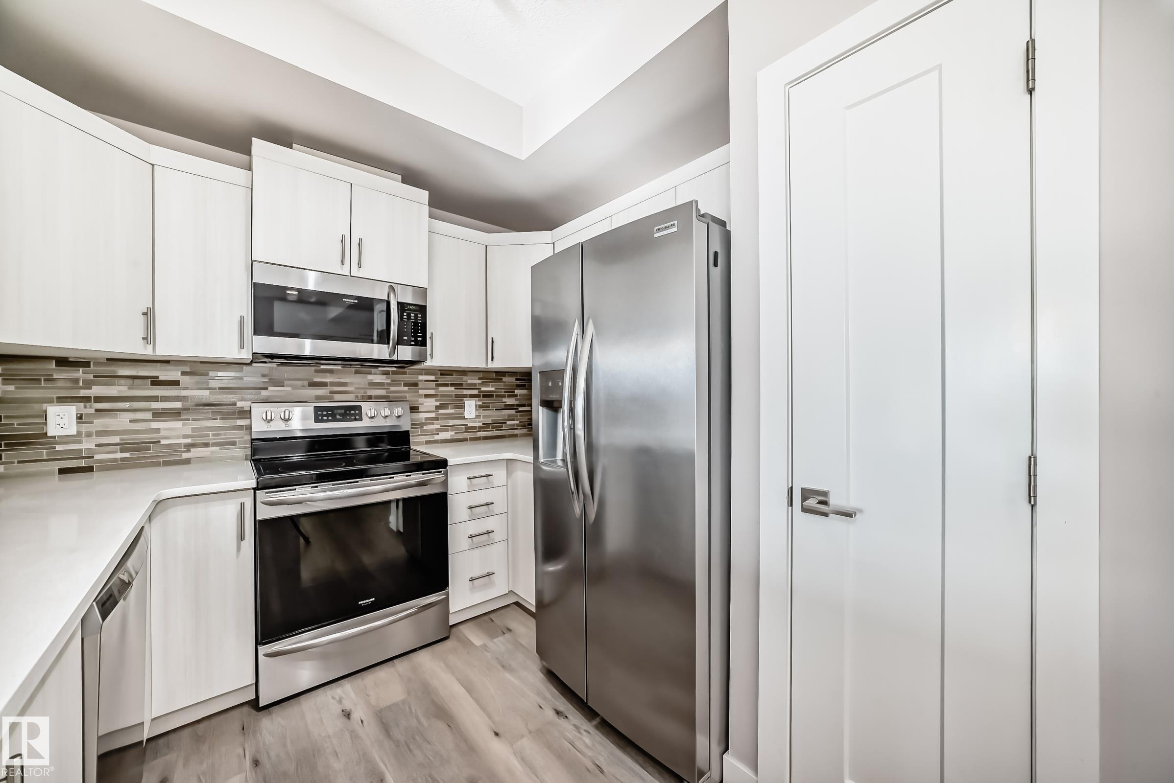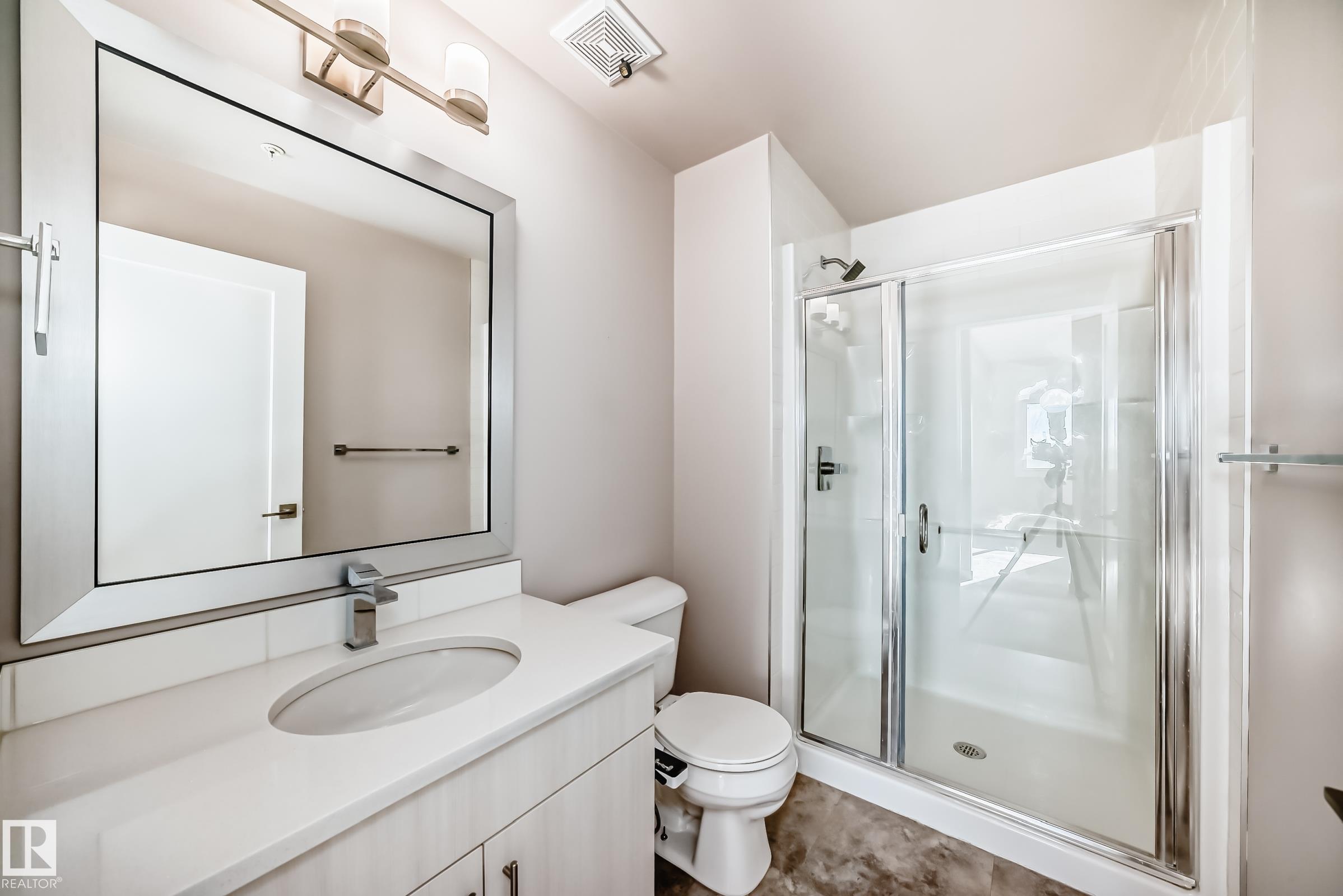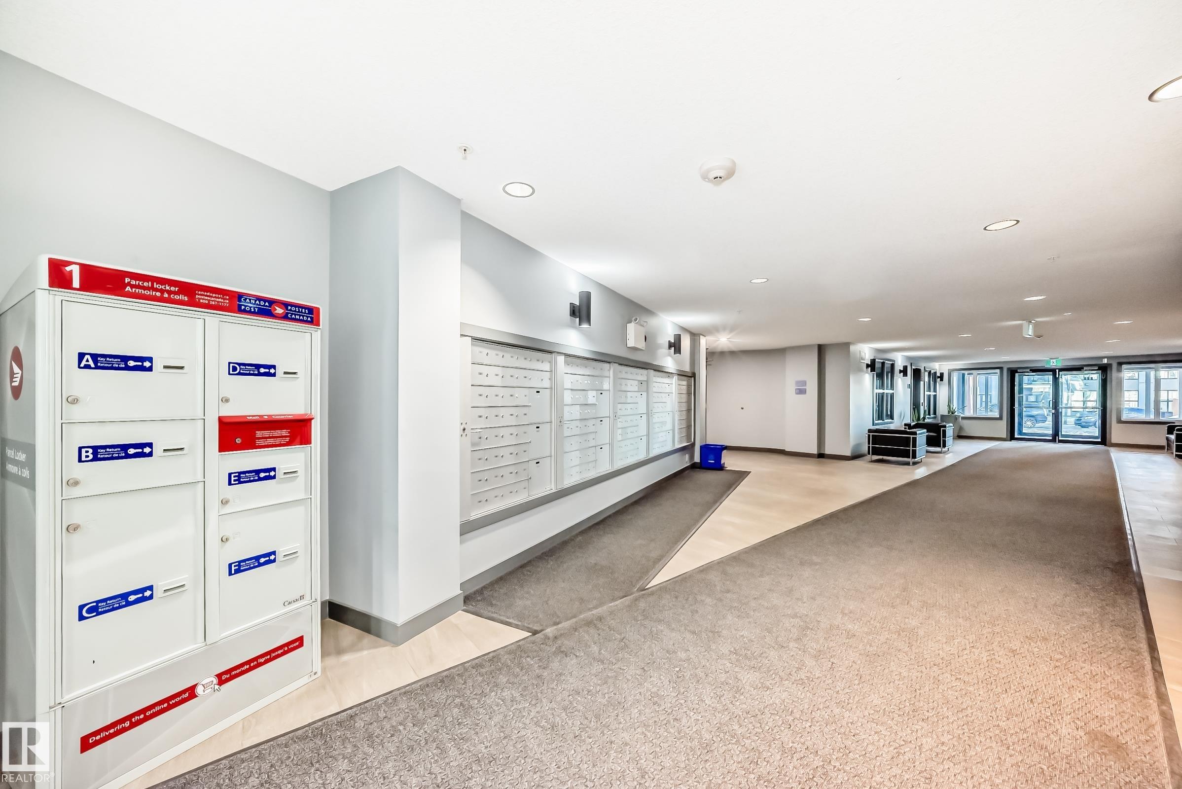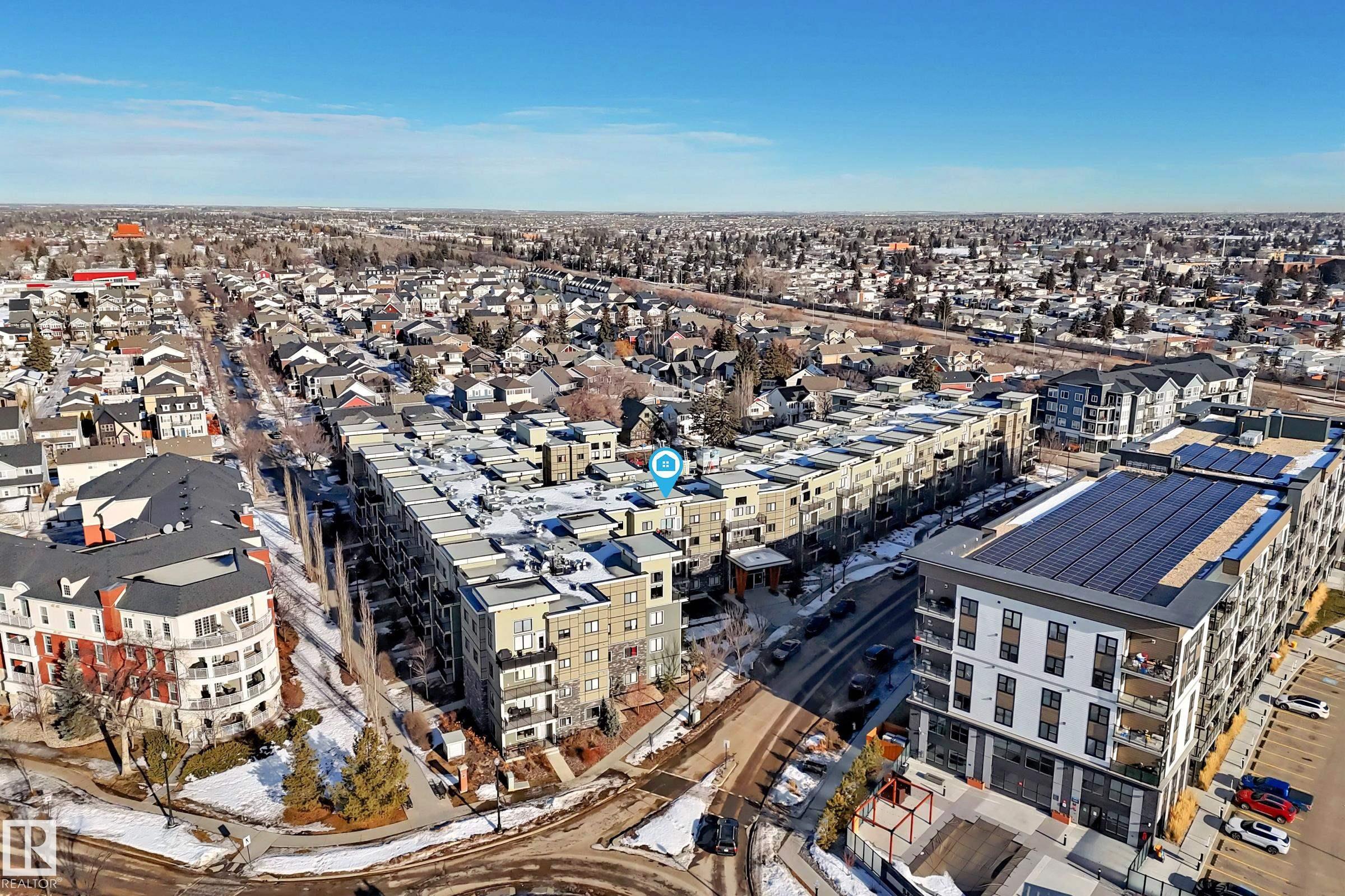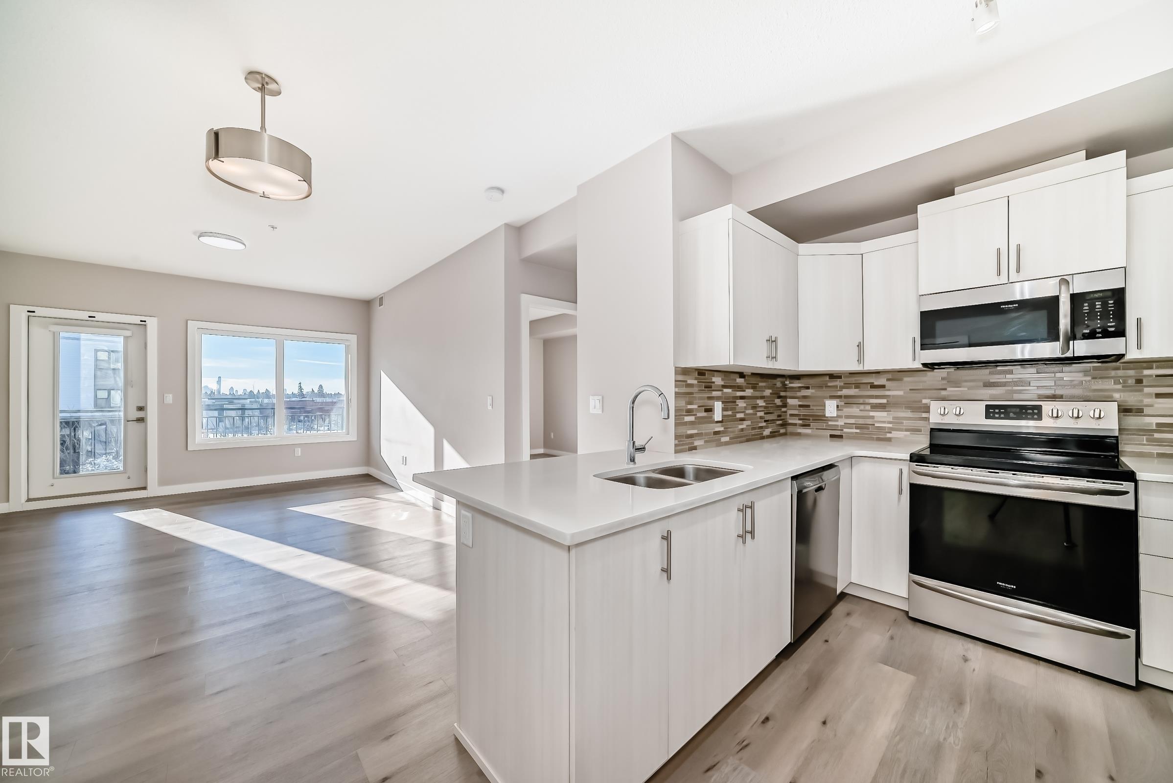 Welcome home to this bright and well-appointed third-floor, south-facing 2 bed, 2 bath suite offering excellent natural light and everyday convenience. With a builder?s size of 1000 SQ FT, the open-concept layout features quartz countertops, soft-close cabinetry, and durable vinyl plank flooring in the main living areas, with plush carpet in the bedrooms. The thoughtfully designed floor plan provides great bedroom separation for privacy, while the desirable south exposure keeps the space warm and inviting. Located just steps from the elevator, this unit offers easy access without long walks down the hallway. Enjoy the spacious balcony with a natural gas BBQ hookup. Building amenities include a fitness centre, social and amenity room, library, car wash bay, and secure key fob entry. Additional features include stainless steel appliances, window coverings, in-suite laundry, and one underground stall with storage. Award winning Griesbach is filled with amenities, minutes away from downtown & the Henday.