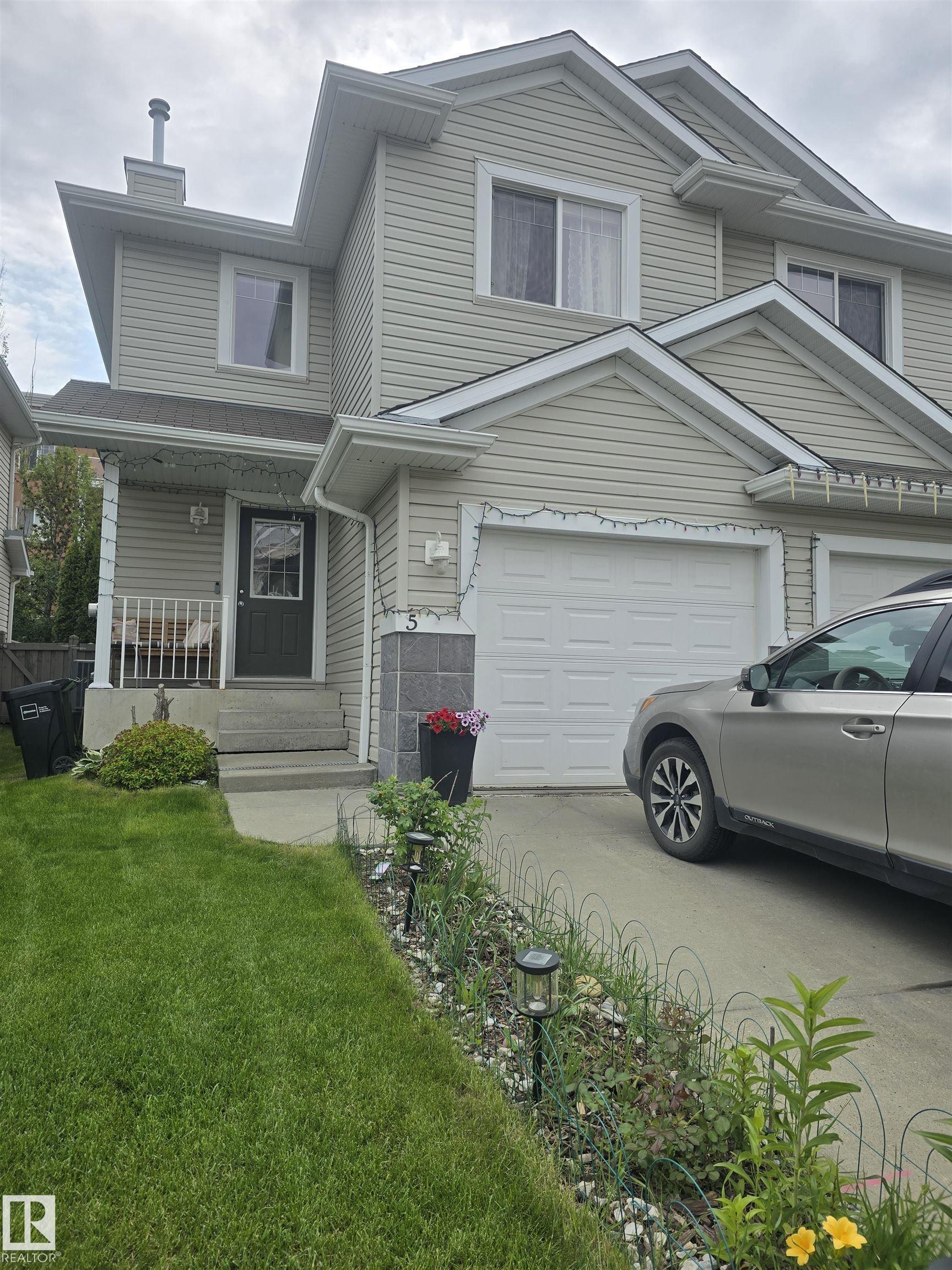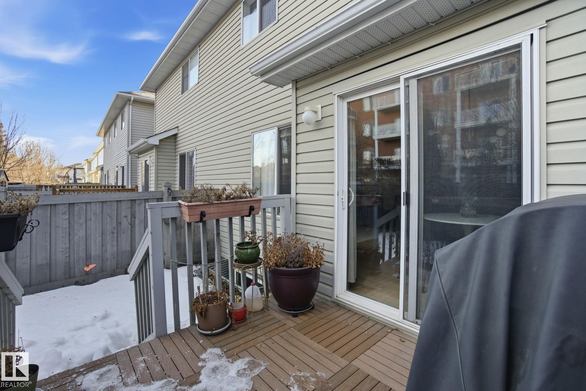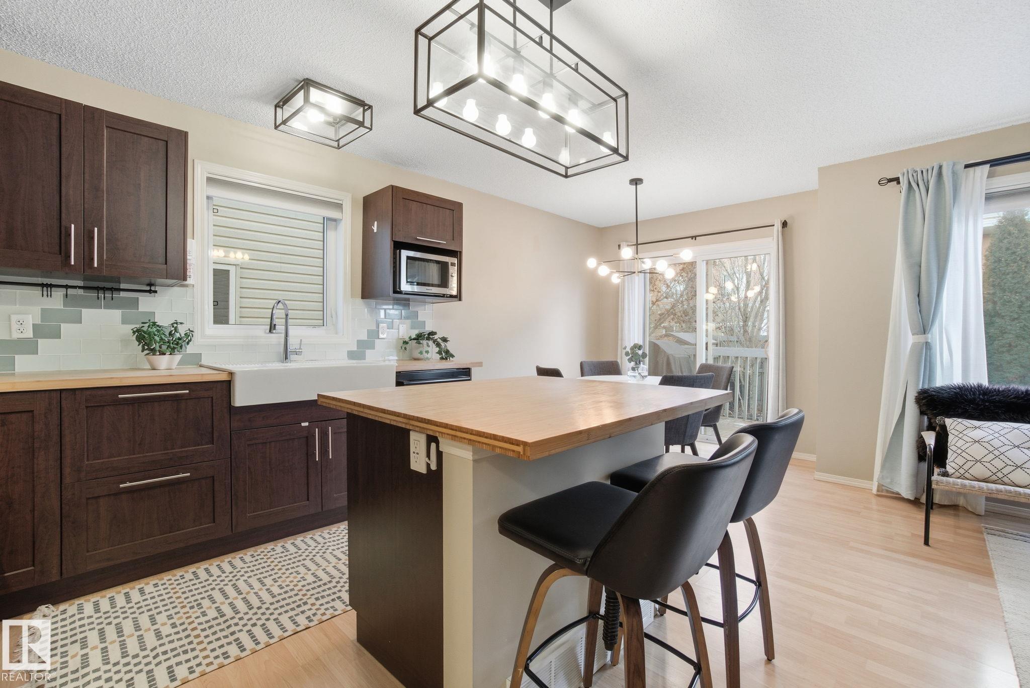 Well kept & nicely updated! This 1300sf 2 story duplex has a finished basement, fenced in yard & attached garage! Open concept floor plan anchored by a beautiful kitchen with dark cabinets, chop block counters, glass subway tile backsplash & an island for extra work space. The dining area features modern lighting & access to the SE facing deck & yard. The living room is a comfortable size & is flexible for furniture placement. Upstairs are 3 bedrooms & 2 full baths. Large primary with ensuite. The basement is finished with a great rec room featuring surround sound & a built-in media unit. Off of this is the utility, laundry & storage area. Single garage with room for another vehicle on the driveway. Lots of room for visitors to park & easy ETS access on Macewan Road a few units down. Great location across the street from Macewan Park, nearby trails & Blackmud Ravine. All amenities walkable on 111th St and Ellerslie. Quick to Henday! New hot water tank, smart electric range, dishwasher & central A/C !