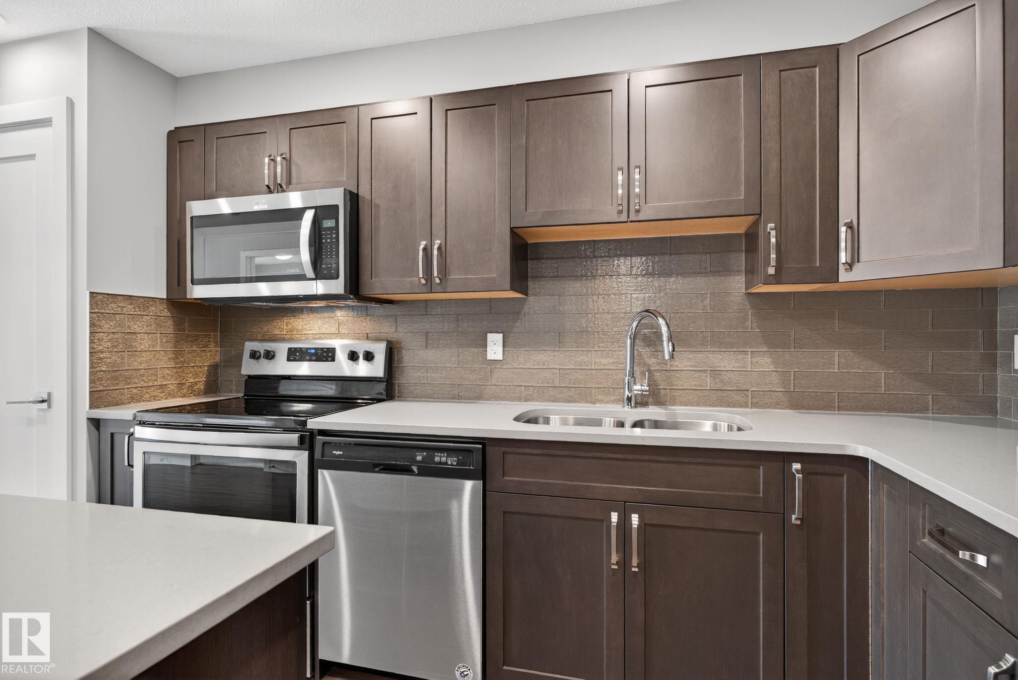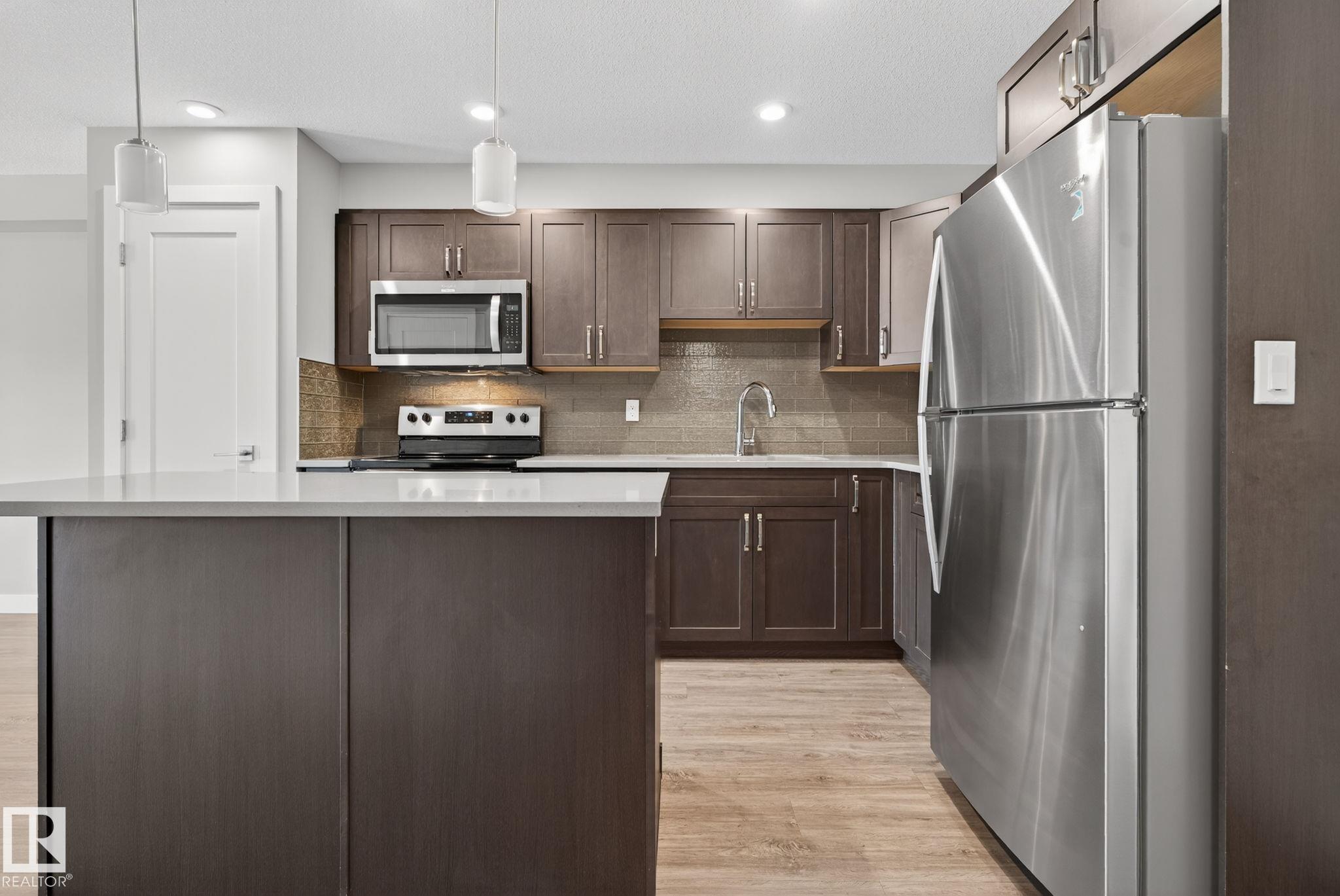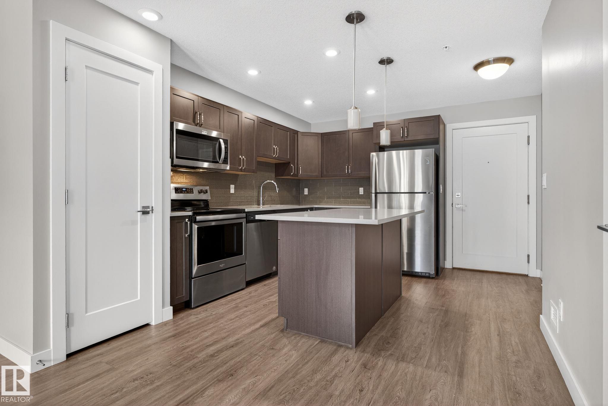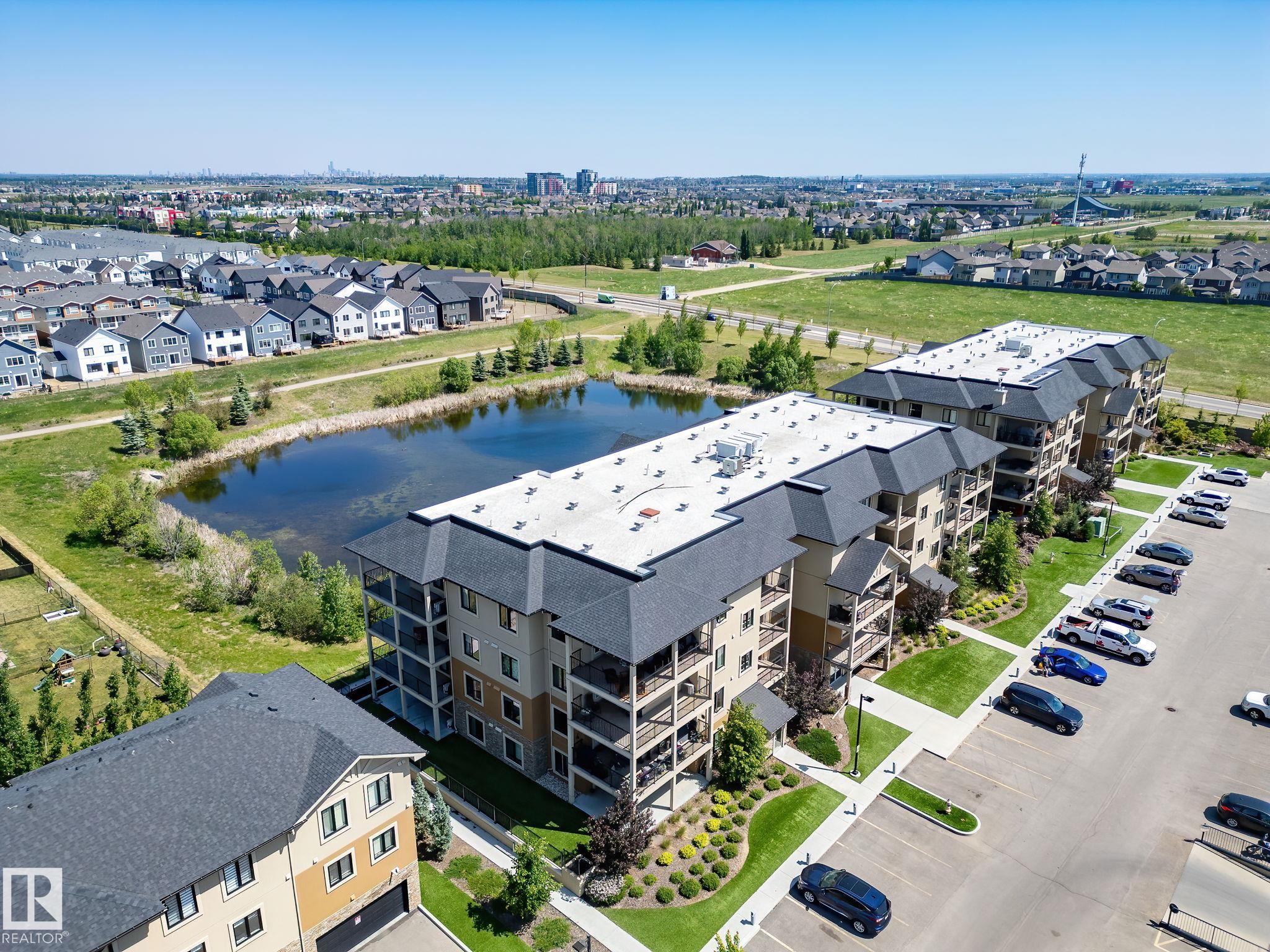 Bright south facing condo in an upscale adult building! This 1 bedroom/1 bathroom condo is perfect for the young professional or retiree. It was fully upgraded with all the design options available such as quartz counters, wide plank LVP, modern mocca shaker cabinets, full height glass backsplash, stainless steel appliances, pot lights and beautiful pendants over the island. Other features include, in-floor heat, big walkthrough bedroom closet & 2 pantries. This condo also offers 1 titled underground parking stall with storage cage attached! Additional surface titled parking is available for sale. Essence is adult only (18+) until 2033. Pets by board approval. Located in a cul de sac with a pond on the north side of the building! Minutes away from the Anthony Henday freeway and extensive shopping and dining in the Currents of Windermere. Essence At Windermere South, an exceptional property in an even more exceptional location.