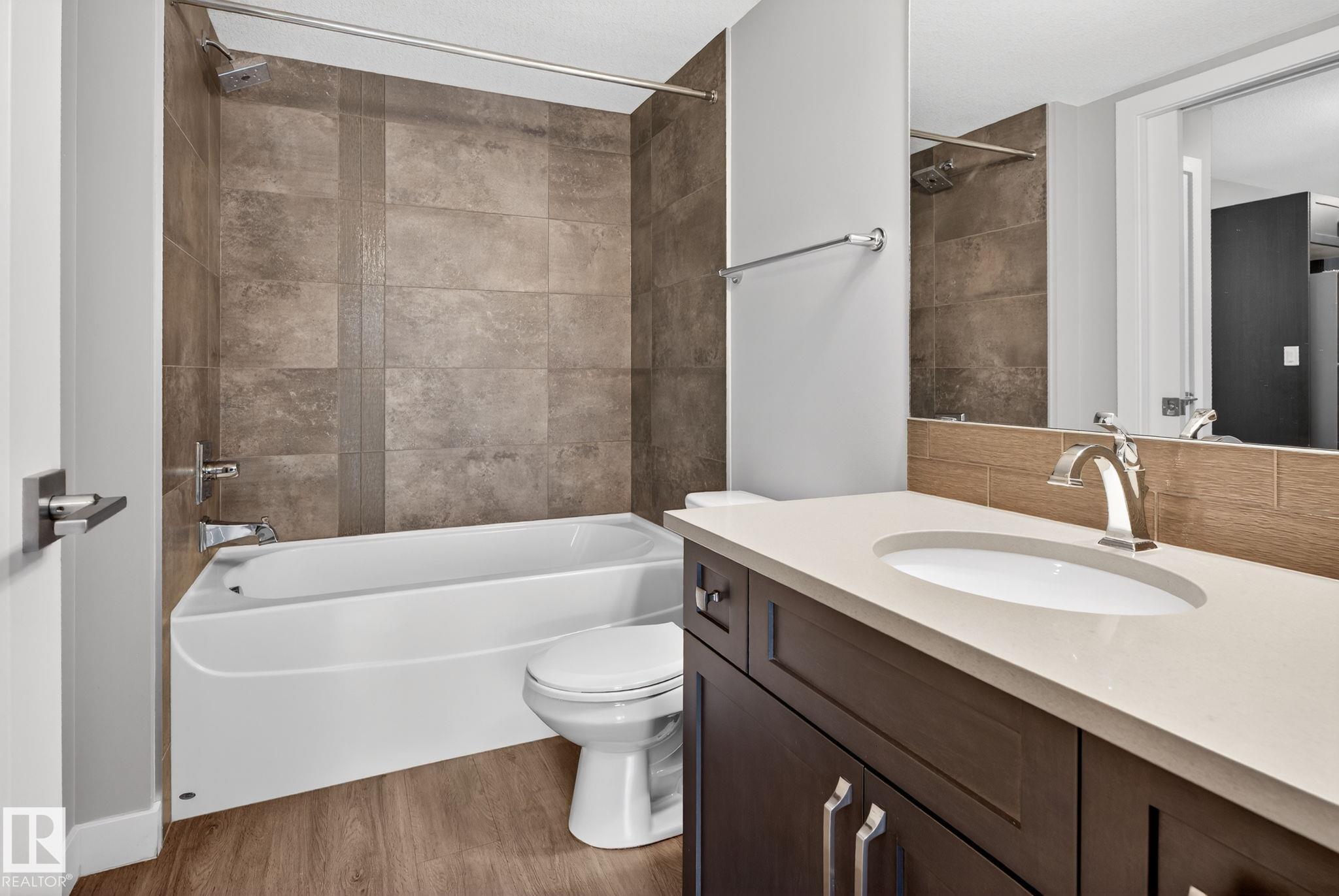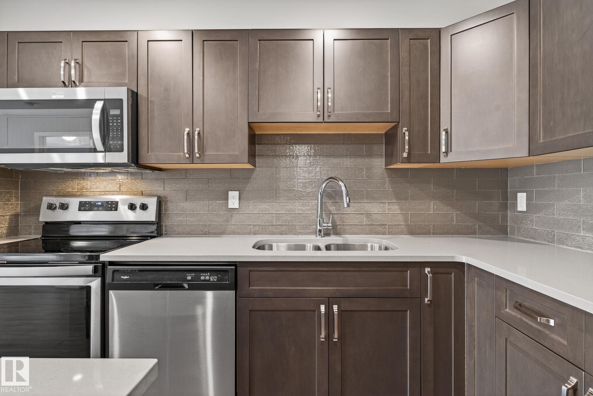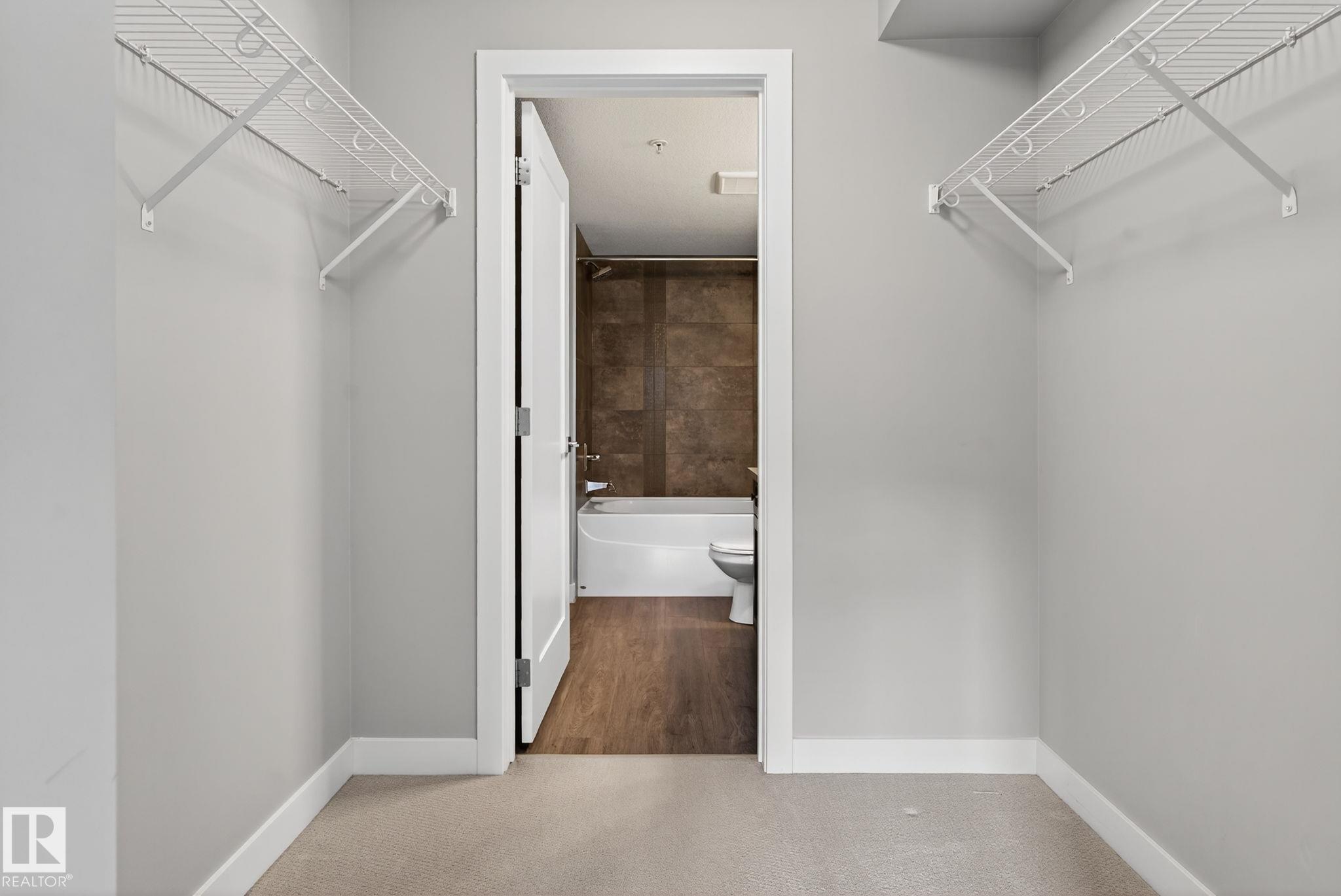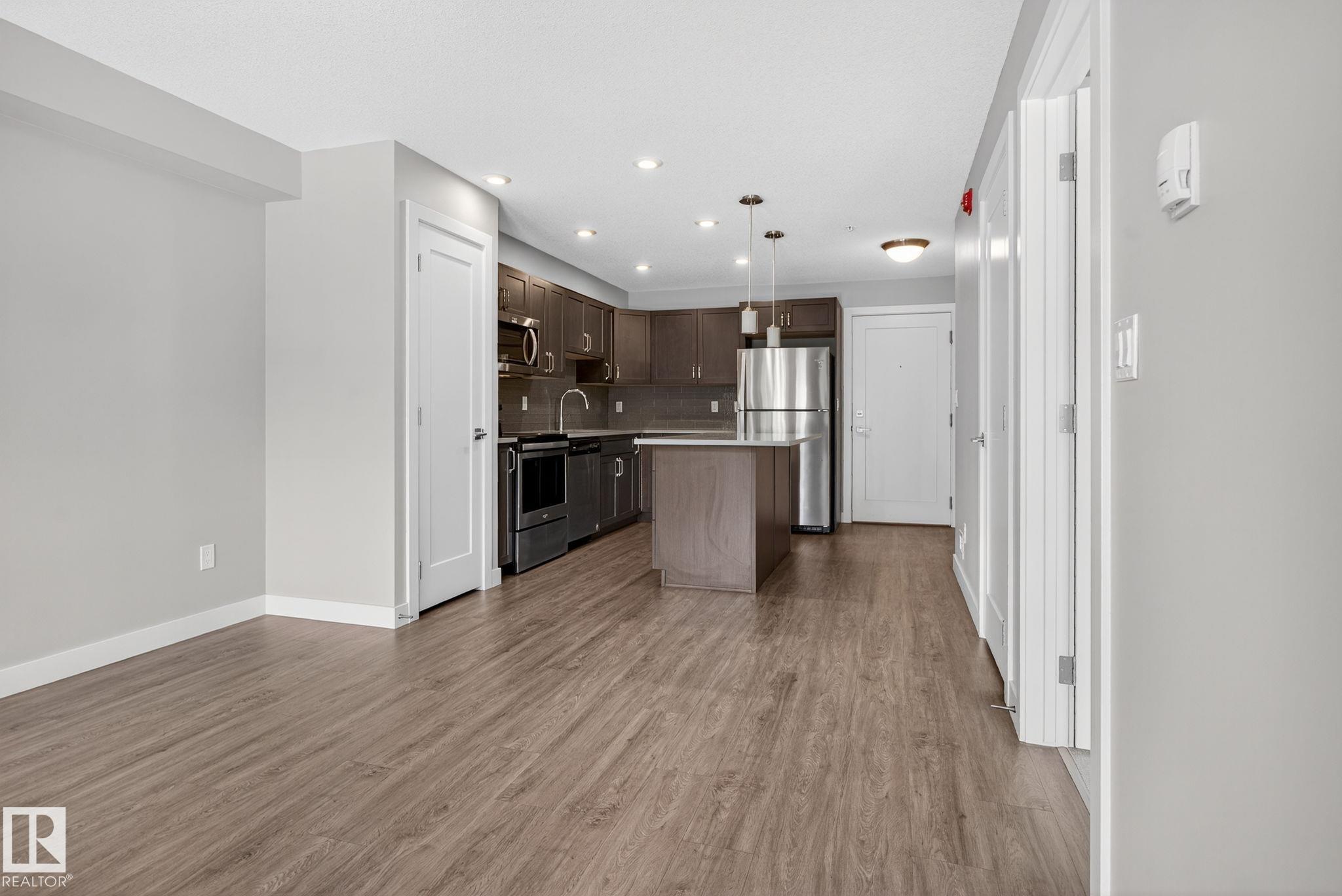 Bright south facing condo in an upscale adult building! This 1 bedroom/1 bathroom condo is perfect for the young professional or retiree. It was fully upgraded with all the design options available such as quartz counters, wide plank LVP, modern mocca shaker cabinets, full height glass backsplash, stainless steel appliances, pot lights and beautiful pendants over the island. Other features include, in-floor heat, big walkthrough bedroom closet & 2 pantries. This condo also offers 1 titled underground parking stall with storage cage attached! Additional surface titled parking is available for sale. Essence is adult only (18+) until 2033. Pets by board approval. Located in a cul de sac with a pond on the north side of the building! Minutes away from the Anthony Henday freeway and extensive shopping and dining in the Currents of Windermere. Essence At Windermere South, an exceptional property in an even more exceptional location.