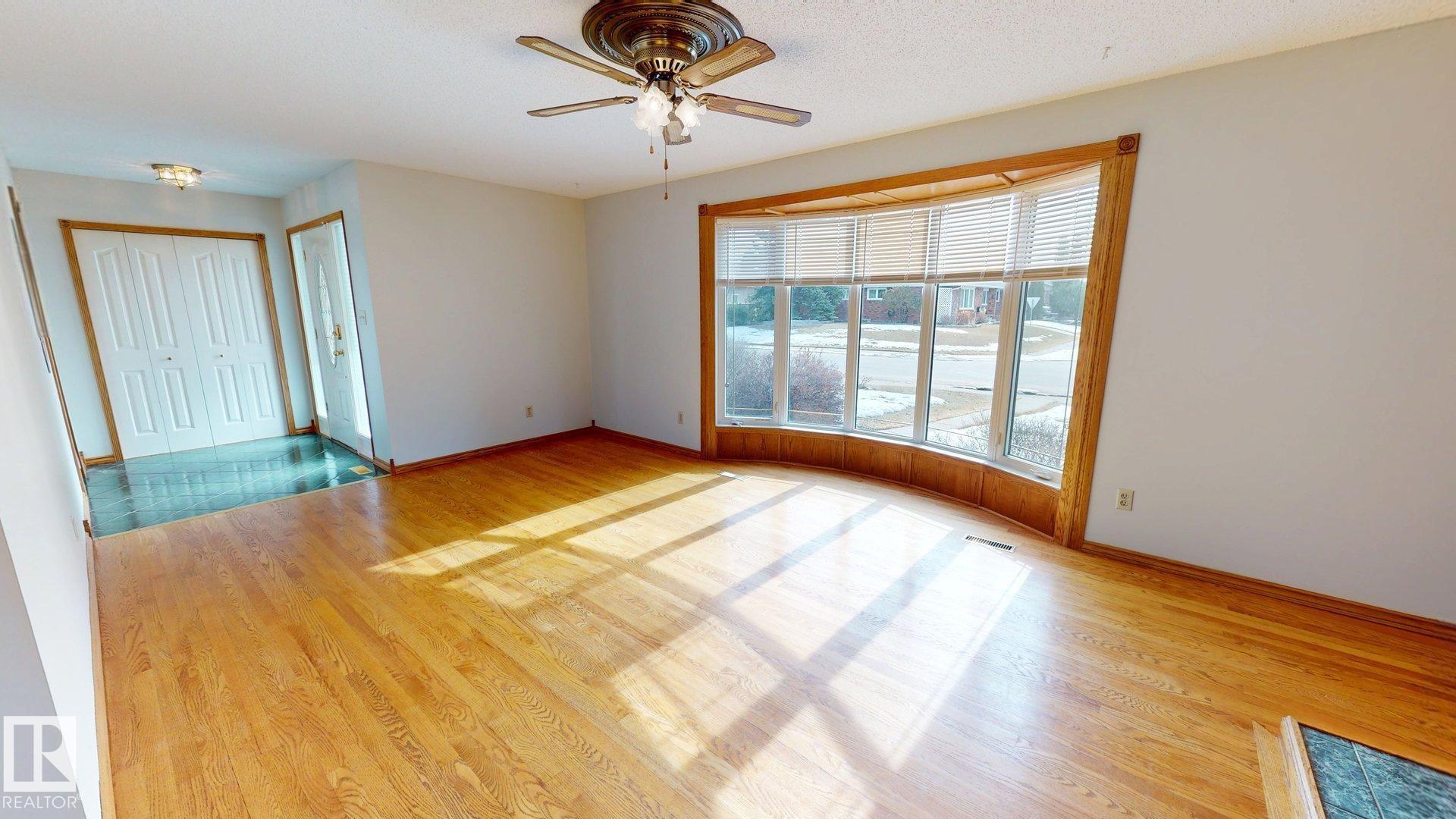 Well-maintained 1,200 sq ft bungalow with attached garage, situated on a fenced lot with a deck, a storage shed and a Saskatoon tree. The roof was replaced in 2019, with a new furnace and hot water tank installed in 2026. The main floor features hardwood flooring in the living and dining rooms, laminate in the three bedrooms, skylight and ceramic tile in the kitchen. The main bathroom has been recently upgraded. The living room includes a gas fireplace with oak surround, built-in shelving, and cabinetry. Windows were replaced in 2003, including a bow window in the living room and a bay window in the dining room. Patio doors from the primary bedroom provide direct access to the deck. The fully finished basement offers additional living space, including a large recreation area with a secondary kitchen setup (counter, sink, and fridge), one bedroom, a half bathroom, and two storage rooms. Laundry area includes washer and dryer.