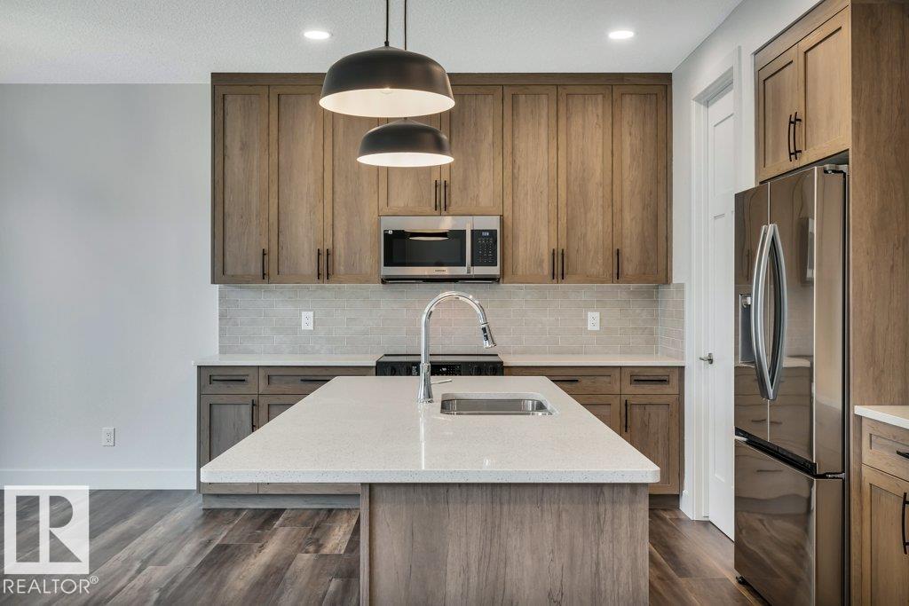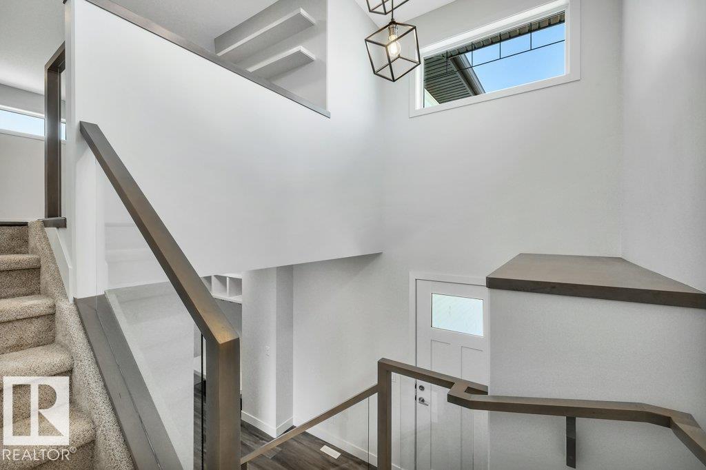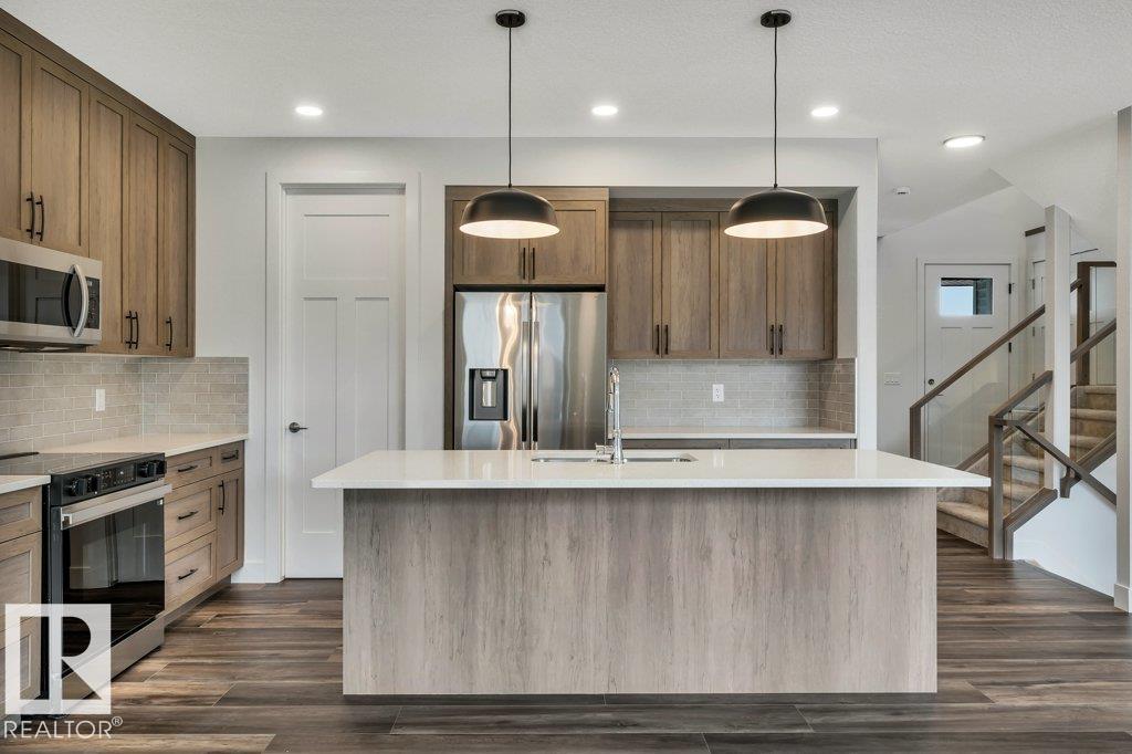 Immediate possession available. Welcome to this beautifully built home by Stonegate Developments, where exceptional craftsmanship and attention to detail are evident from the moment you step through the grand entrance. The open-concept main floor is perfect for entertaining, featuring a stylish kitchen with full-height cabinetry and access to a deck with aluminum railings, while upstairs offers three bedrooms, two bathrooms, a convenient walk-in laundry room, and a spacious family room with a built-in desk. The primary suite provides a relaxing retreat with a spa-inspired ensuite and custom tiled shower. Additional highlights include quartz countertops, 8-foot solid core doors, stainless steel appliances, a built-in electric fireplace, modern glass stair panels and luxury vinyl plank flooring. Situated on a pie-shaped lot in a quiet cul-de-sac, this home also features a double attached garage with a floor drain and side entry, and comes complete with full Alberta New Home Warranty for added peace of mind.