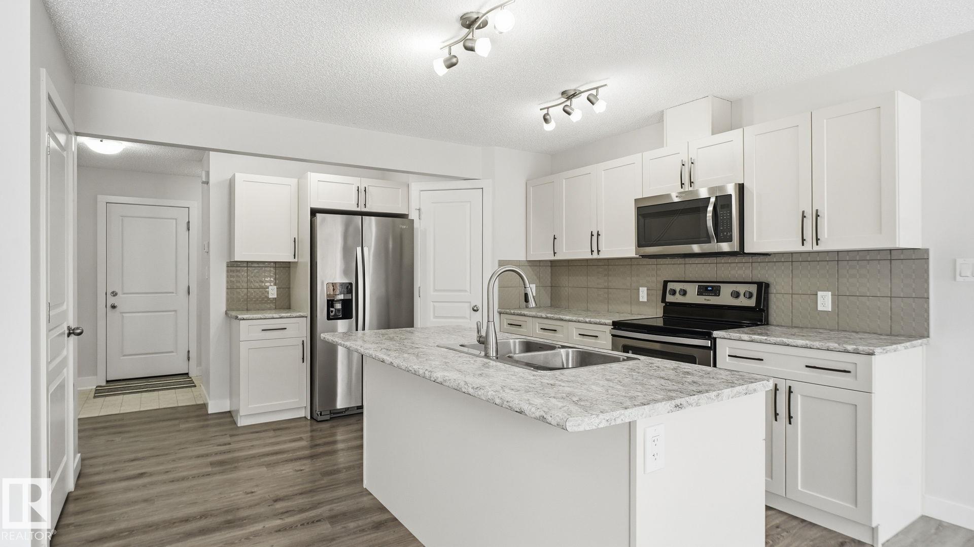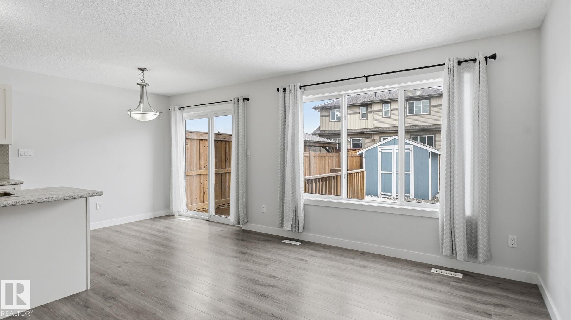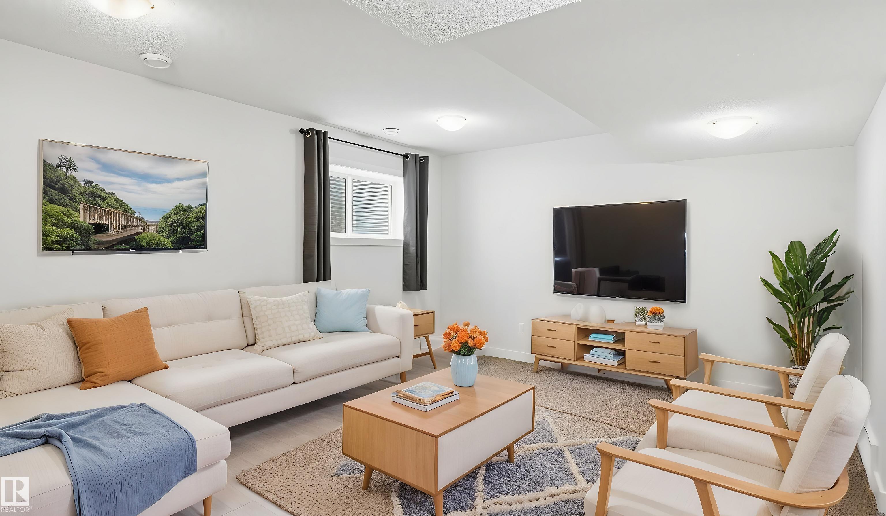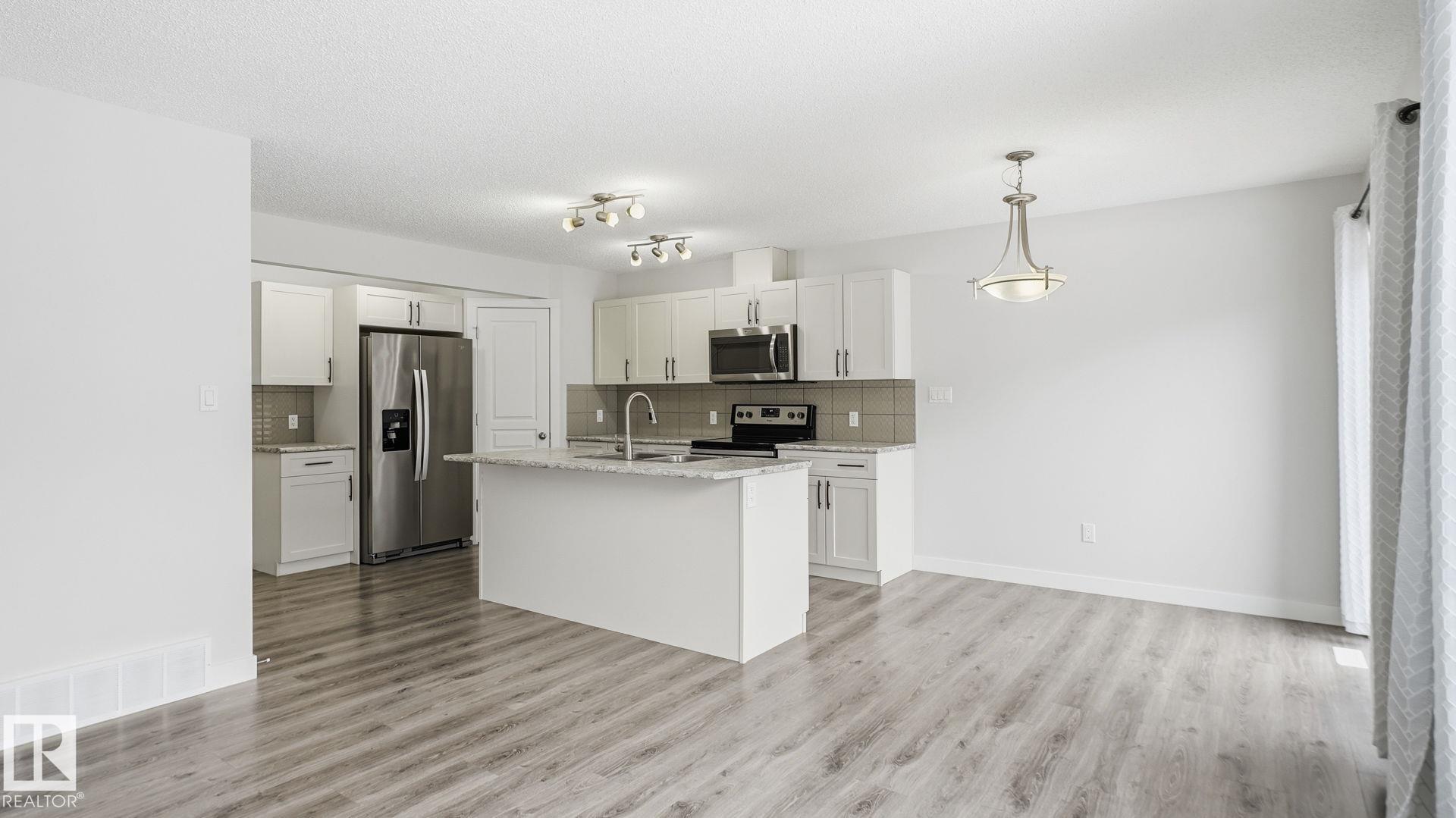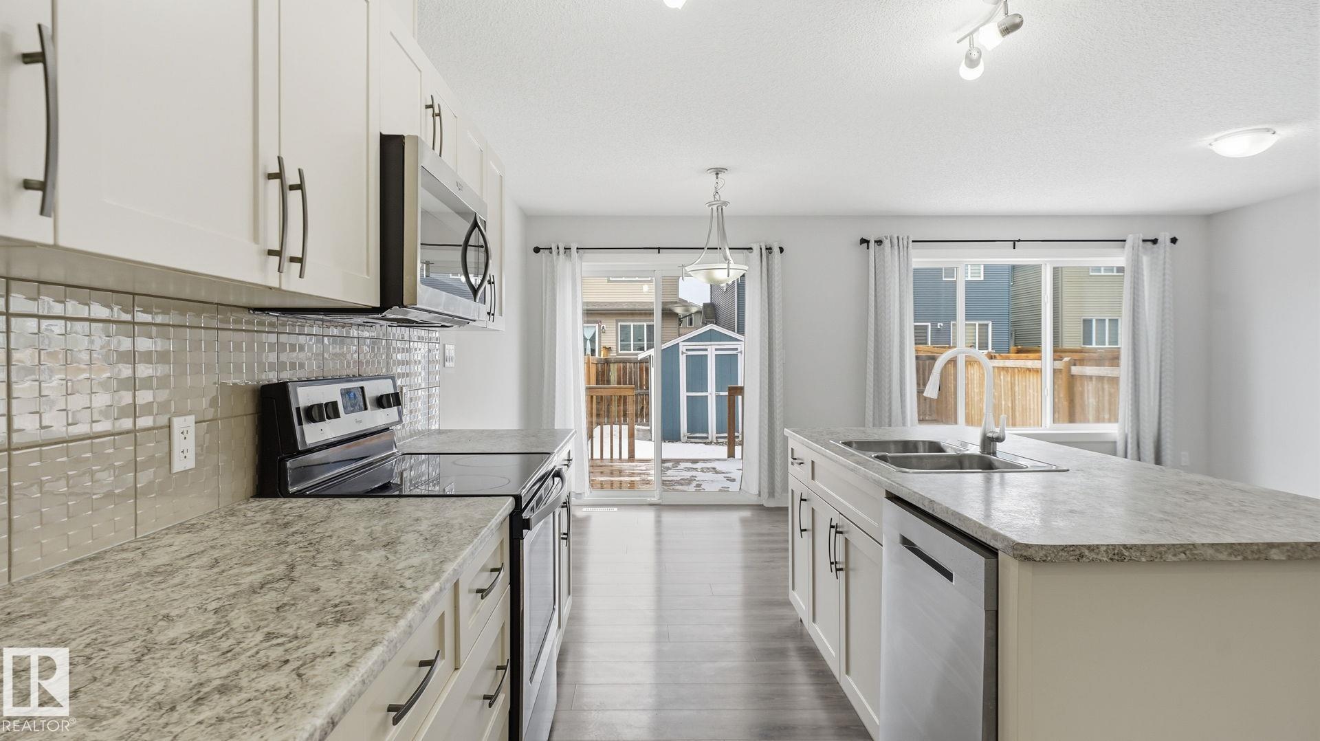 Welcome to this move-in ready half duplex offering 1,862 sq ft of total living space. Featuring 3 bedrooms, 3.5 bathrooms & a single attached garage, this home is perfect for families or first-time buyers. The main floor showcases an open-concept layout with modern white finishes, natural tone laminate flooring & a bright, inviting atmosphere. The kitchen includes a large island with eat-up bar, pantry & seamless flow to the dining and living areas. Patio doors lead to a deck & fully landscaped yard?ideal for relaxing or entertaining. Upstairs you?ll find a spacious primary suite with walk-in closet & private ensuite, along with 2 additional bedrooms & convenient upper-level laundry. The fully finished basement features a great sized rec room, 4-piece bath & storage space. Enjoy the convenience of being within walking distance to schools, parks & scenic pathways.