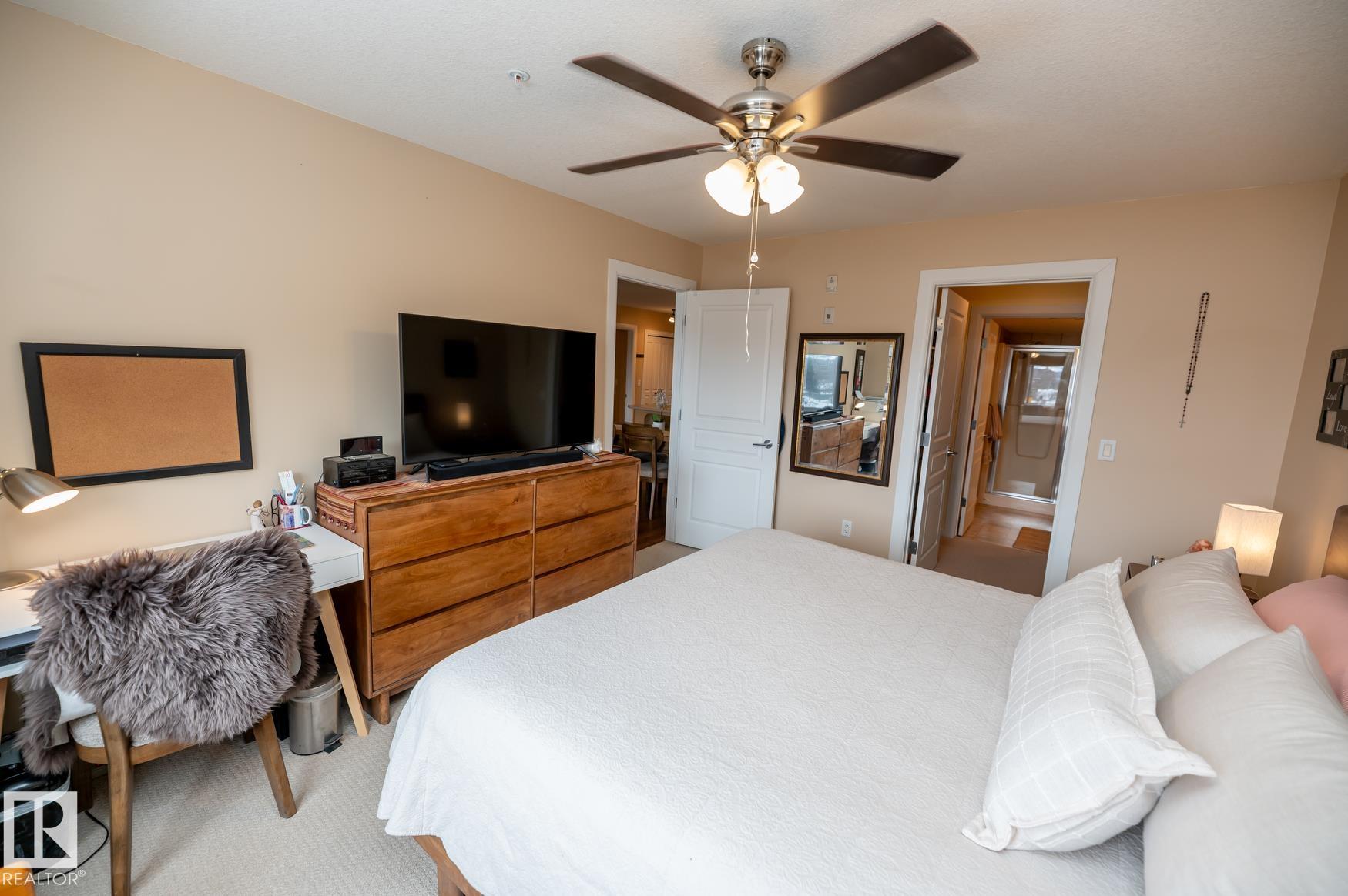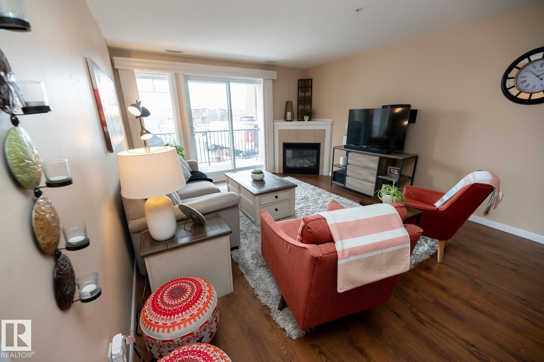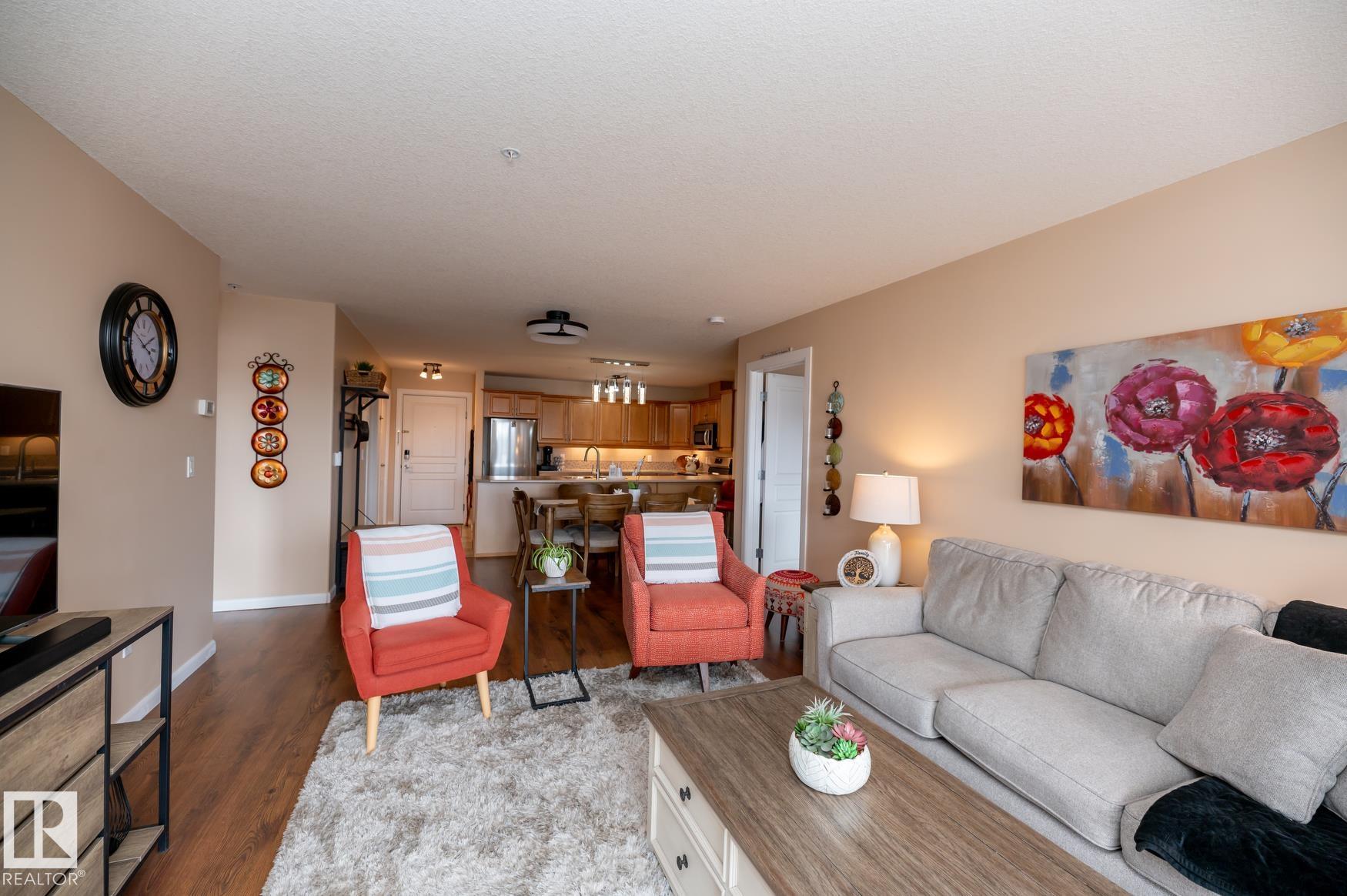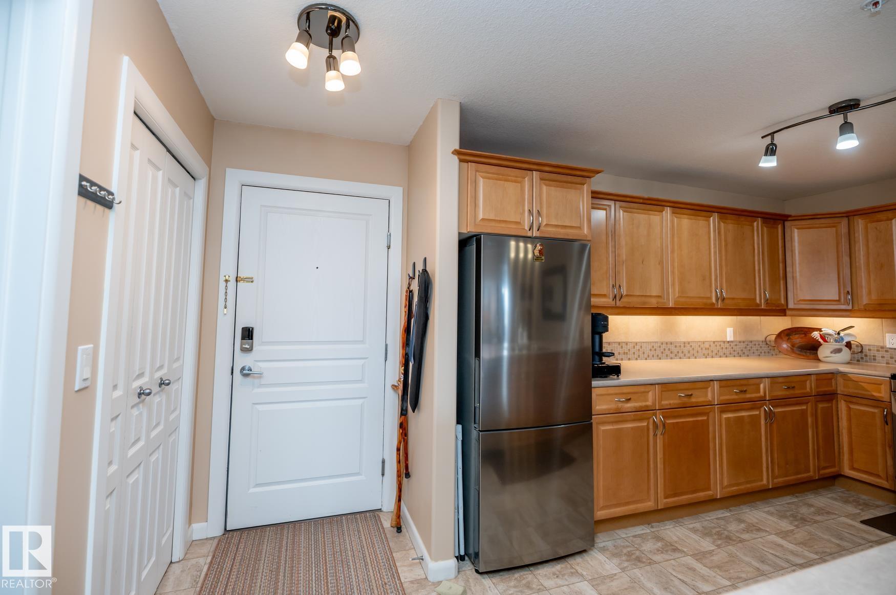 Immaculate 2 Bedroom plus a den/storage room condo that is Air conditioned with a fan coil system. This condo has a large kitchen that includes an eating bar and dining space that leads to a bright living room with a corner fire place. The large primary bedroom includes a walk in closet & a 3 piece ensuite washroom. This condo also includes a second bedroom, in-suite laundry, an additional 4 piece washroom a den that has been converted to a storage room but could easily have the shelving removed to make it into a den again. This unit has one underground parking space (plus storage) in a heated parkade & close to the elevators. Recent upgrades in 2025 include: New Stove, Fridge, Washer/Dryer, Garburator. AMENITIES in the building are: Sauna area (Dry & Wet), Exercise room, Theatre room, Car Wash, Games room that includes a Pool Table. The building is pet friendly with board approval, age is currently restricted to 18+ Great location close to shopping, walking trails, transportation.