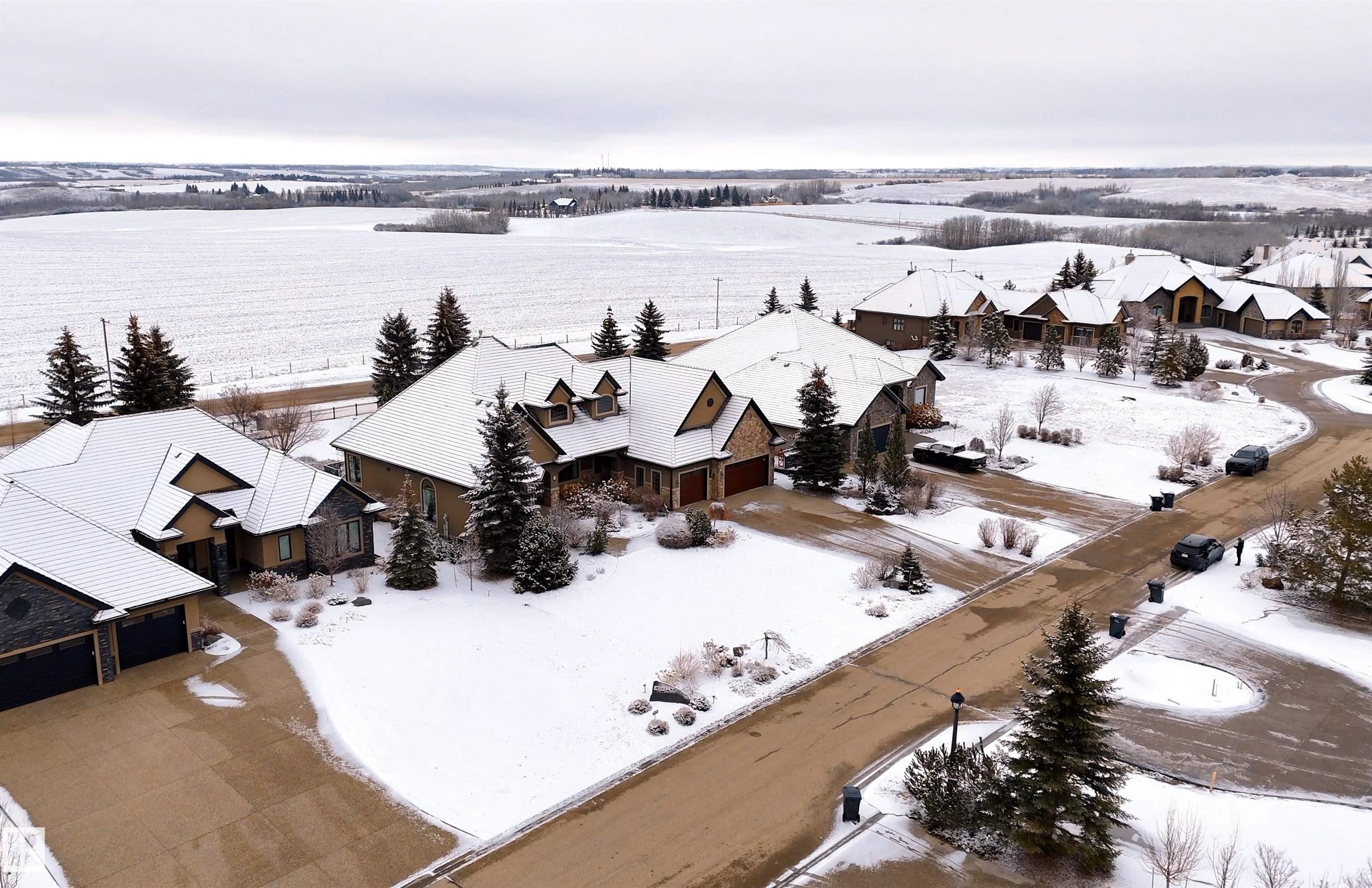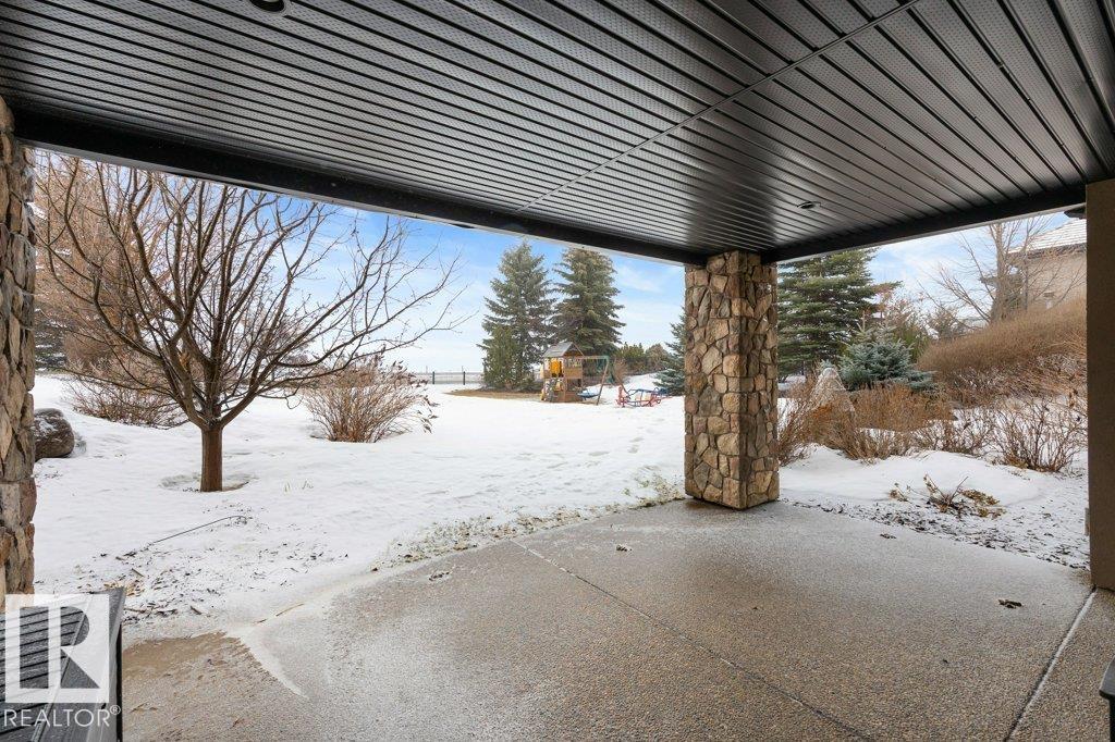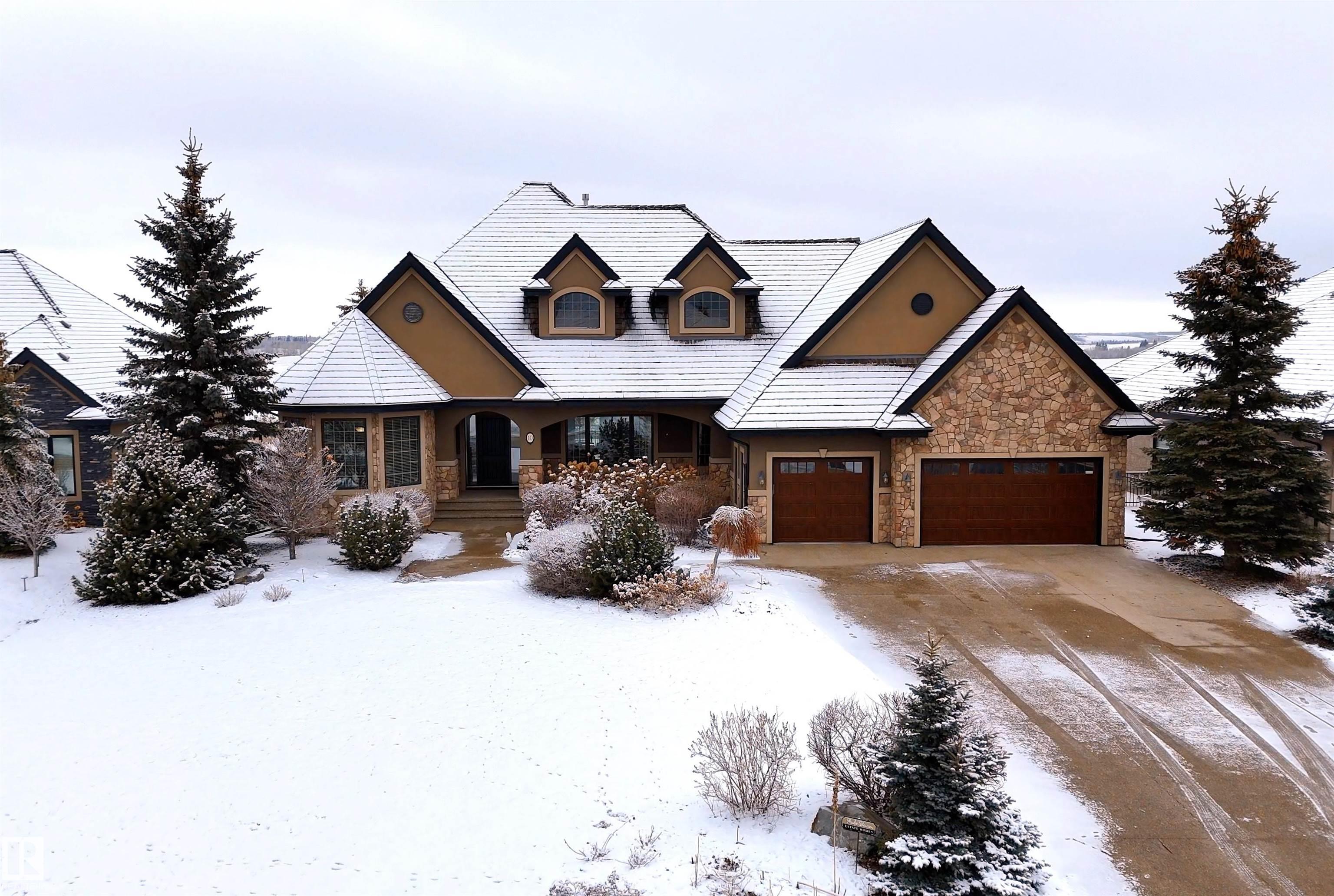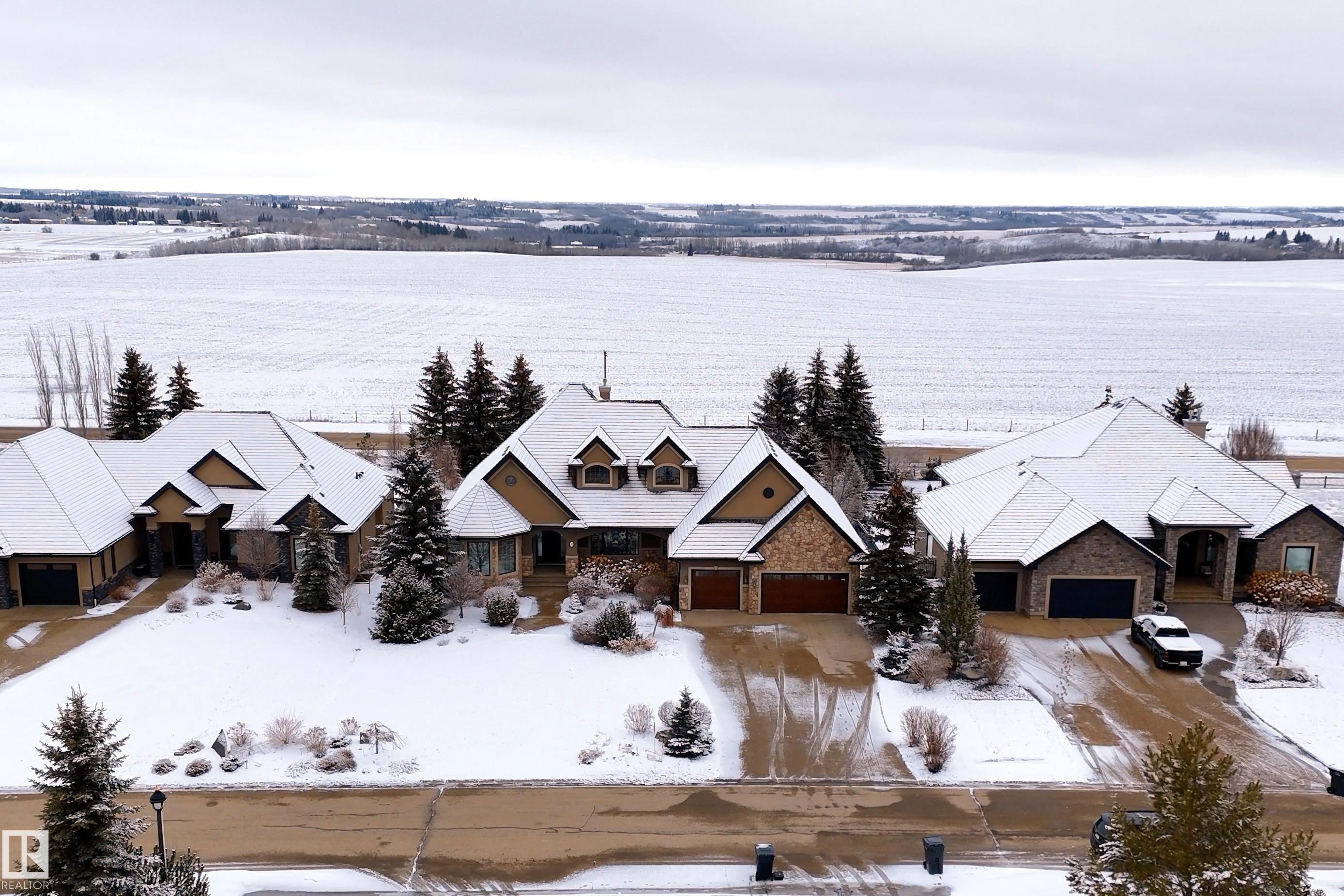 Welcome to this exceptional 2,300 sq ft walk-out bungalow by Audie Benson Estate Homes, ideally nestled in the prestigious community of Riverstone Pointe. Showcasing breathtaking views, it offers the ultimate blend of luxury, tranquility, and acreage-style living?just minutes to St. Albert and the Henday. Built to the highest standards of quality and craftsmanship, every detail has been thoughtfully curated. The main floor features a stunning primary retreat with a spa-inspired 5-piece ensuite and expansive walk-in closet, along with a private den. The open-concept living space is rich in natural light and anchored by a beautifully appointed, chef-inspired kitchen designed for both elevated entertaining and everyday living. The fully finished walk-out lower level offers 3 spacious bedrooms and an impressive family rm/games area & wet bar creating the perfect setting for hosting family and guests. A heated quad garage completes this extraordinary home?where timeless design meets an exceptional lifestyle.