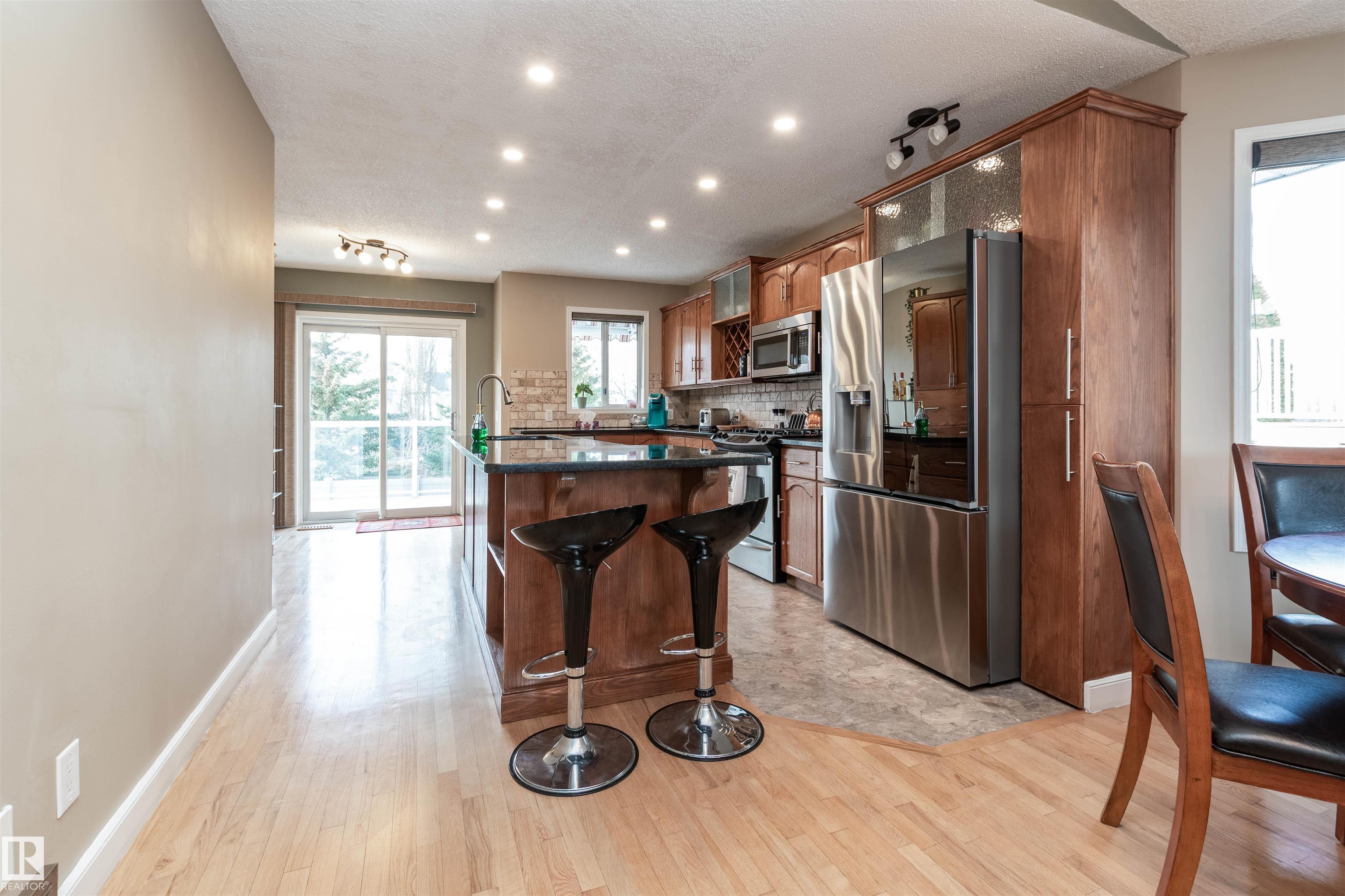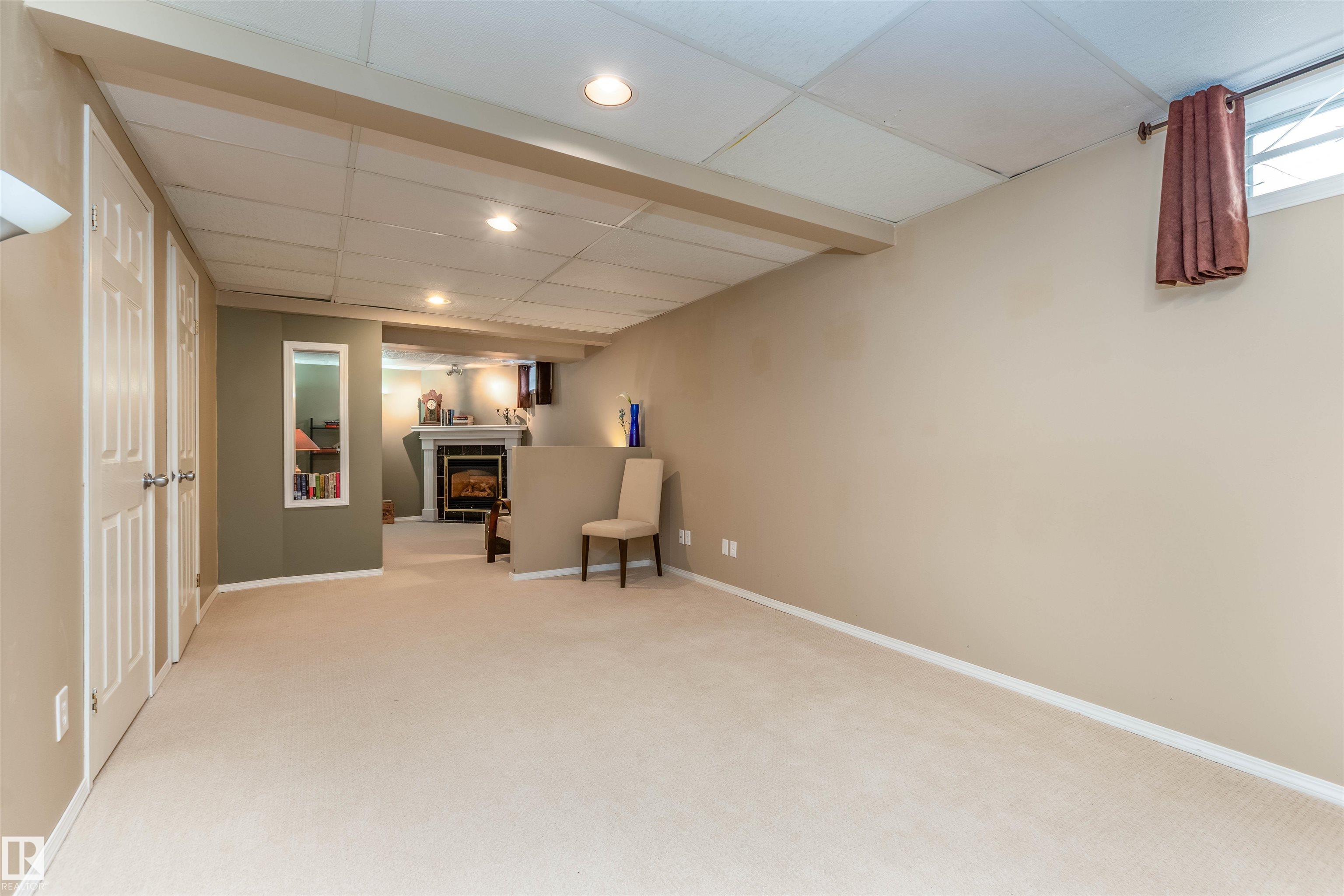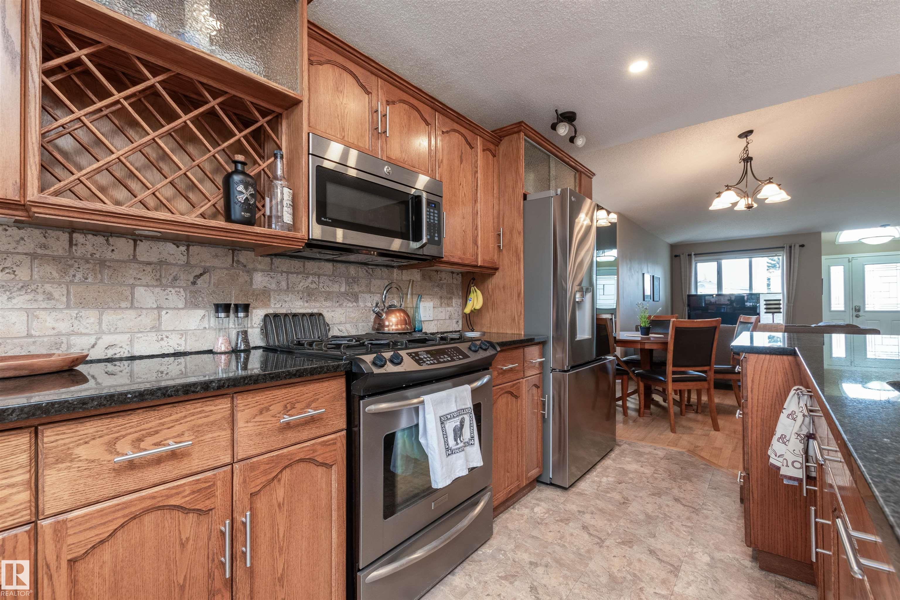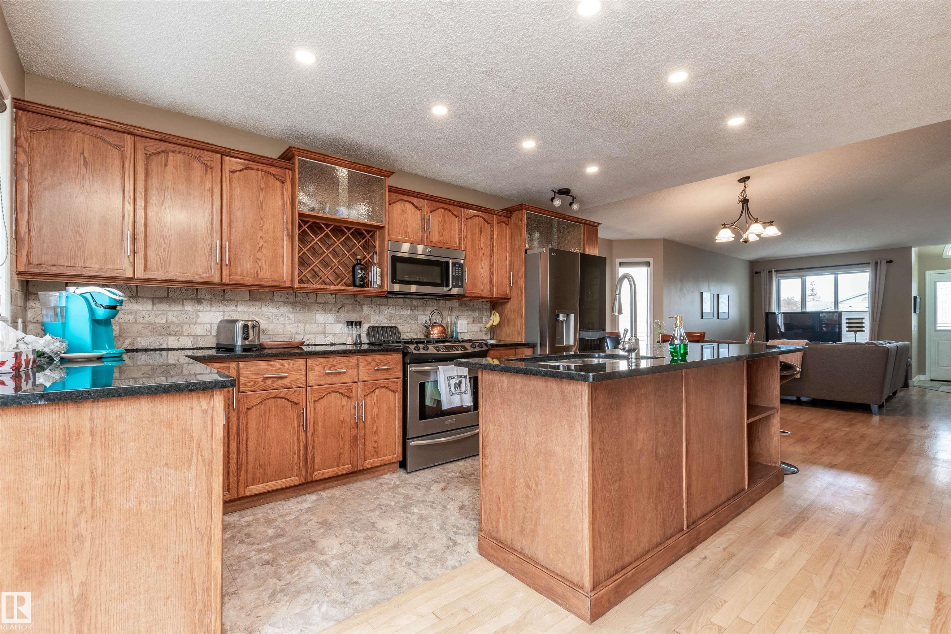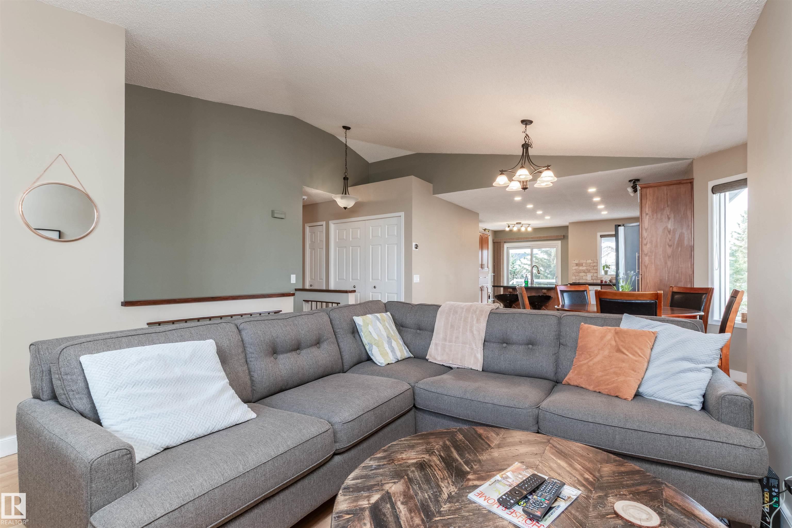 BEAUTIFUL BUNGALOW BACKING ONTO A GREEN SPACE WITH DIRECT ACCESS TO WALKING TRAILS! A rare opportunity in Sherwood Park! Situated on a huge PIE LOT in a treed back setting. Offering over 2000 square feet of total living space including a fully finished basement. Open and spacious front living room with adjacent dining area. Featuring a gorgeous kitchen with hardwood flooring, Granite countertops and stainless steel appliances. Direct access to the two-tiered deck and the beautiful SOUTHWEST FACING BACKYARD! There are 3 bedrooms on the main, laundry area, and a 4 piece bathroom. The Primary Bedroom has its own private 3 piece ensuite and walk-in closet. The basement offers a big family room with gas fireplace, flex space and a 3 piece bathroom. Newer shingles, central A/C, and a HEATED double attached garage. Great location close to schools, transit, parks and various restaurants and shopping. Won't last! Visit REALTORŪ website for more information.
