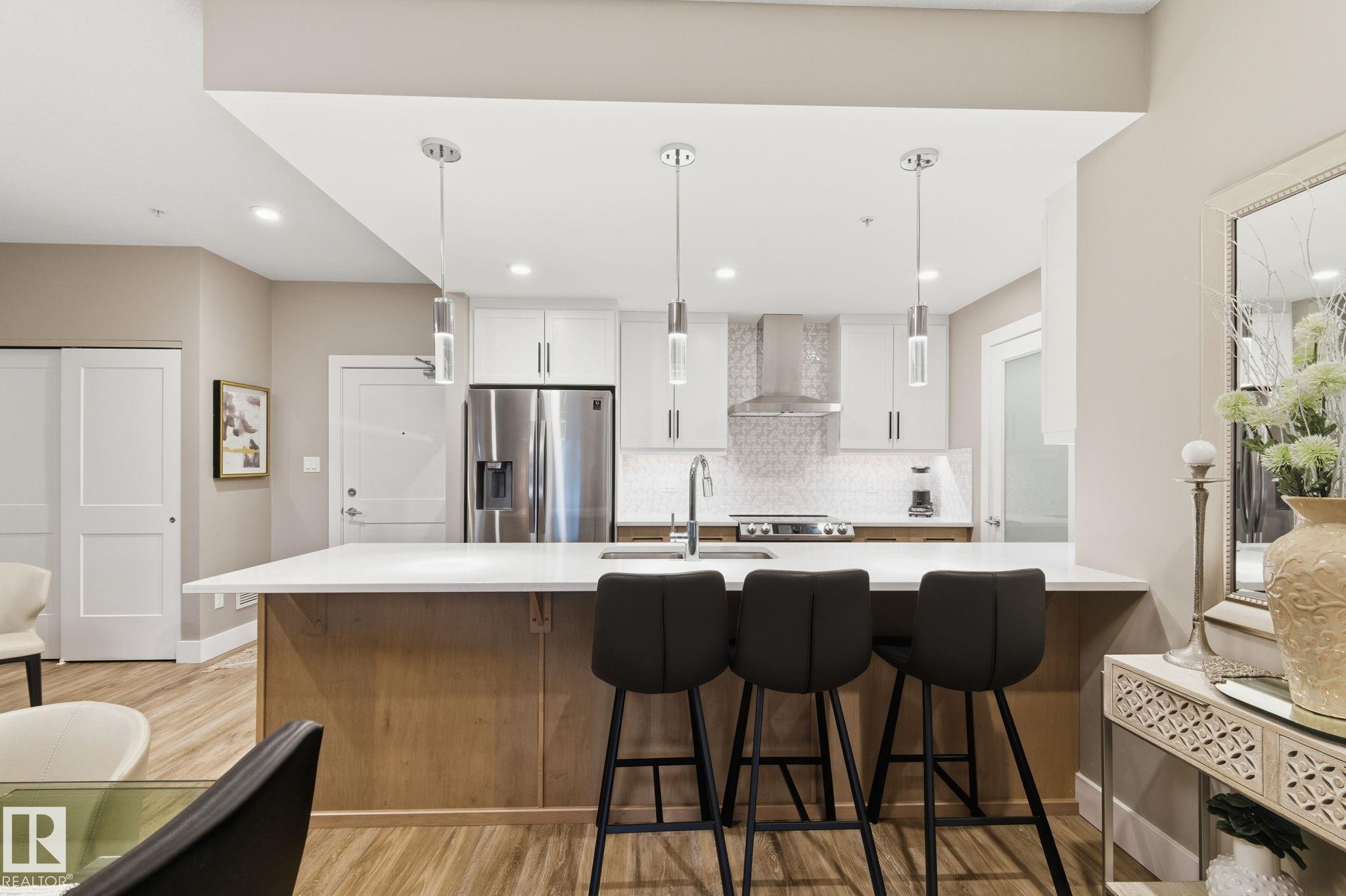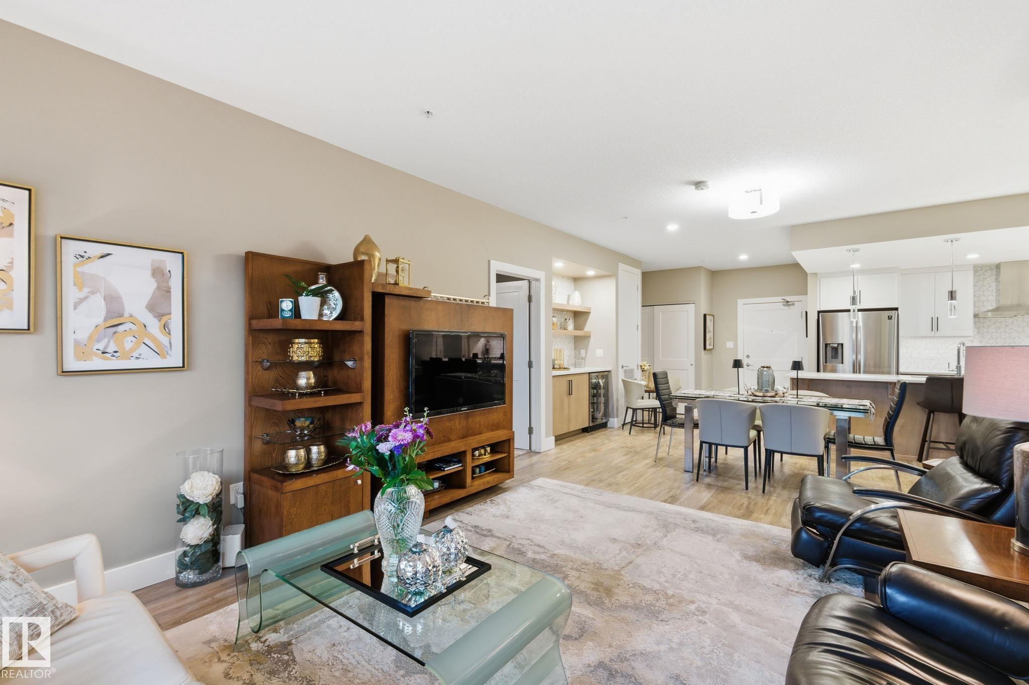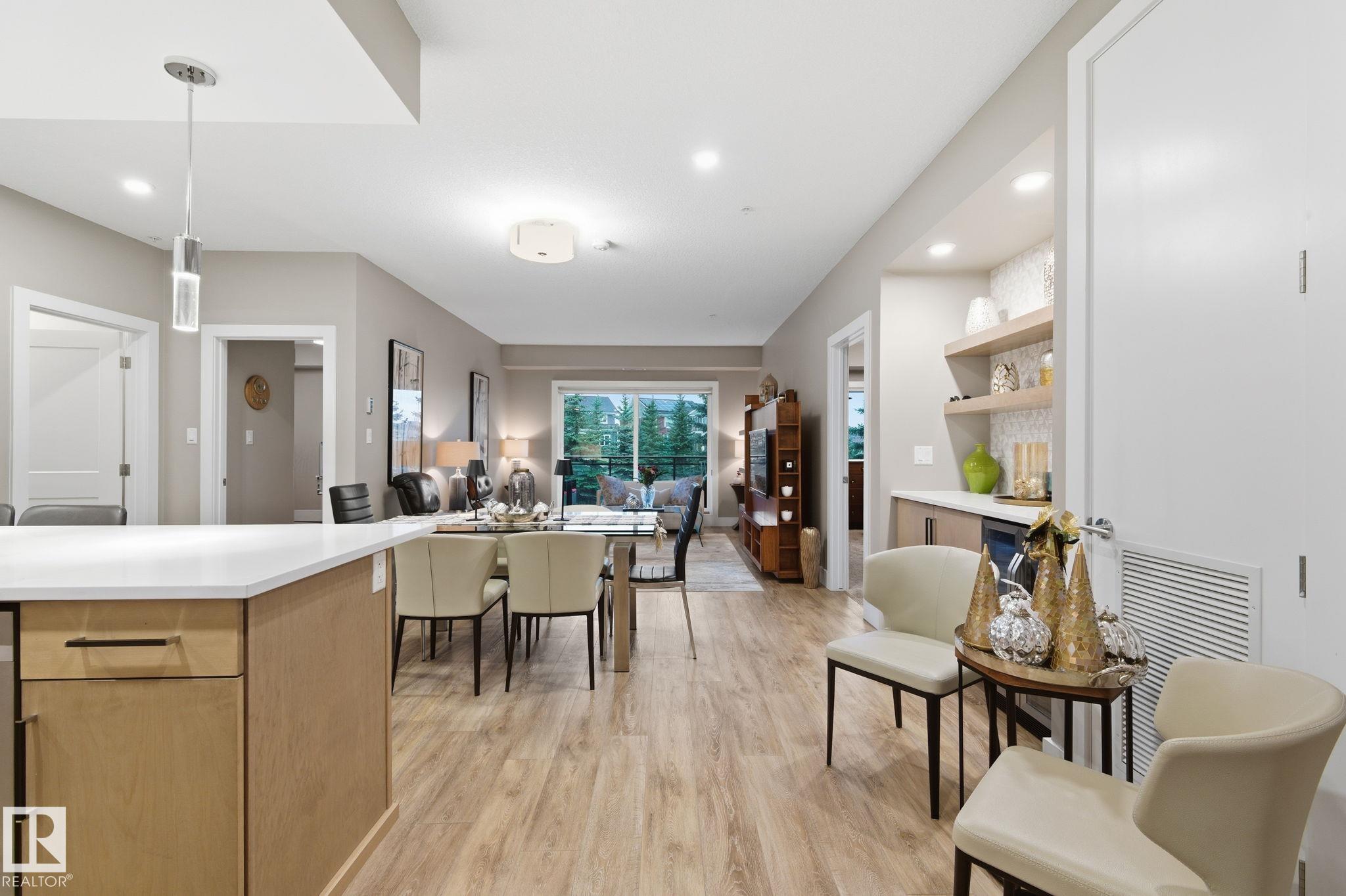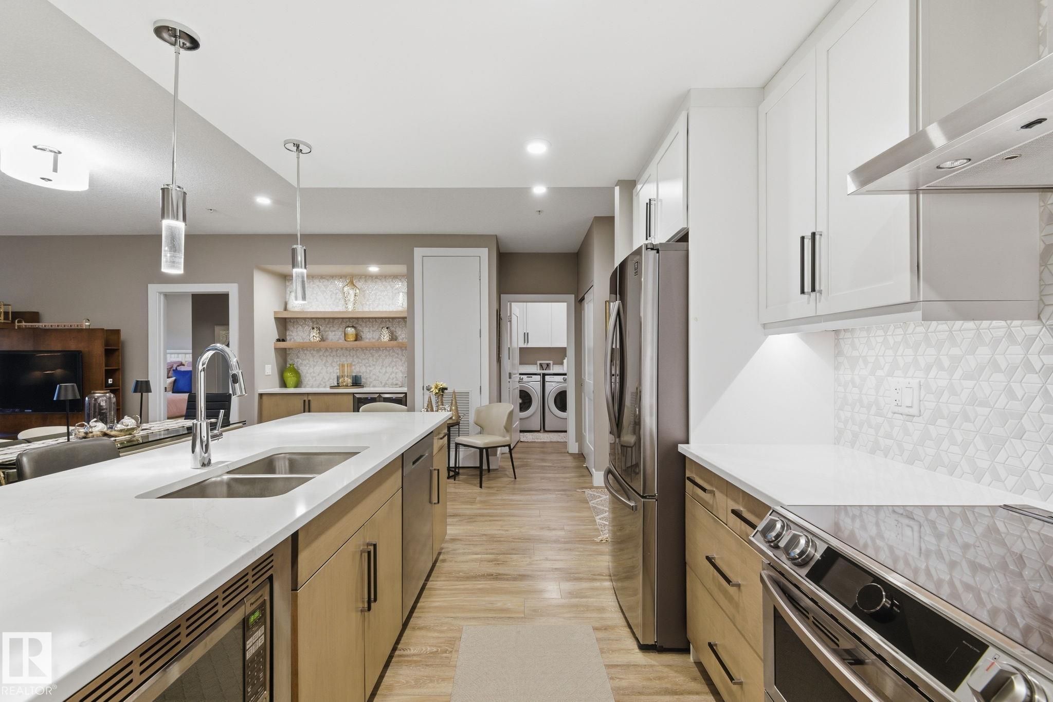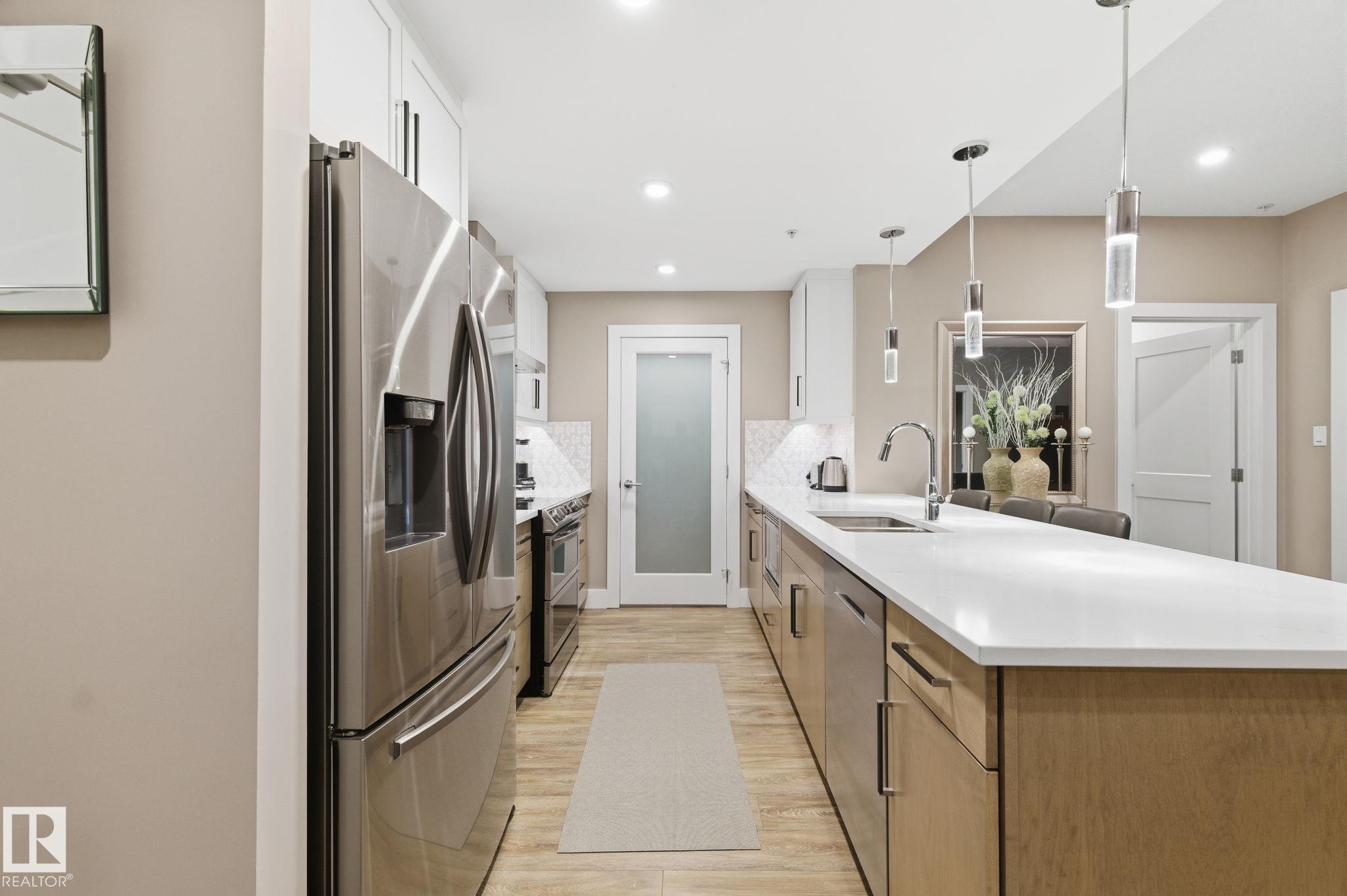 Experience refined luxury living at Veritas, the premier condominium residence in the community of Griesbach. This exquisite former show suite blends elegance and comfort, showcasing over $25,000 in designer upgrades with captivating park and lake views. Thoughtfully designed, this main-floor retreat features gourmet-inspired quartz countertops, a custom laundry room with counter and built-in cabinetry, a pantry, and a stylish bar area with wine fridge. Sophisticated finishes, open-concept living, and serene surroundings create an atmosphere of quiet indulgence. Enjoy the convenience of two titled parking stalls and access to Veritas? exceptional amenities, including a state-of-the-art fitness centre, beautiful social lounge complete with billiard table, and a spacious guest suite for overnight guests. This unit is perfect for discerning professionals or empty nesters seeking a lifestyle of elegance, comfort, and effortless sophistication in one of Edmonton?s most sought-after residences.