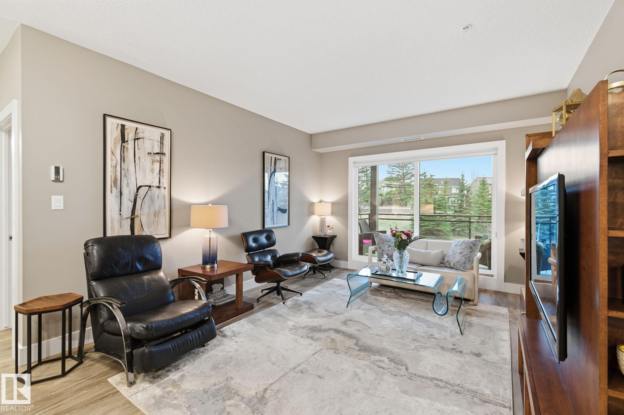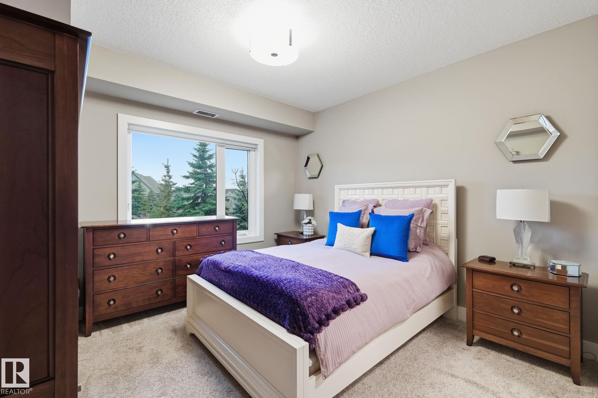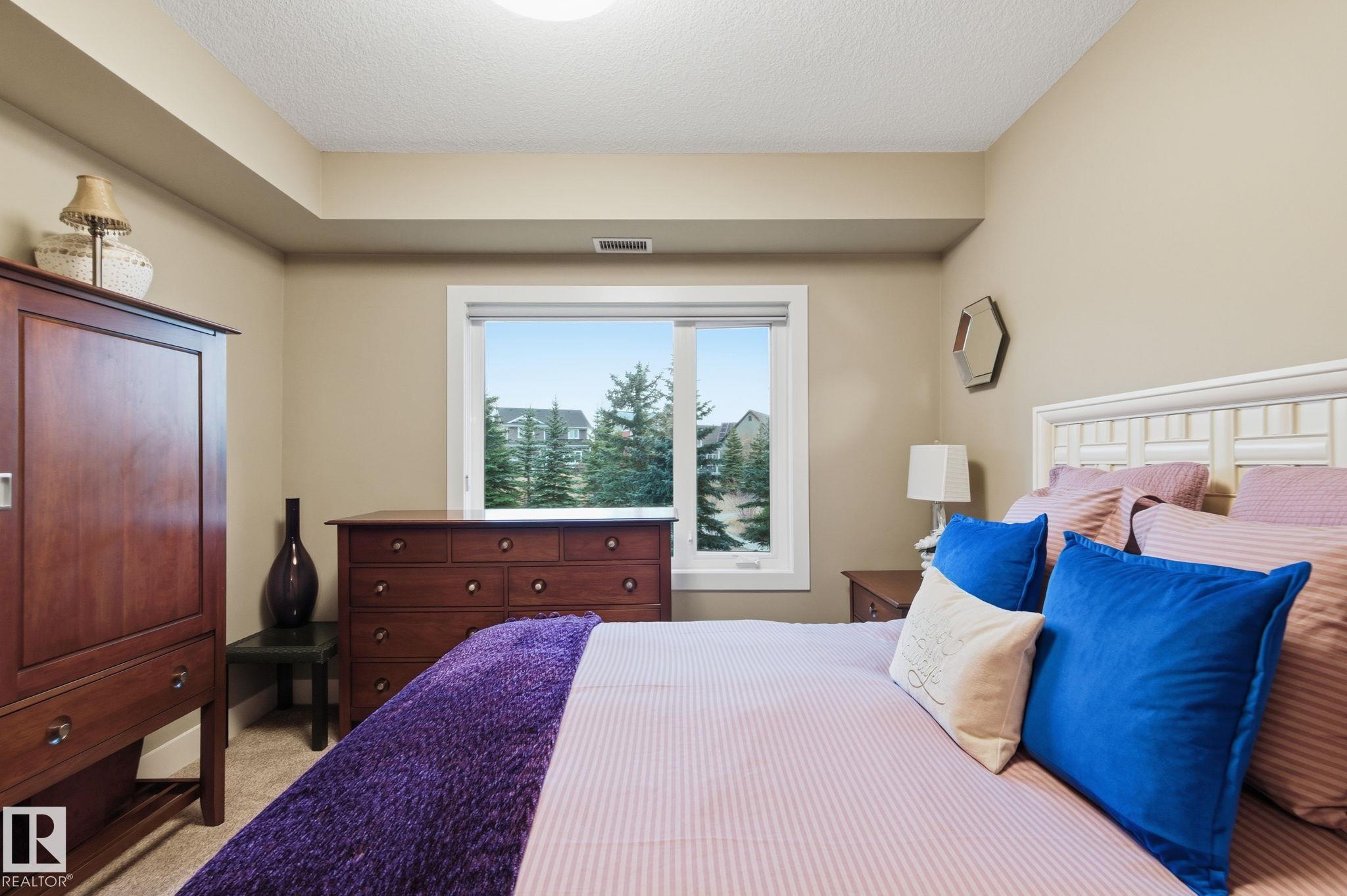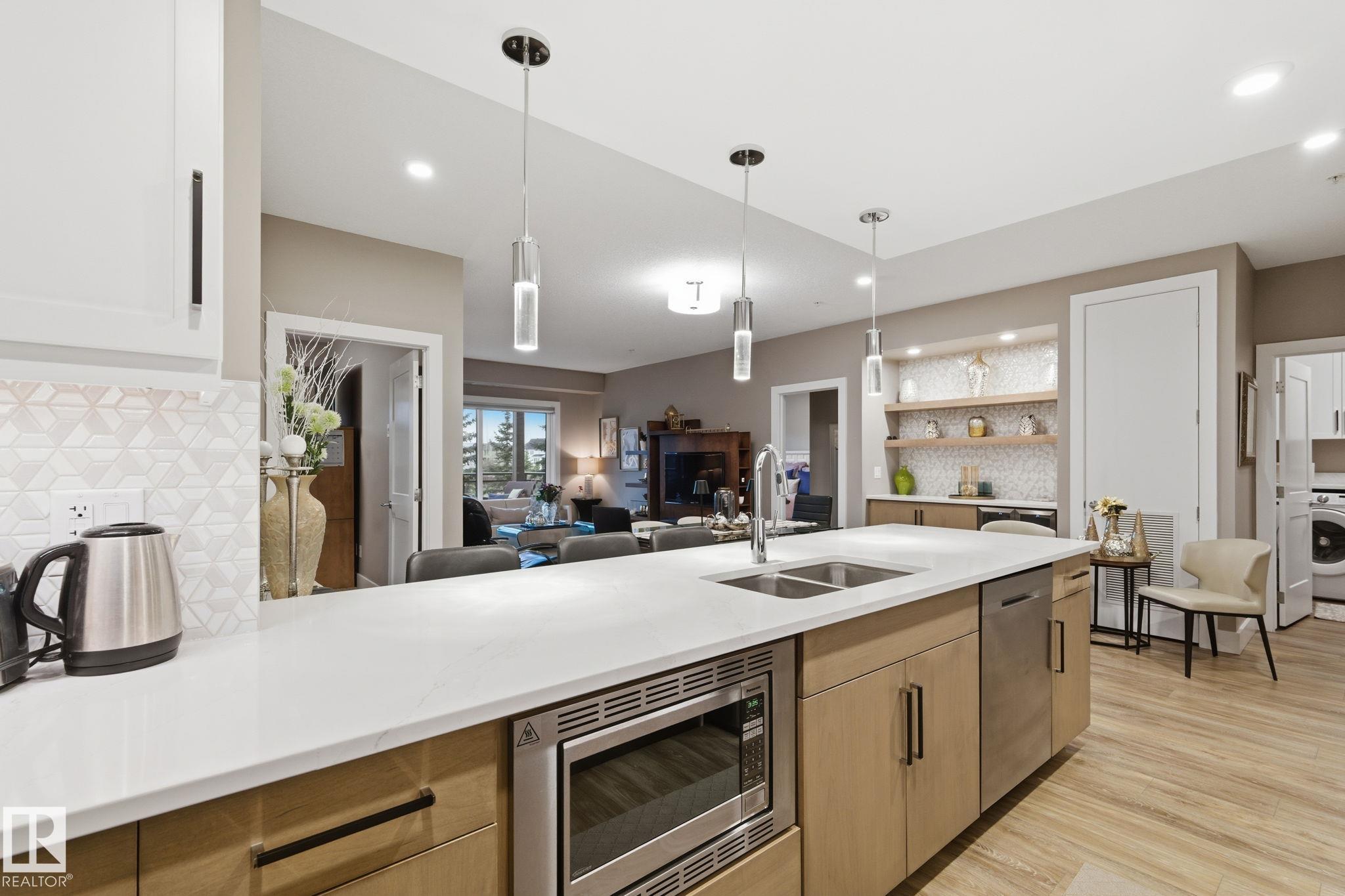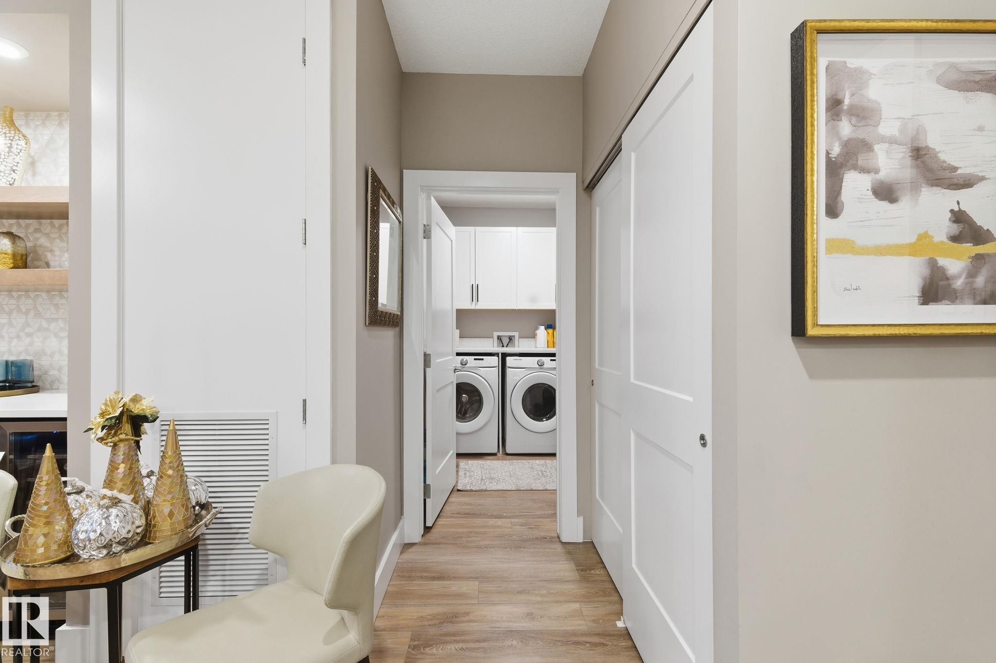 Experience refined luxury living at Veritas, the premier condominium residence in the community of Griesbach. This exquisite former show suite blends elegance and comfort, showcasing over $25,000 in designer upgrades with captivating park and lake views. Thoughtfully designed, this main-floor retreat features gourmet-inspired quartz countertops, a custom laundry room with counter and built-in cabinetry, a pantry, and a stylish bar area with wine fridge. Sophisticated finishes, open-concept living, and serene surroundings create an atmosphere of quiet indulgence. Enjoy the convenience of two titled parking stalls and access to Veritas? exceptional amenities, including a state-of-the-art fitness centre, beautiful social lounge complete with billiard table, and a spacious guest suite for overnight guests. This unit is perfect for discerning professionals or empty nesters seeking a lifestyle of elegance, comfort, and effortless sophistication in one of Edmonton?s most sought-after residences.