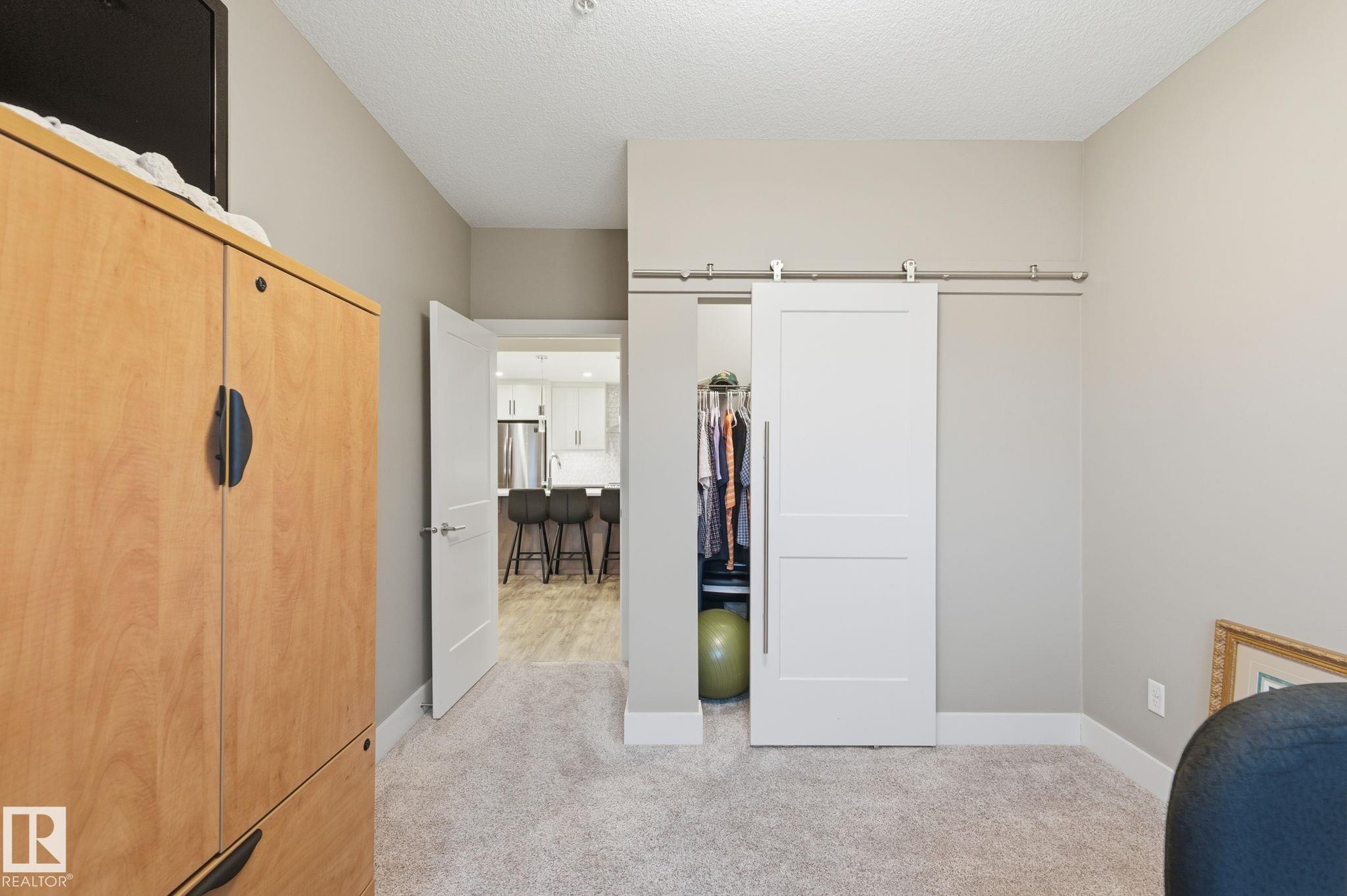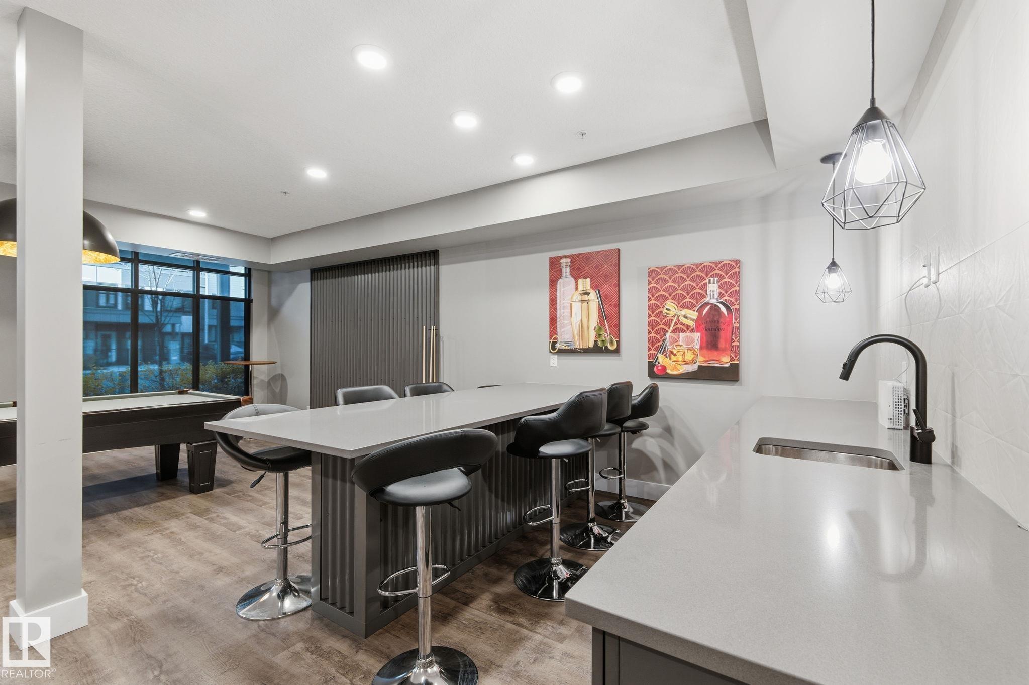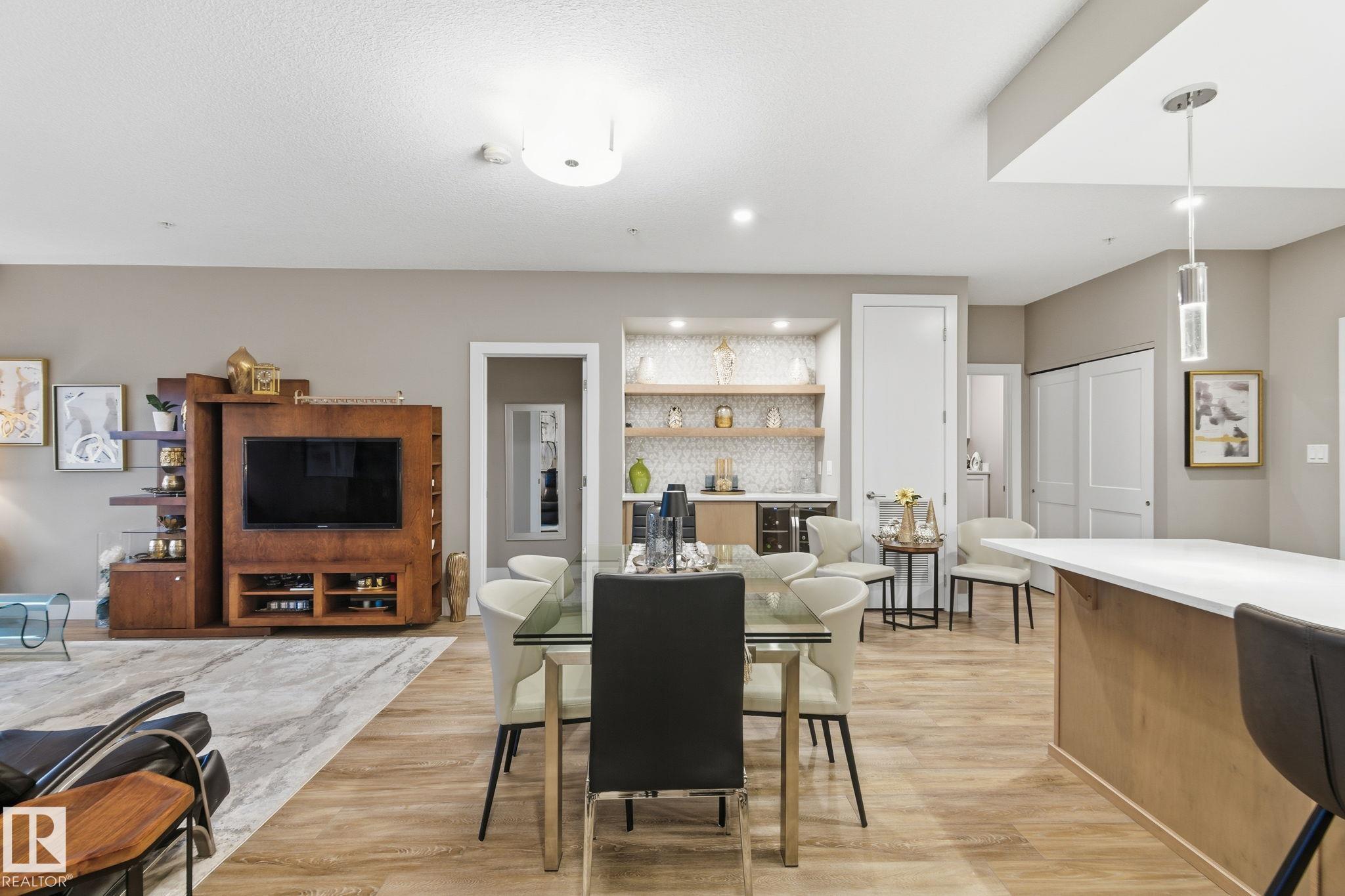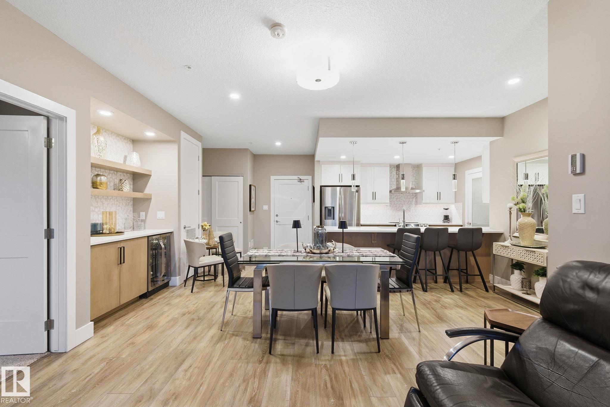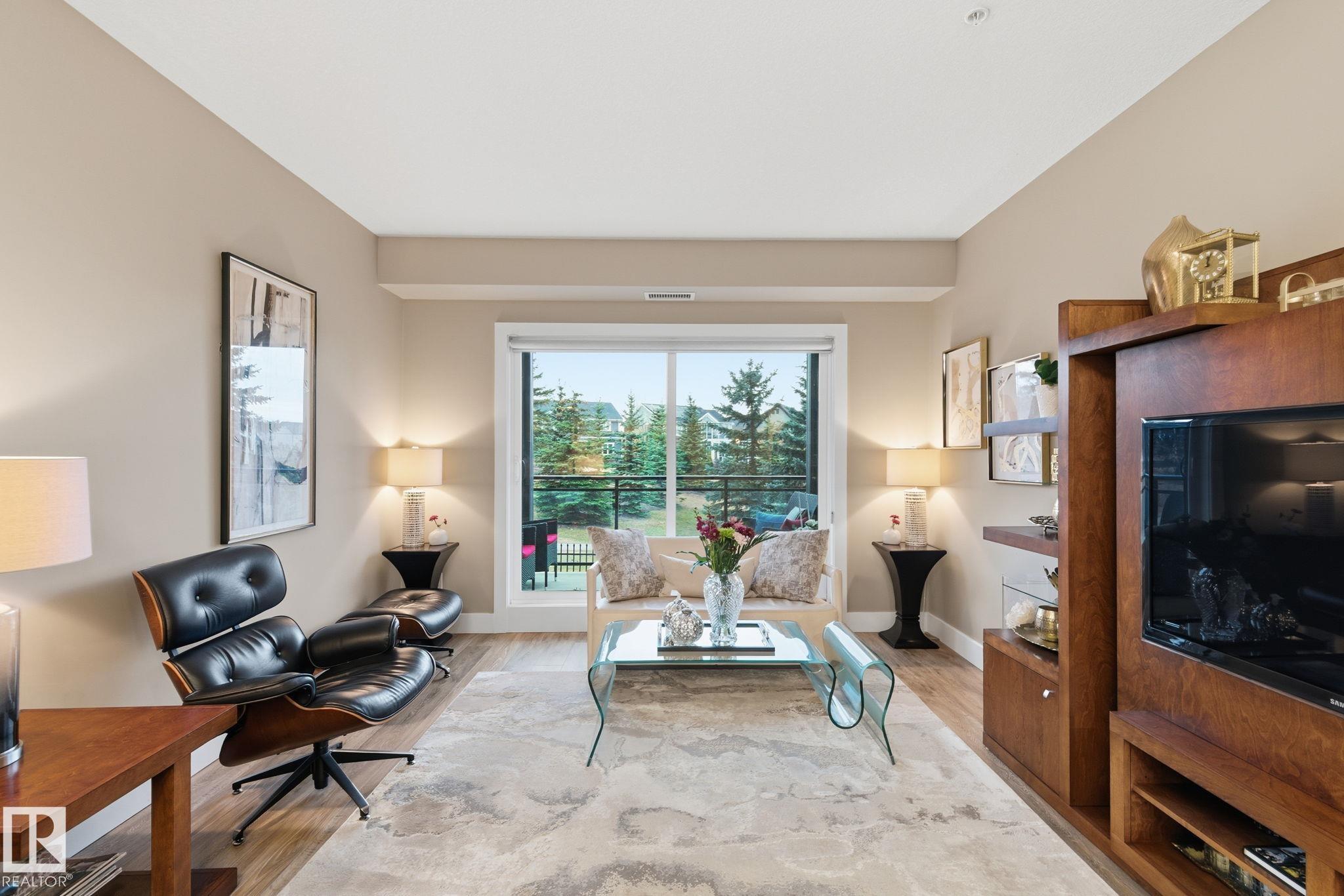 Experience refined luxury living at Veritas, the premier condominium residence in the community of Griesbach. This exquisite former show suite blends elegance and comfort, showcasing over $25,000 in designer upgrades with captivating park and lake views. Thoughtfully designed, this main-floor retreat features gourmet-inspired quartz countertops, a custom laundry room with counter and built-in cabinetry, a pantry, and a stylish bar area with wine fridge. Sophisticated finishes, open-concept living, and serene surroundings create an atmosphere of quiet indulgence. Enjoy the convenience of two titled parking stalls and access to Veritas? exceptional amenities, including a state-of-the-art fitness centre, beautiful social lounge complete with billiard table, and a spacious guest suite for overnight guests. This unit is perfect for discerning professionals or empty nesters seeking a lifestyle of elegance, comfort, and effortless sophistication in one of Edmonton?s most sought-after residences.