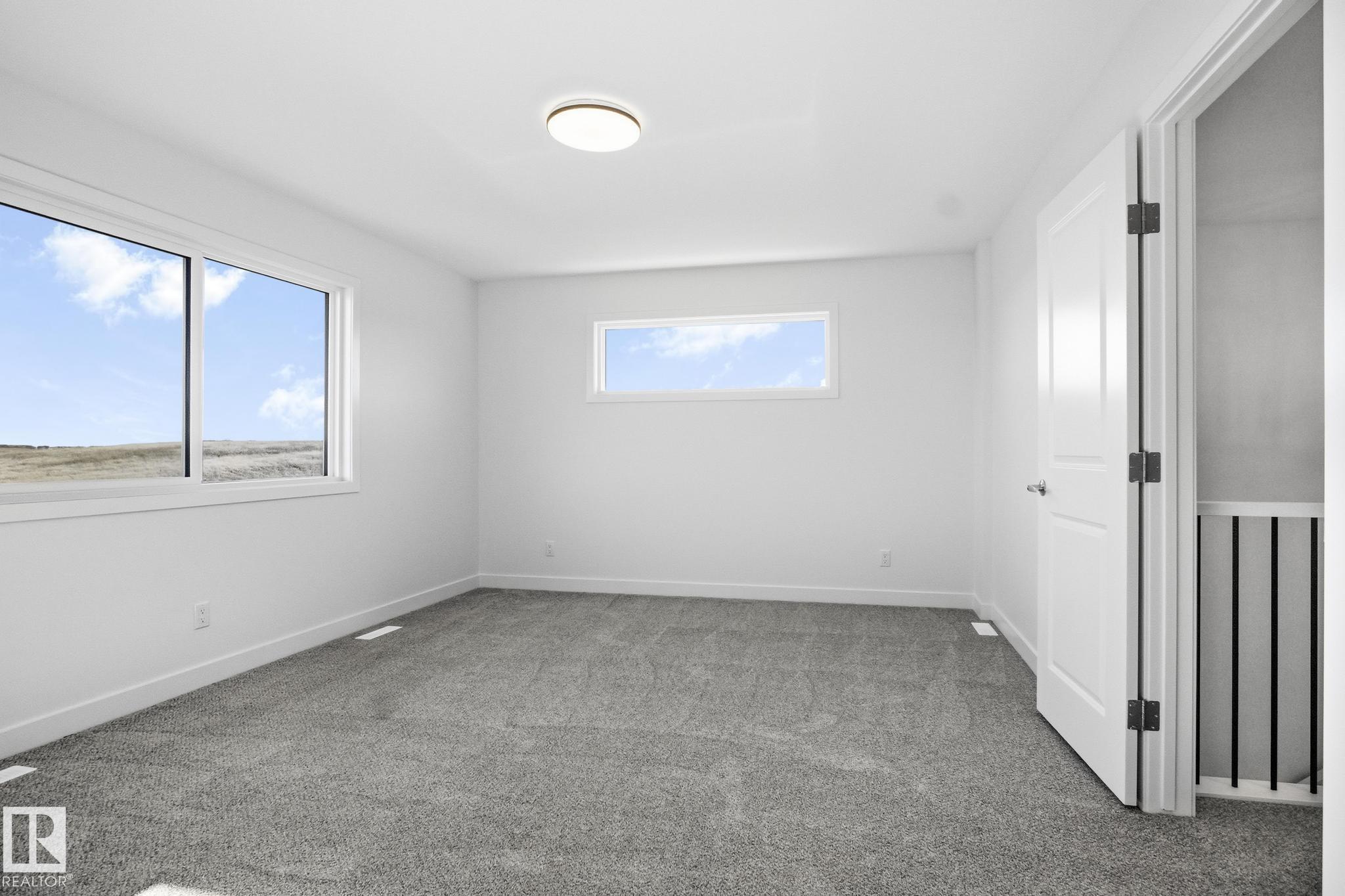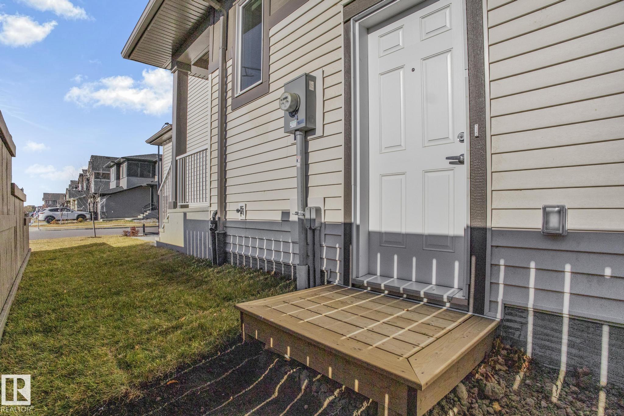 Our popular Rundle model is perfectly situated on a conventional corner lot, within walking distance of the off-leash dog park, playground, and pedestrian corridor in the desirable SW community of Paisley. Enjoy an east-facing backyard with a completed wooden fence along one side and rear fence providing both privacy and style. Inside, the bright living room features extra windows for additional natural light and a modern electric fireplace. The walk-through pantry and walk-through laundry add everyday convenience. An enclosed side entrance offers practicality and excellent potential for future basement development. The designer kitchen showcases 3CM quartz countertops, an undermount Silgranit sink, and modern black pendant lighting above the island. Included appliances are a French-door refrigerator with internal water and ice, dishwasher, electric range, built-in microwave, and a chimney-style hood fan. Upstairs, iron spindle railings replace the standard stub wall, creating a stylish open feel.