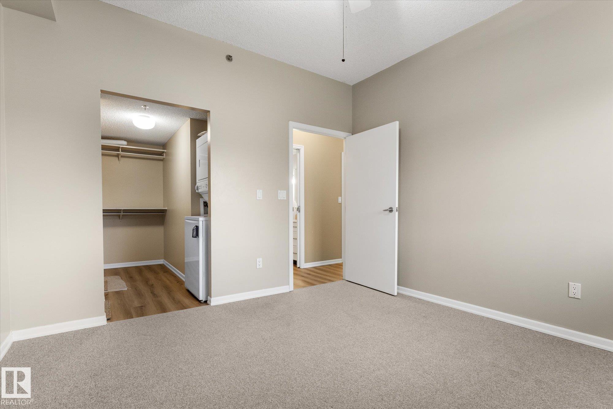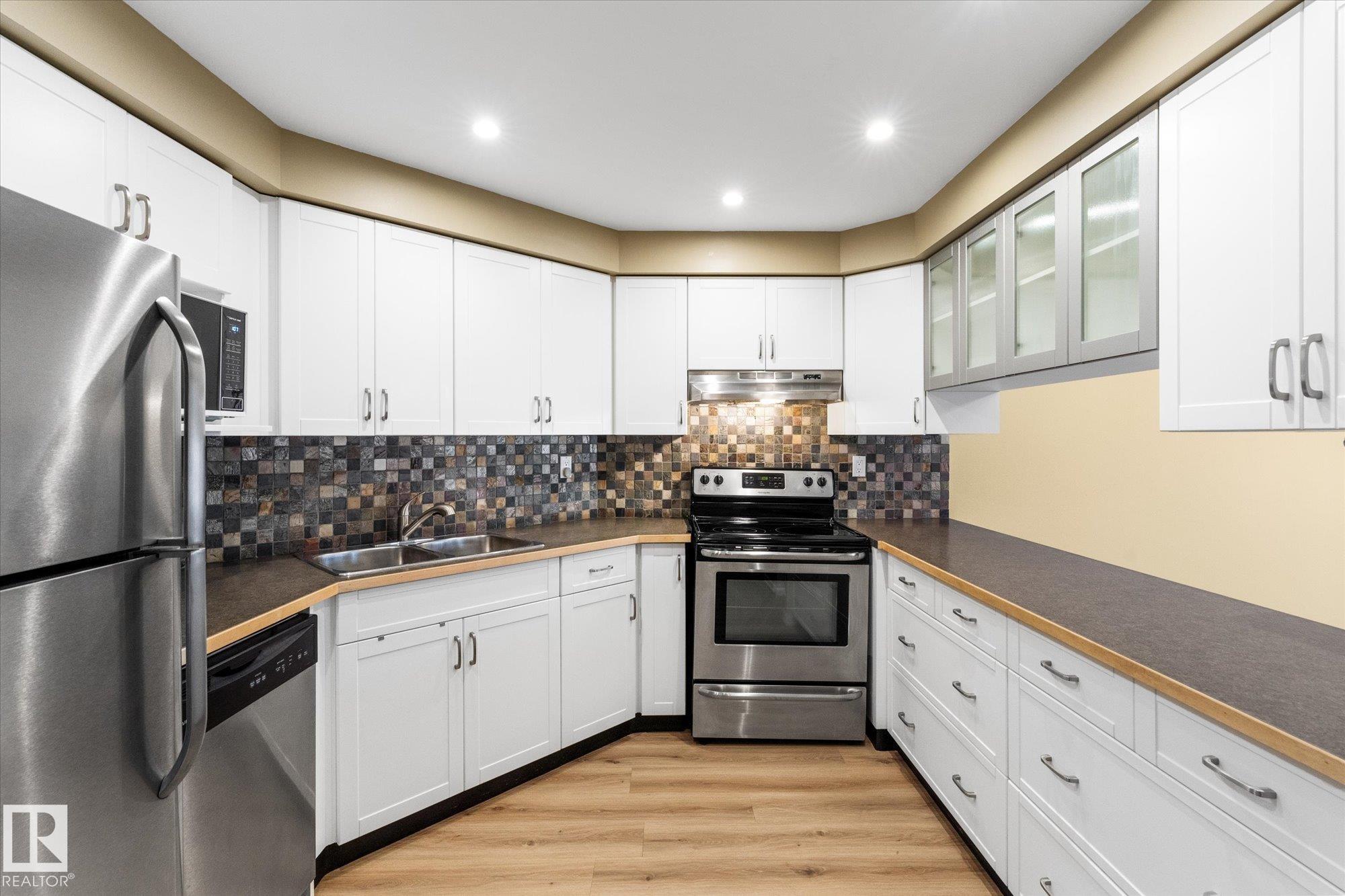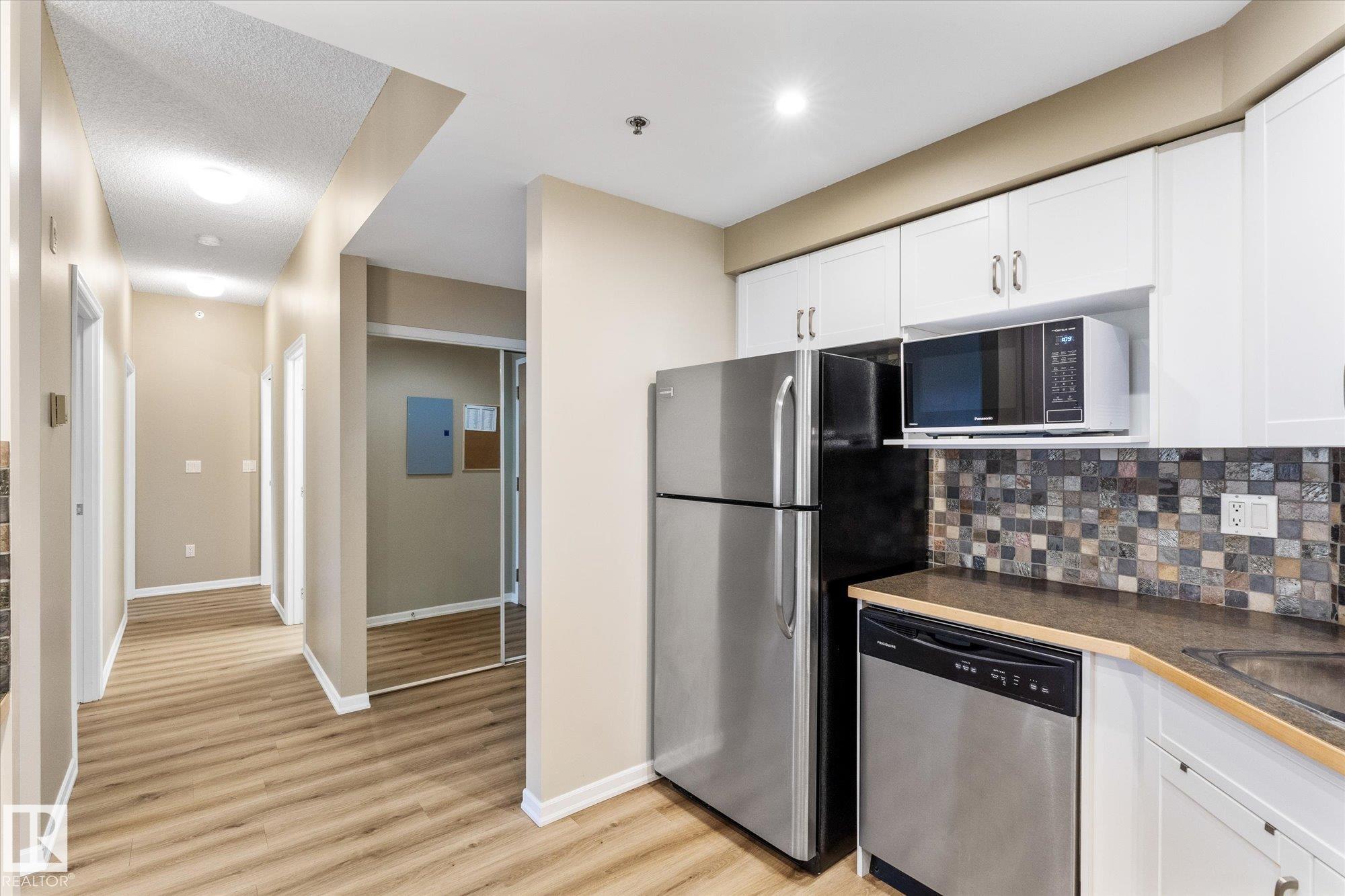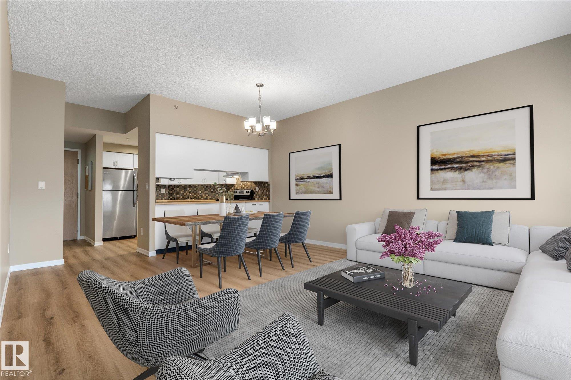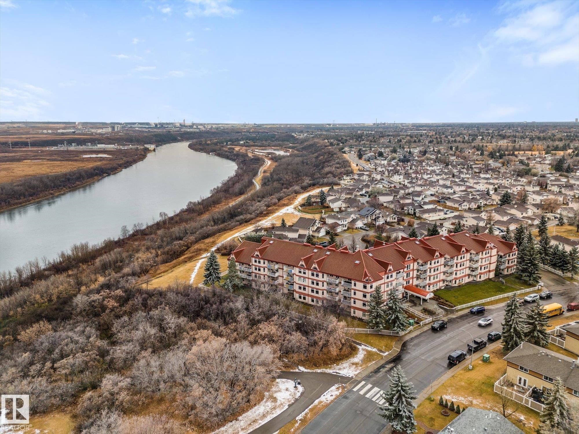 Immaculate and move-in ready! This stunning condo feels like a show suite and is located in a highly sought-after concrete and steel building overlooking Edmonton?s beautiful river valley. The updated kitchen features stylish cabinetry, stainless steel appliances, a designer hood fan, and endless counter space that opens to a spacious dining area and bright living room. Large windows flood the space with natural light, and a garden door leads to your patio. Recent upgrades include brand-new vinyl plank flooring throughout. The primary bedroom offers a large walk-in closet with convenient in-suite laundry, plus there is a 2nd bedroom down the hall, additional storage room, and a separate storage cage on the basement level. Heated underground parking includes a car wash bay, and owners enjoy top-tier amenities: library, social lounge, billiards room, craft space, and workshop. Steps from river valley trails, shopping, and transit, this one truly checks all the boxes!
