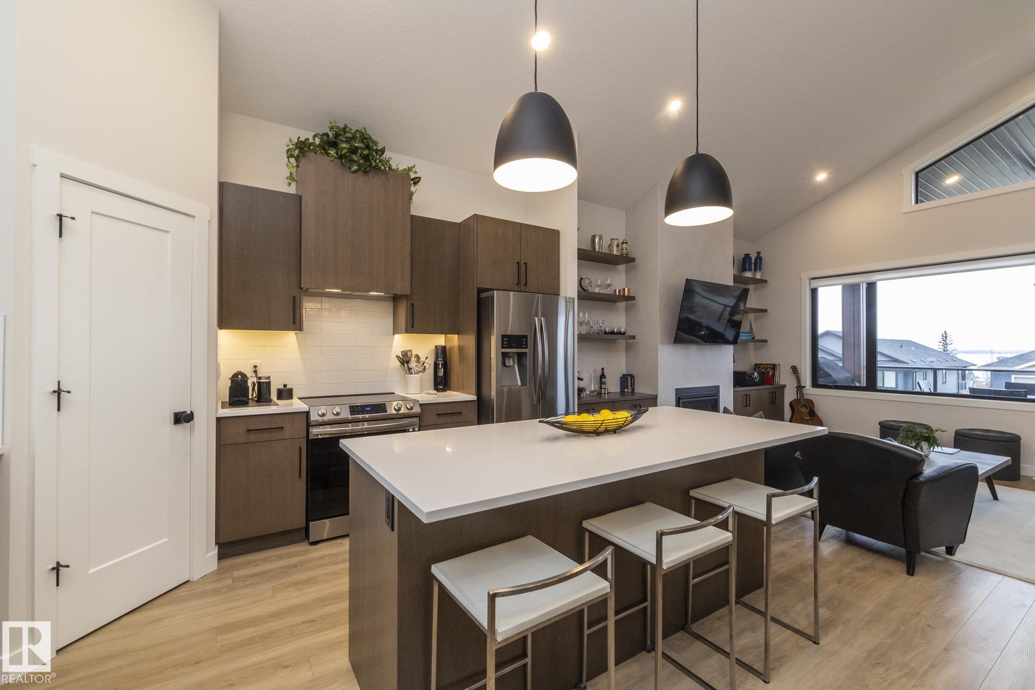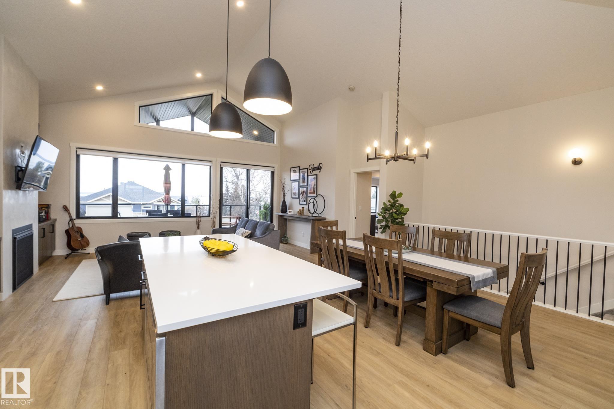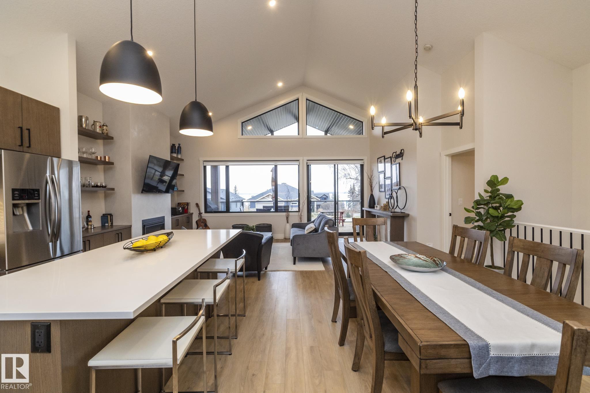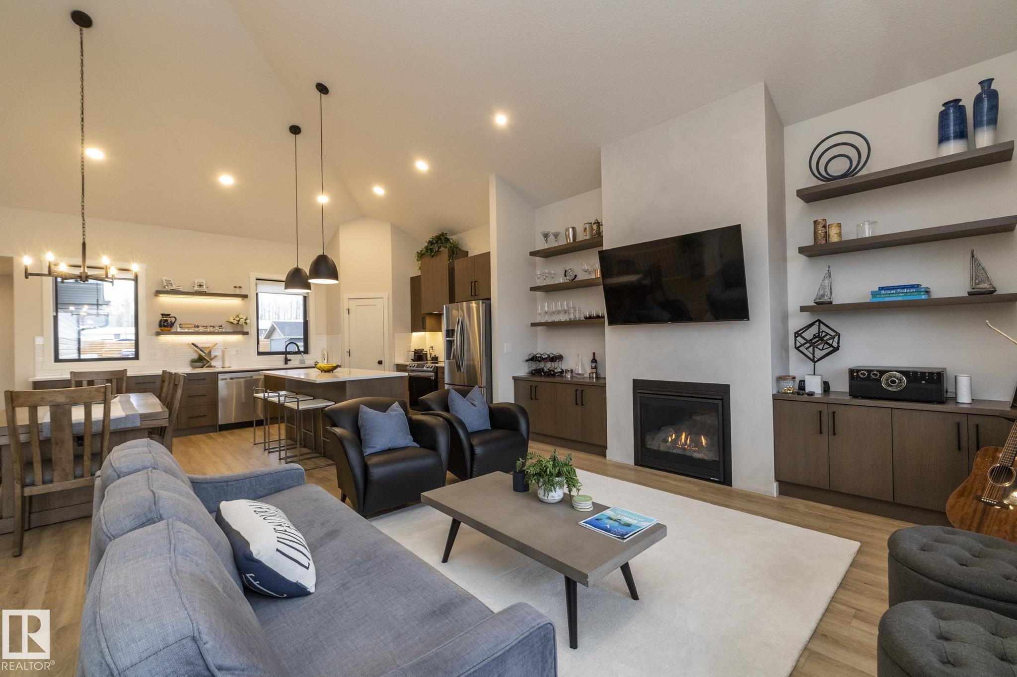 Welcome to The Estates at Waters Edge, a lakeside community with marina, outdoor pool and beachside park! This WALK OUT BUNGALOW features 4 bedrooms, 3 bathrooms, dbl attached garage and sits at over 1400 sqft with a total of 2800 sqft of living space with the walkout BSMT. Upon entering this home you are greeted with vaulted ceilings and contemporary finishings, luxury vinyl plank flooring, and STUNNING lake views! The spacious open concept main floor boasts a chefs kitchen with stone counters, beautiful cabinetry, SS appliances, floor to ceiling fireplace in living room with access to your outdoor patio, PERFECT for entertaining! The master suite features SPA like ensuite, walk-in closet and spacious bedroom with tons of natural light and patio access. Finishing off the main level is the second bedroom, main bath and laundry room! The walkout bsmt continues the entertaining ease with LARGE rec room, 2 more bedrooms and full bath! Outside is fully landscaped with over 80k of upgrades and irrigation!!