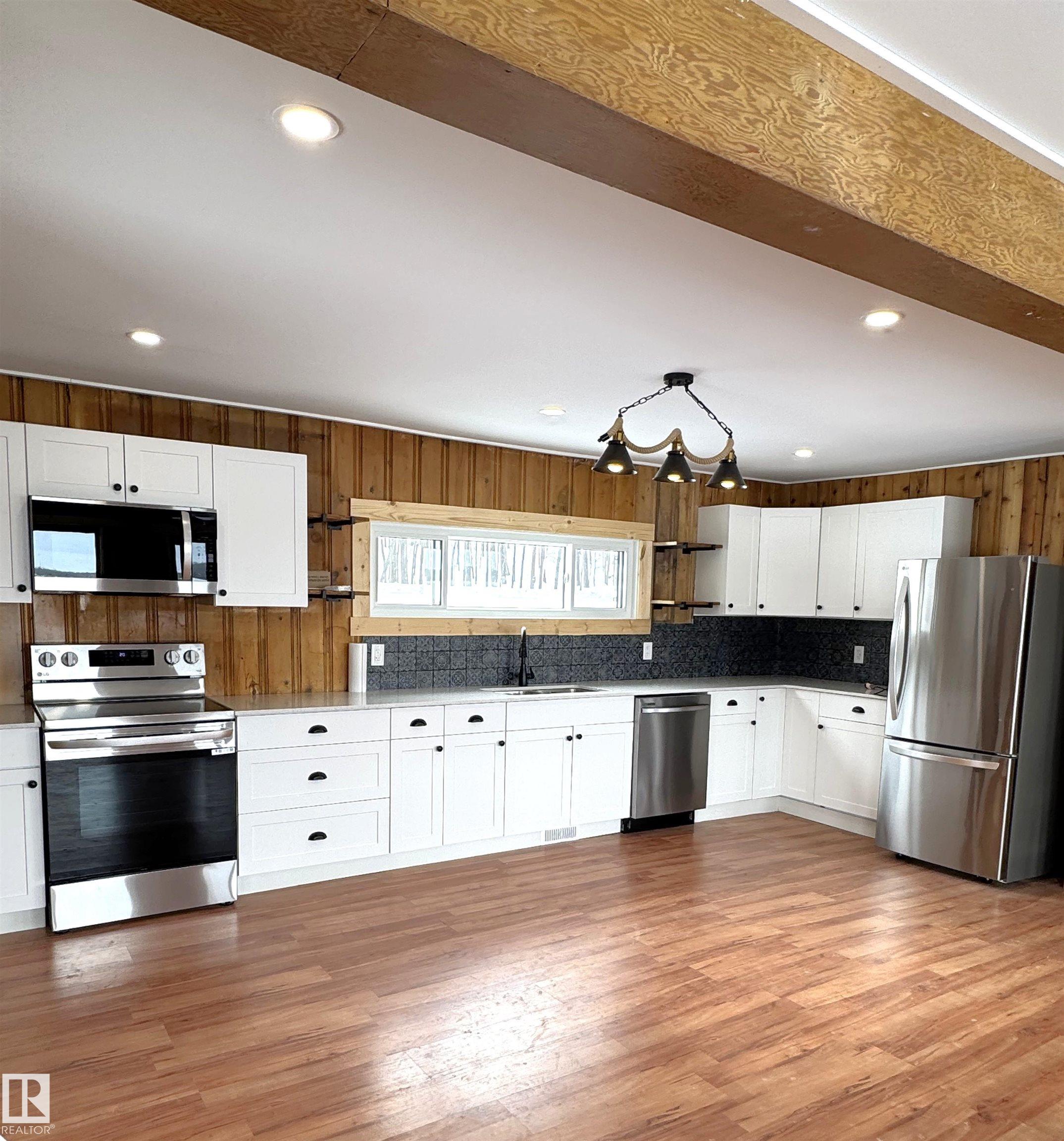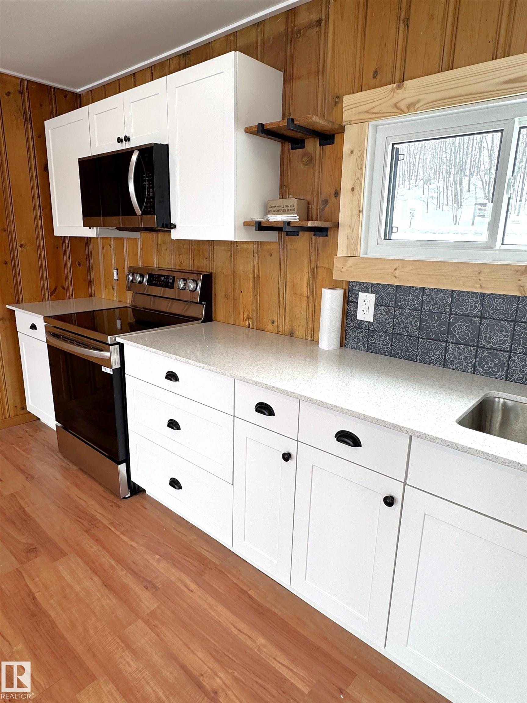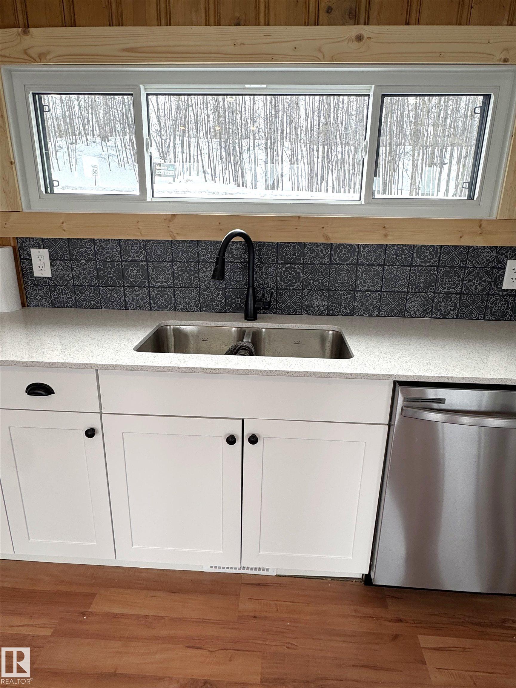 DOUBLE LAKEFRONT LOT! This home was renovated in 2025 with new windows, new kitchen-including soft closing cabinets and granite counter tops, new appliances, new furnace. The upgrades match the original cabin style with a large free standing wood stove in the Livingroom. The bathroom was nicely upgraded with a bright clean white finish. This home is all about the peaceful lake views and lots of natural light. The lot was recently cleared and finished with landscaped flower beds allowing for an open view of the lake. The floor will stay toasty warm all year round with the recently insulated crawl space. You can enjoy the peace and quiet in the very friendly community of Sandy Beach. Seller is offering $5000 towards moving costs.