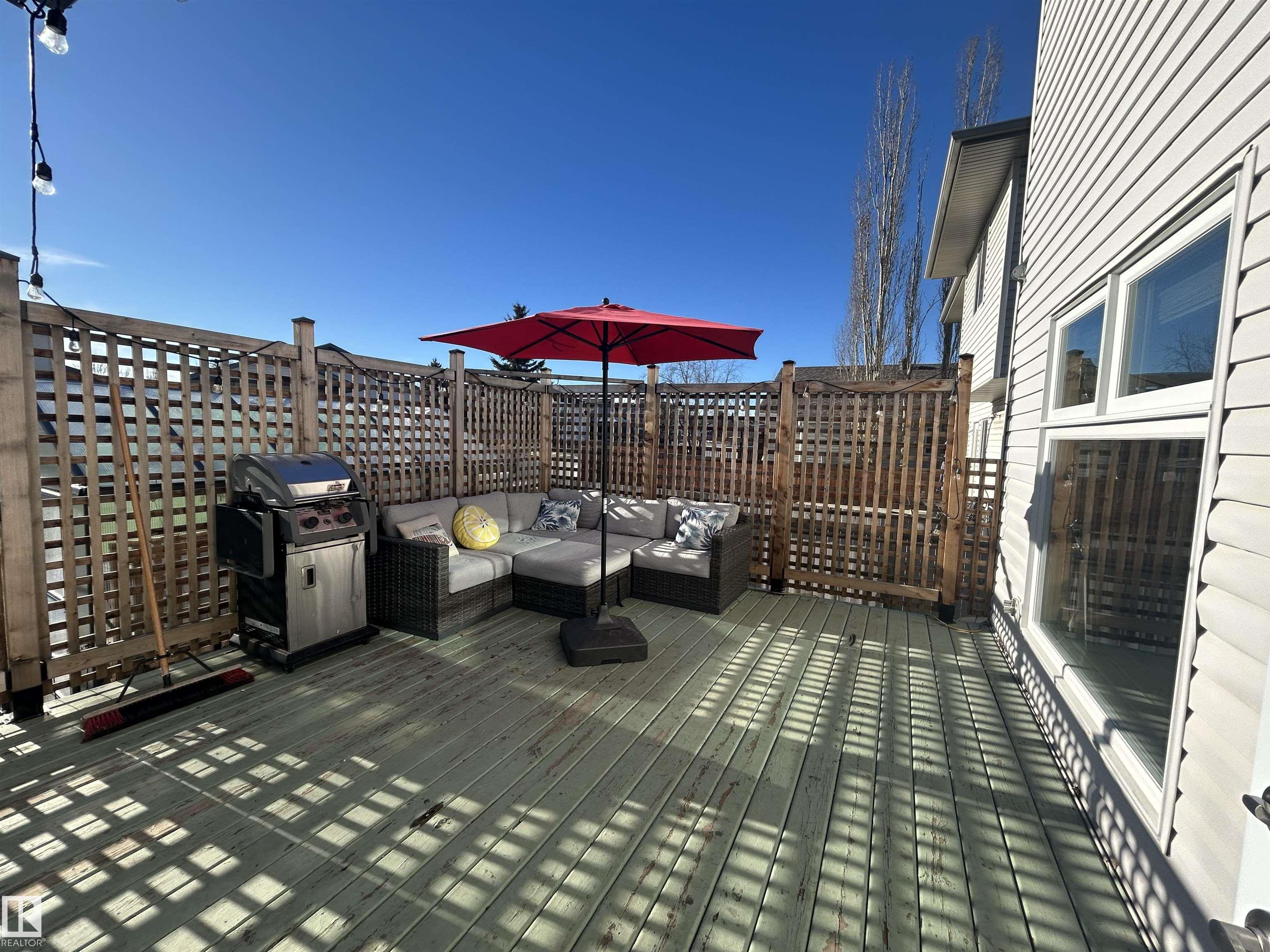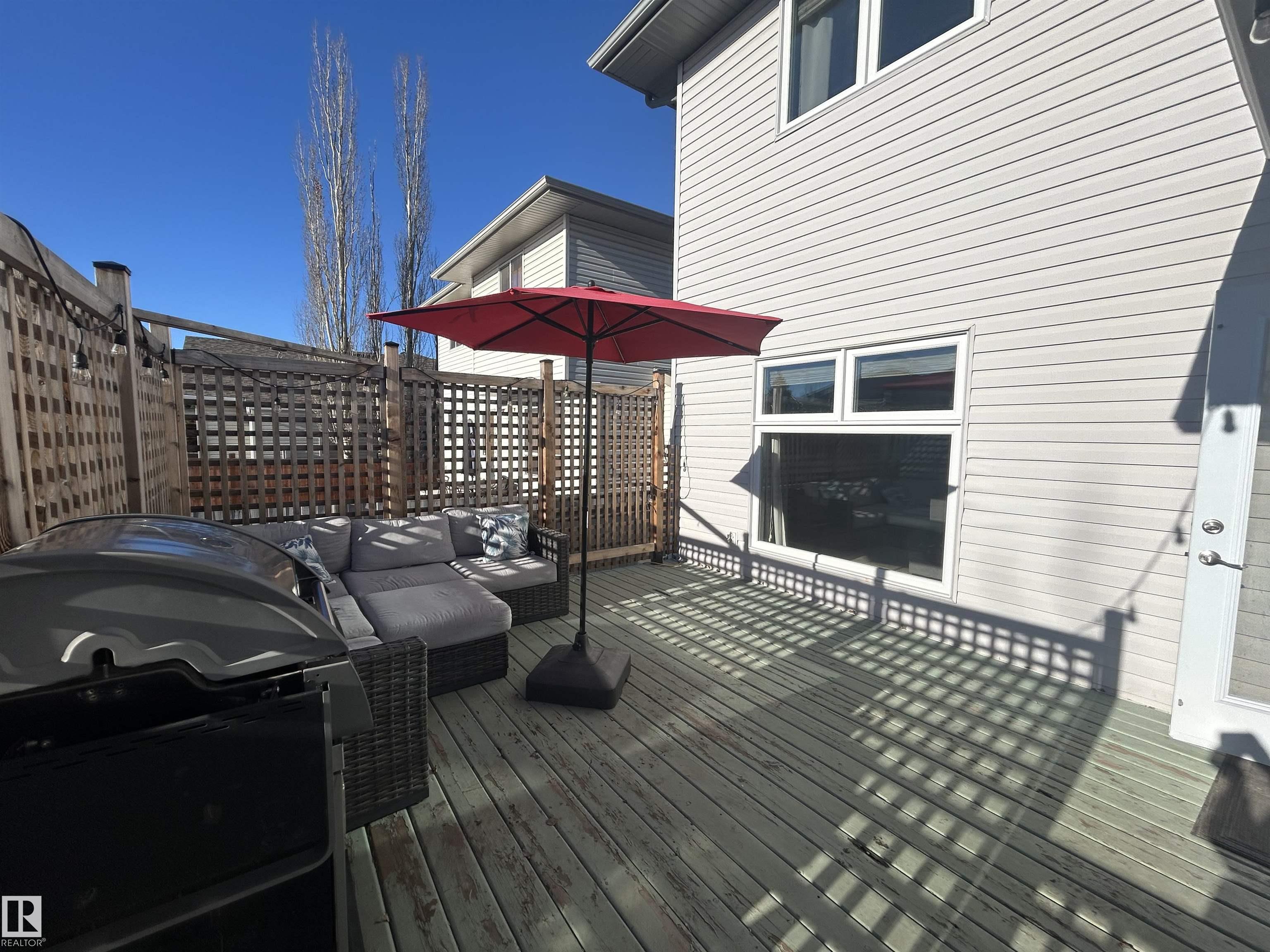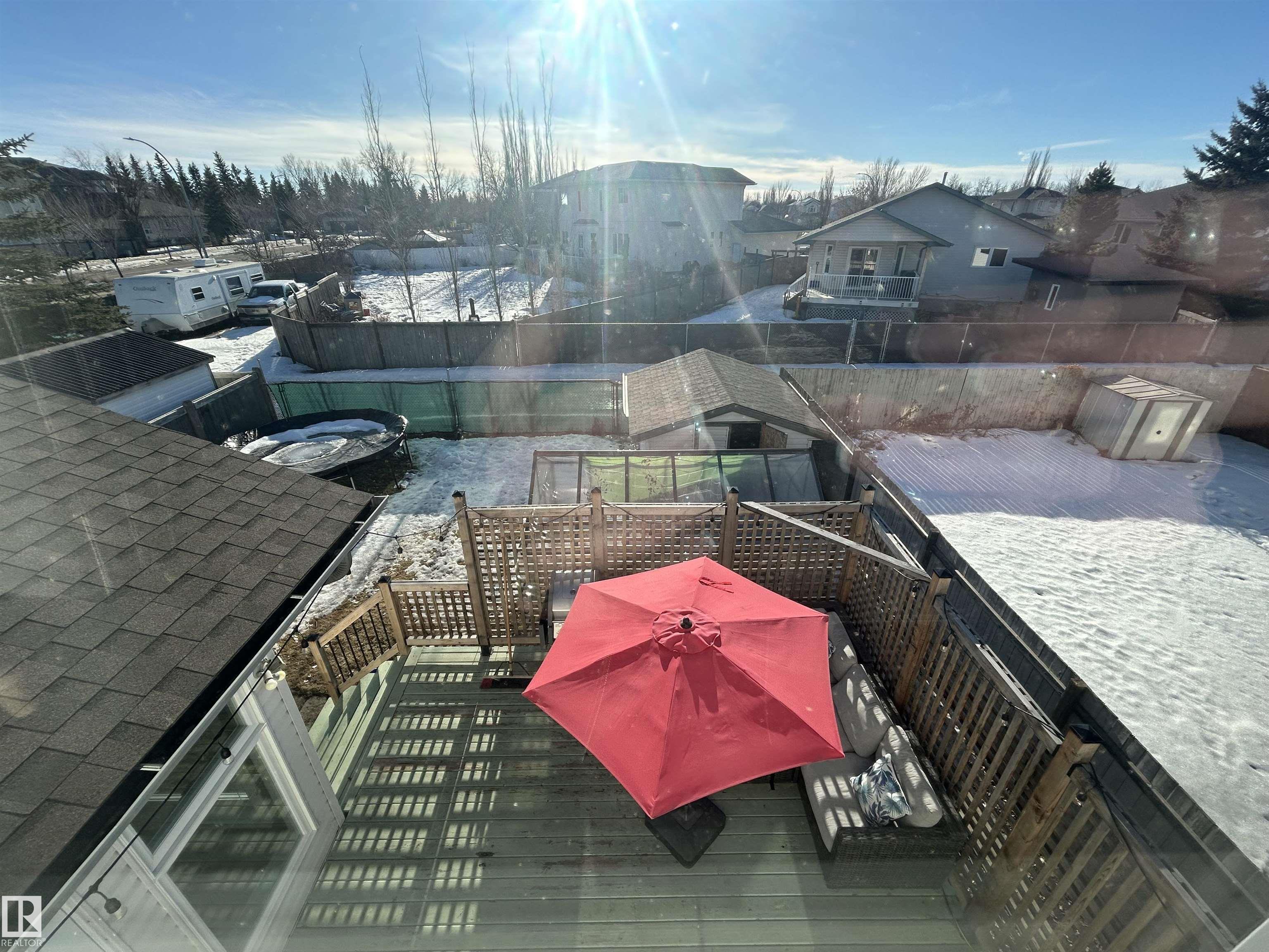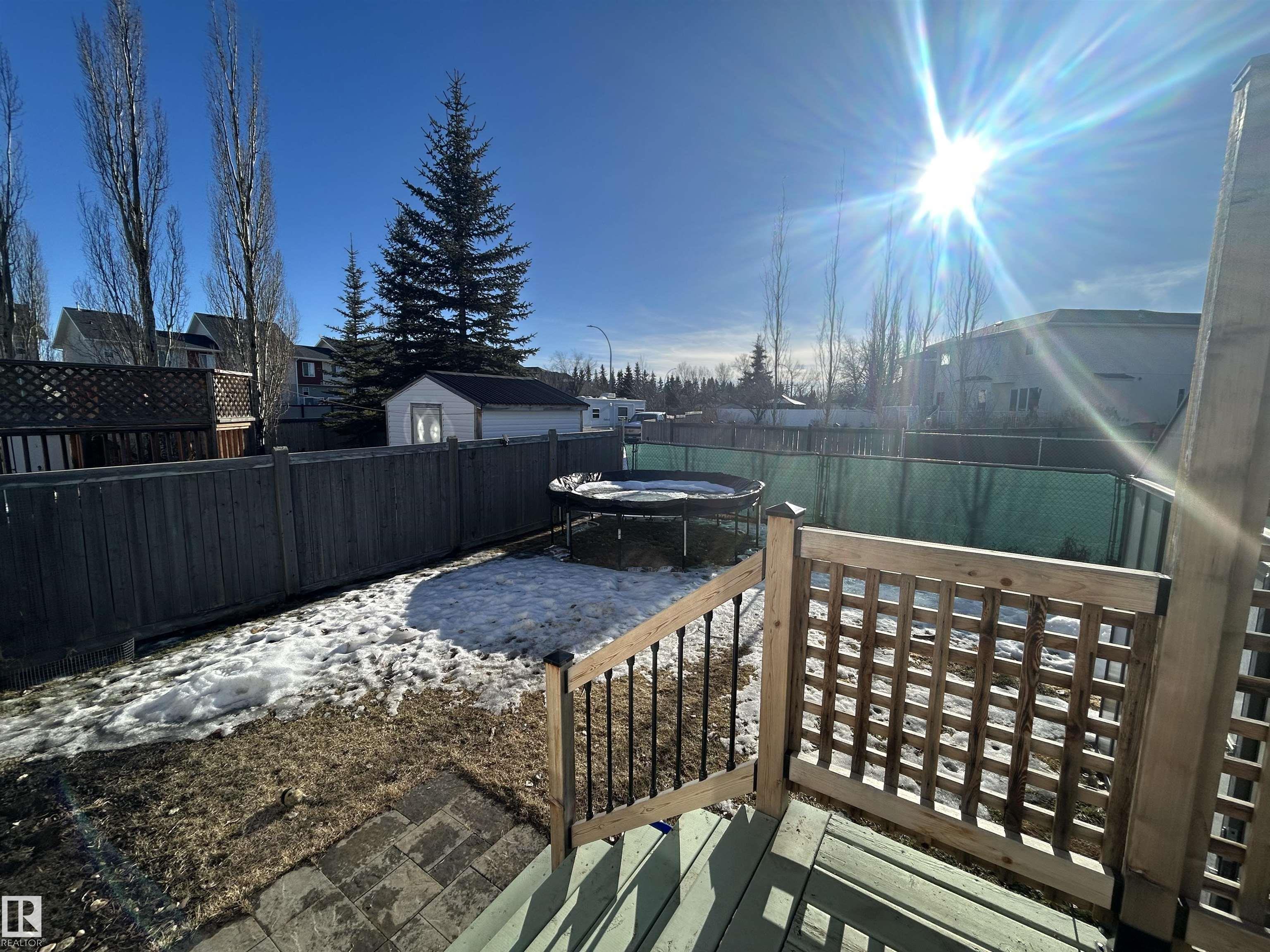 $50,000 in recent renovations! ALL new triple pane windows, NEW HE furnace & NEW shingles! Air Conditioned & across the street from a park & greenspace this beautiful home offers a super functional layout, open concept main floor w/full wall of huge windows, SW exposure floods the home in natural light, loads of cabinetry, island w/ extended eating bar, walk thru pantry, open to dining nook with Garden door access to attached back deck & fenced and landscaped yard w/handy back alley access, open to living room anchored by GAS fireplace w/mantle, down hall to 1/2 bath & laundry, upper level w/big vaulted bonus room. 3 bedrooms, primary ensuite with jetted tub & shower, other 2 rooms a good size & share a 4 piece bath, framed basement being used as a big playroom with carpeting & offers loads of framed in storage. Close to schools, around the corner from shops and restaurants, easy access to Edmonton and the international airport. Nothing to do here but move in and enjoy!