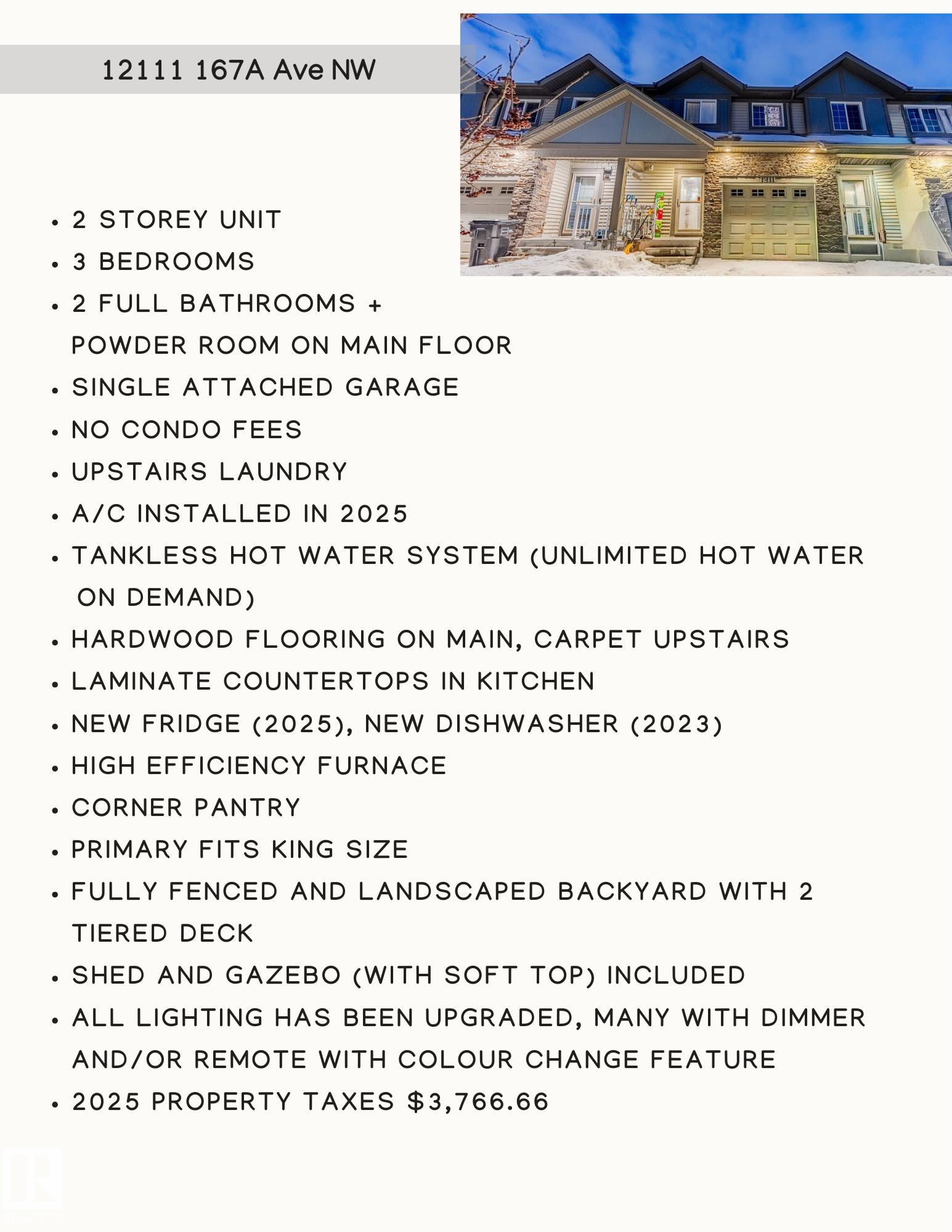 3 bed, 2.5 bath, 1415 sq ft PLUS partially finished basement (554 sq ft). 2 storey townhome w/single attached garage and NO CONDO FEES. Bsmt just needs ceiling & bathroom (roughed in for full bath). Genuine hardwood flooring throughout entire main floor. Kitchen has ample counter/cupboard space, & island seating. Living & dining room off the kitchen open onto patio doors. Private backyard is fully fenced & landscaped, w/2 tiered deck. Shed & gazebo (w/soft top) stay. Top floor features enormous King-sized Primary, w/4 pc ensuite & walk-in closet. Primary enjoys views of Canada Day & NYE fireworks. TOP FLOOR LAUNDRY, 2 addt?l bdrms, & full bath provide privacy to Primary. Upgrades: Central A/C (2025), fridge (2025), dishwasher (2023), tankless HW system (unlimited hot water on demand). High efficiency furnace. Digital thermostat. All lighting upgraded, & many are on dimmer and/or remote (w/colour change feature). 2025 property taxes $3,766.66. Lot size 207m2/2200 sq ft. Possession is flexible.