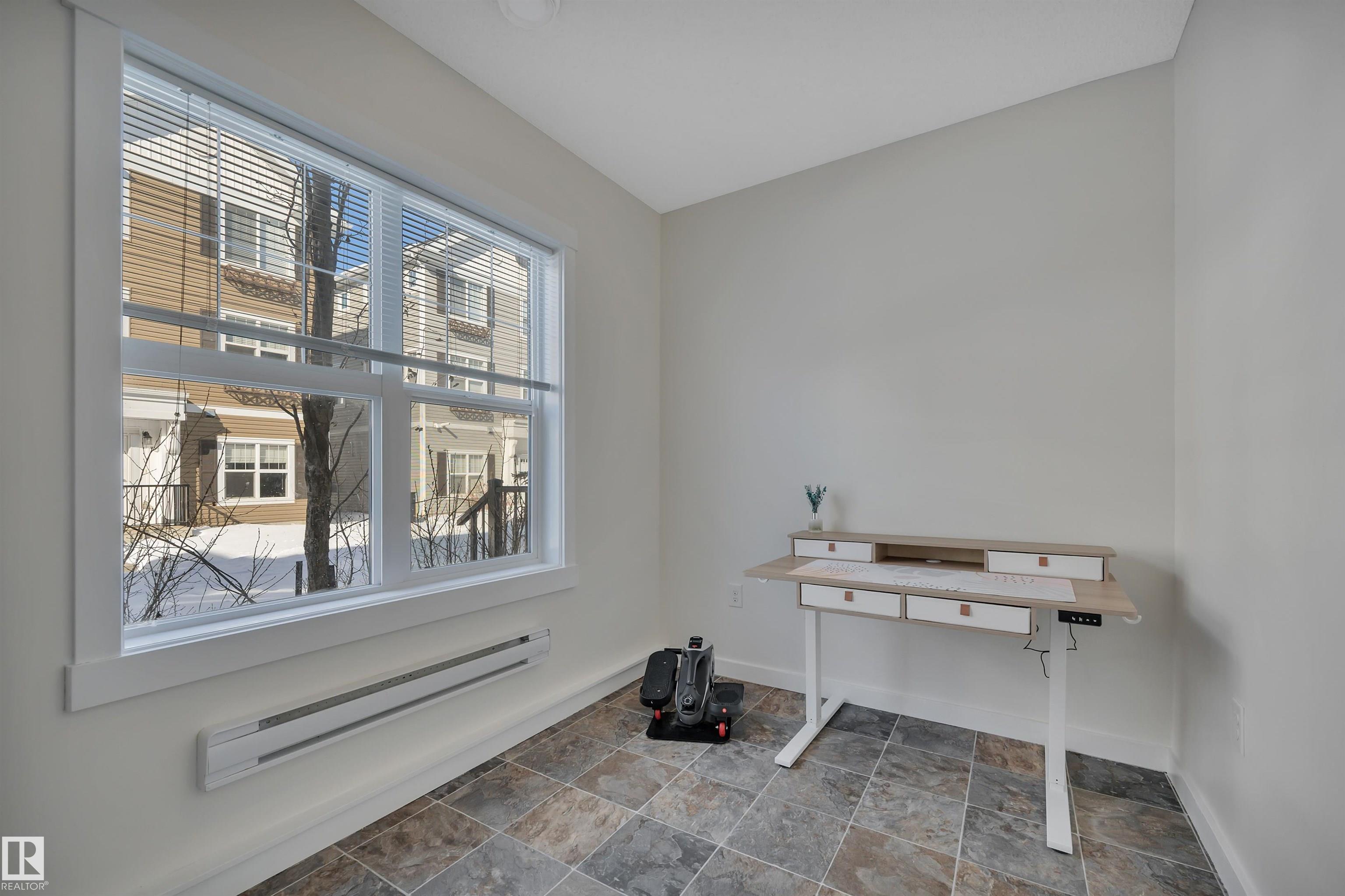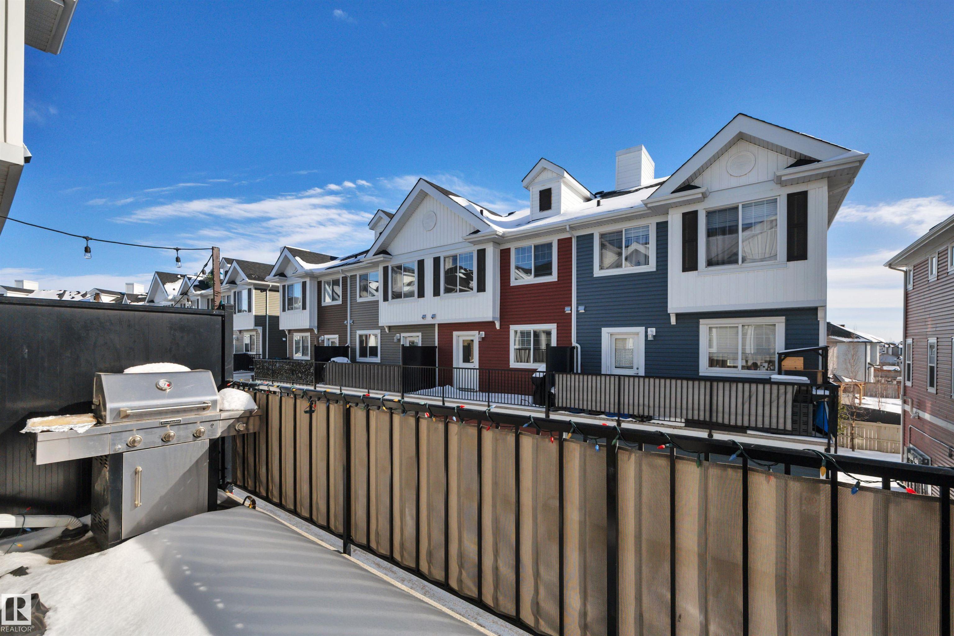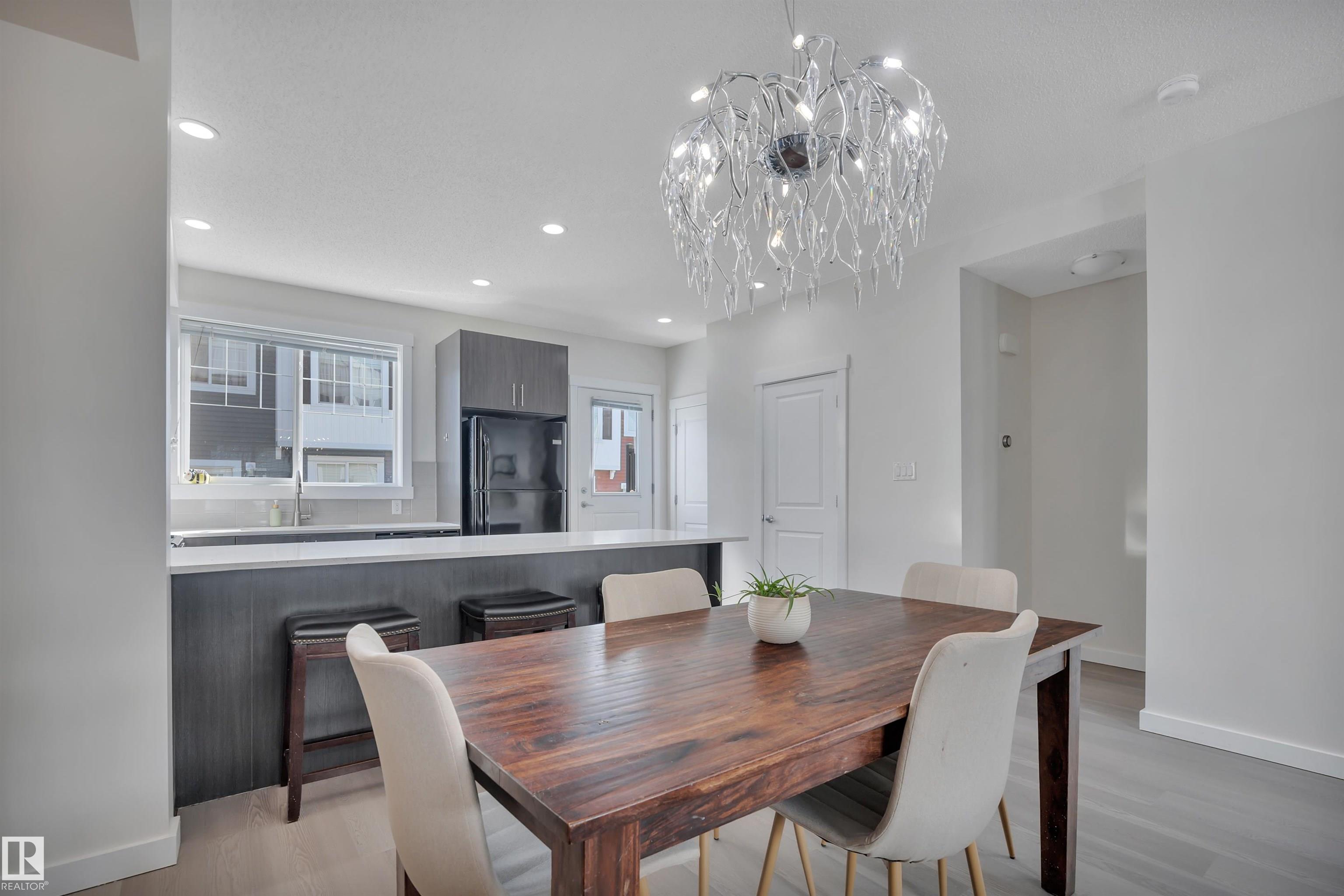 Welcome to this fully finished townhouse with a double attached garage and stylish upgrades throughout. Enter from the garage into a spacious den that doubles as the perfect guest entry. This versatile space is ideal for a home office, studio, or home nail salon. Upstairs, the bright main floor features beautiful vinyl plank flooring throughout with no carpet anywhere in the home. Large windows fill the open layout with natural light. The U-shaped kitchen offers rich espresso cabinetry, white granite countertops, and an extended eating bar perfect for casual meals or entertaining. The kitchen flows seamlessly into the dining and living areas and provides access to a patio just off the kitchen,ideal for summer gatherings. A 2-piece guest bath completes this level. The upper floor features a spacious primary suite with two closets and a private 3-piece ensuite. Two additional generous bedrooms share a 4-piece bath, and the laundry area is conveniently located upstairs. Fresly painted and move in Ready.