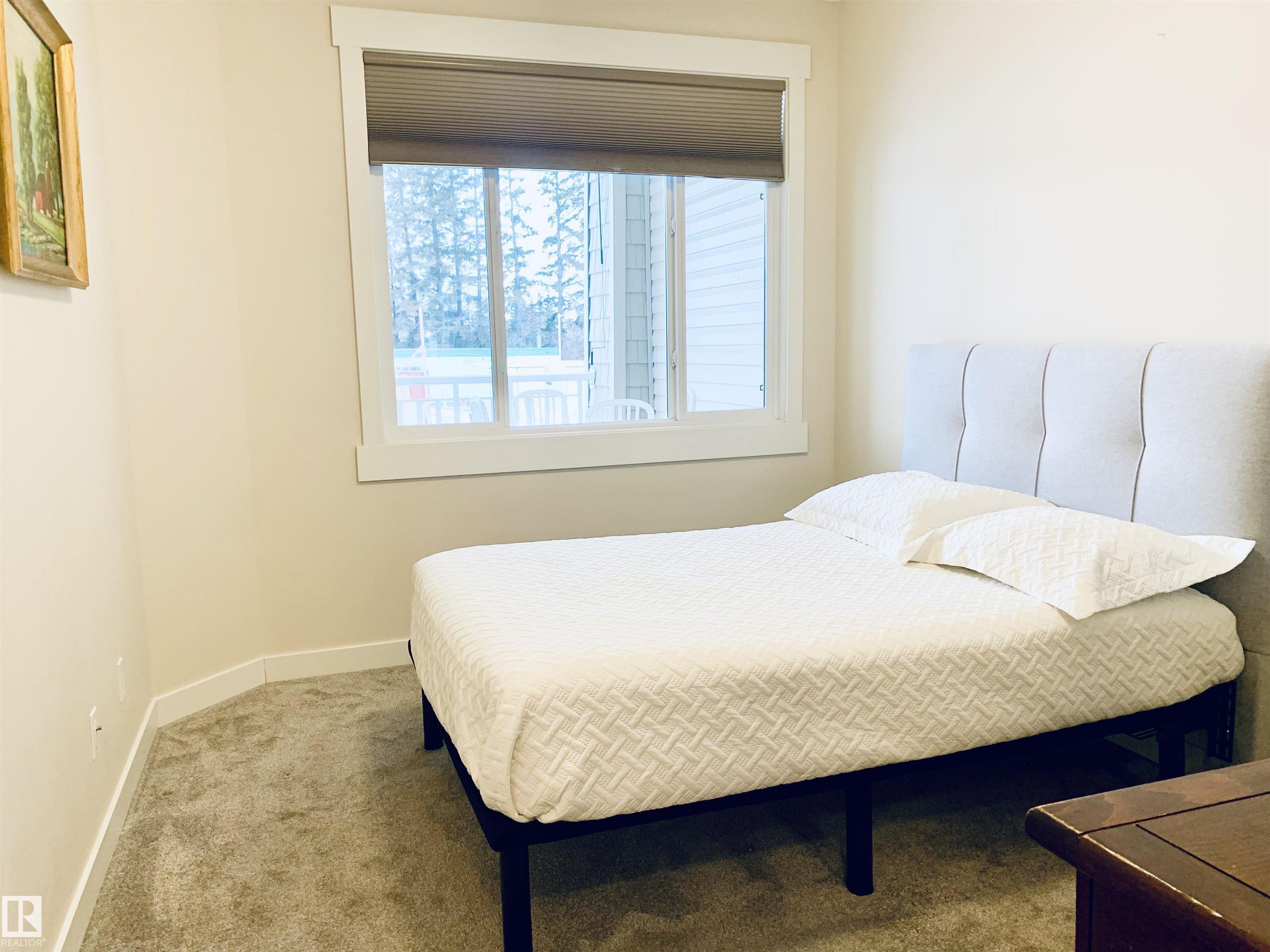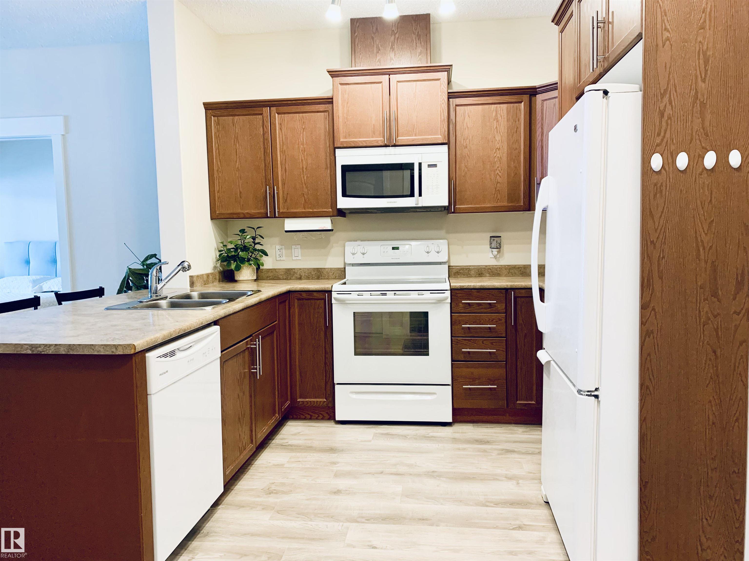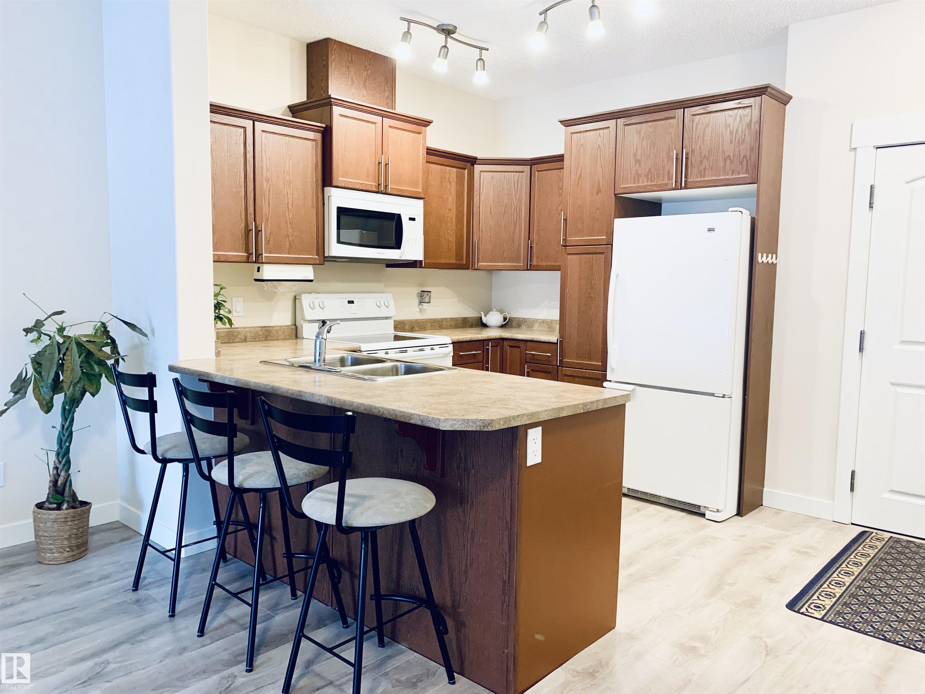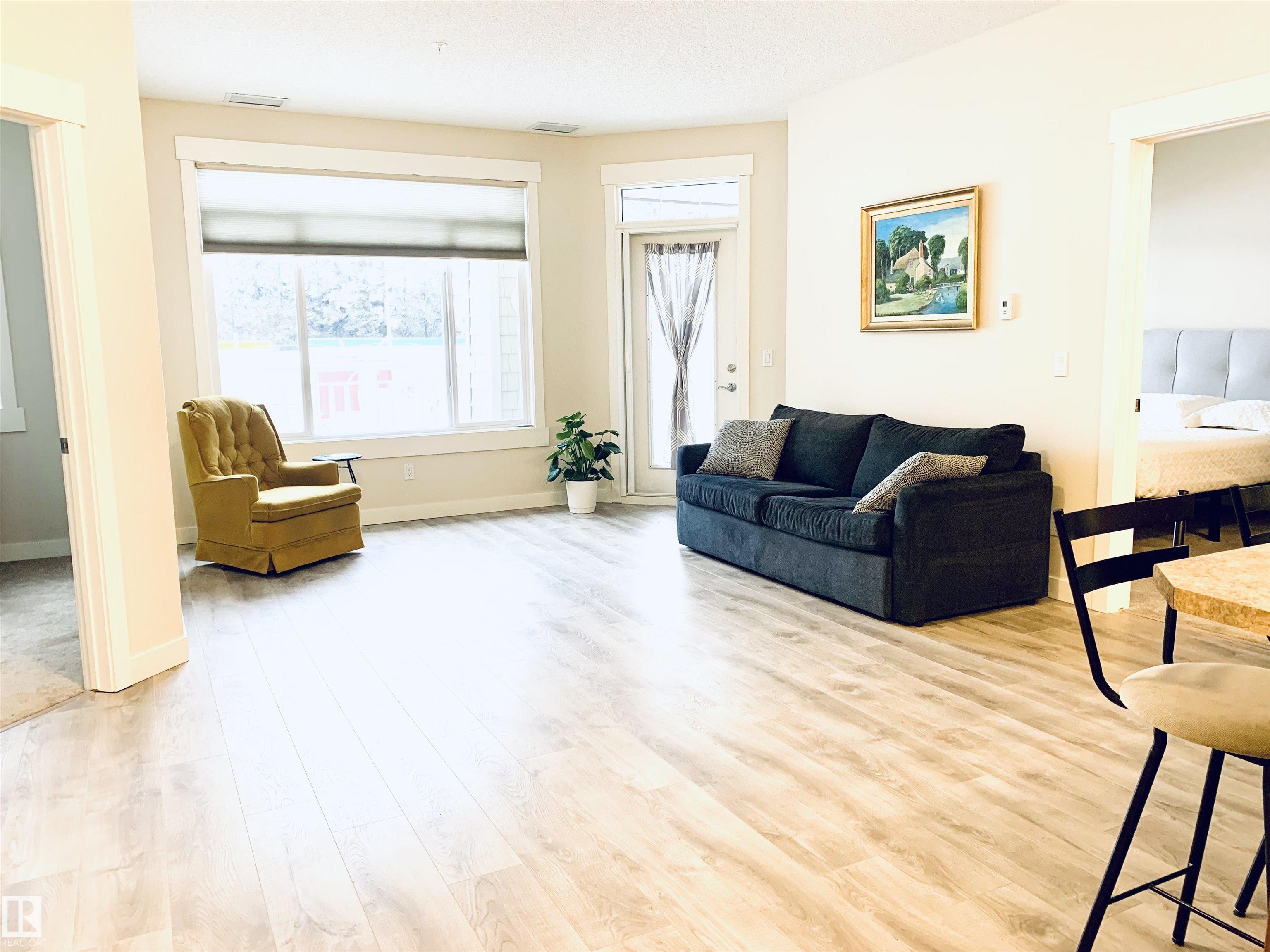 Welcome to #116 at Windsor Estates, a well-maintained 55+ adult living condo in Spruce Grove. This bright 2-bedroom, 2-bathroom home offers 891 sq. ft. of functional living space. The primary bedroom features a walk-in closet and 3-piece ensuite with walk-in shower, while the second bedroom is steps from the 4-piece main bath. Upgraded flooring and fresh paint were completed in Fall 2024. Enjoy large windows, an extra-large west-facing covered balcony, in-suite laundry with storage cabinetry, air conditioning, and heated underground parking with secured storage. Included appliances: refrigerator, stove, built-in dishwasher, built-in microwave/range hood fan, washer, dryer, stand-up deep freezer, and window coverings. Building amenities include a theatre room, exercise room, social room, games area, guest suites, and car wash. Walking distance to downtown Spruce Grove and Queen Street Place.