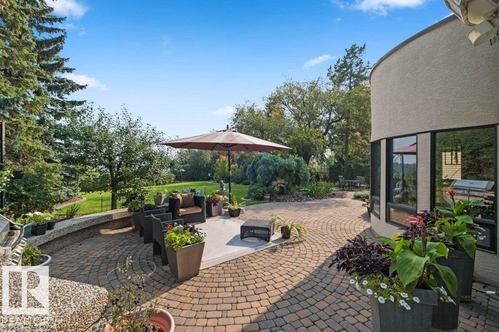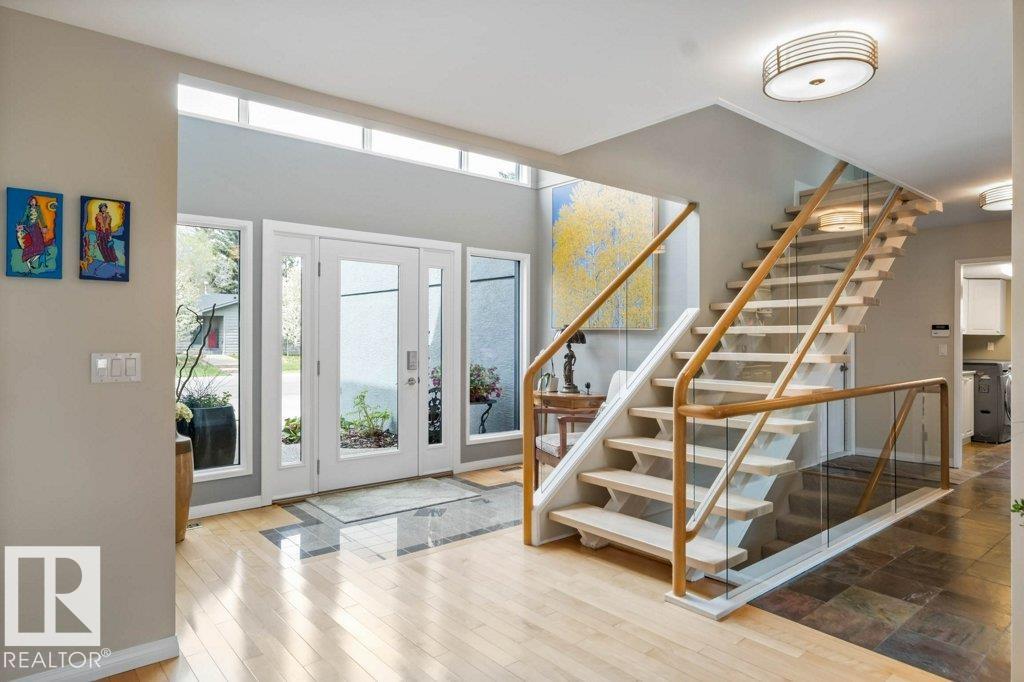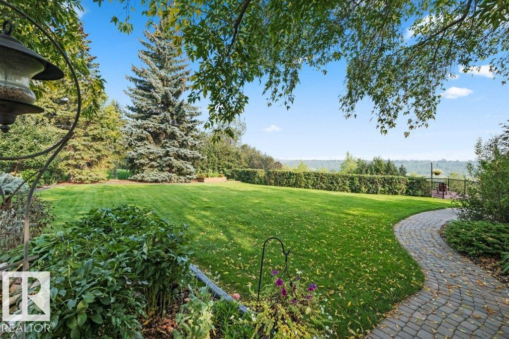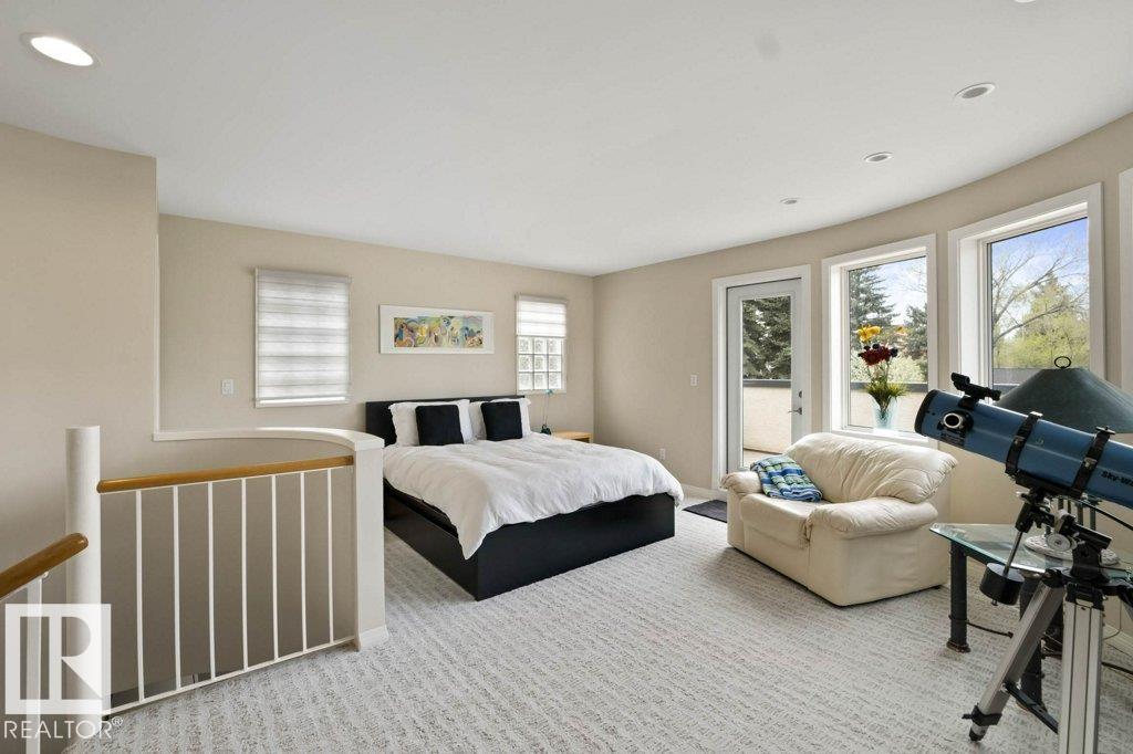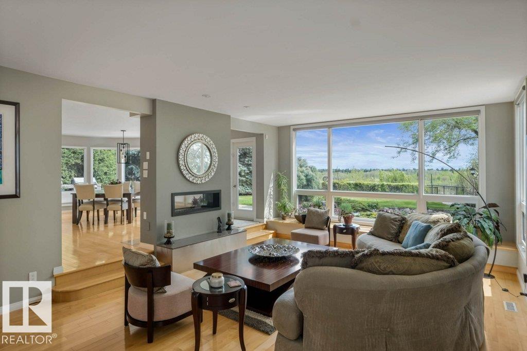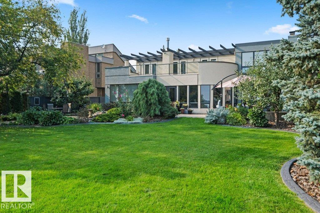 Peaceful. Private. River Valley Views. Elevated living on one of Rio Terrace Drive?s most coveted River view lot. This architectural West Coast modern 4+1 bedroom, 5 Bath home offers a rare blend of river valley views and serene, garden-wrapped seclusion for privacy. Expansive south-facing grounds are beautifully landscaped, creating intimate spaces for quiet moments or unforgettable entertaining. Inside, curated living areas are filled with natural light through oversized windows, while a 500 sq ft rooftop patio showcases stunning views and a seamless connection to nature. Meticulously maintained and highly livable, the home can be enjoyed as-is while you design your future dream home on this exceptional hard-to-replace lot. A 2-storey guest suite provides flexibility to suit your needs; use it for multi-generational living, as an in-home caregiver/nanny suite or a home business space. Minutes to central Edmonton, yet worlds away.