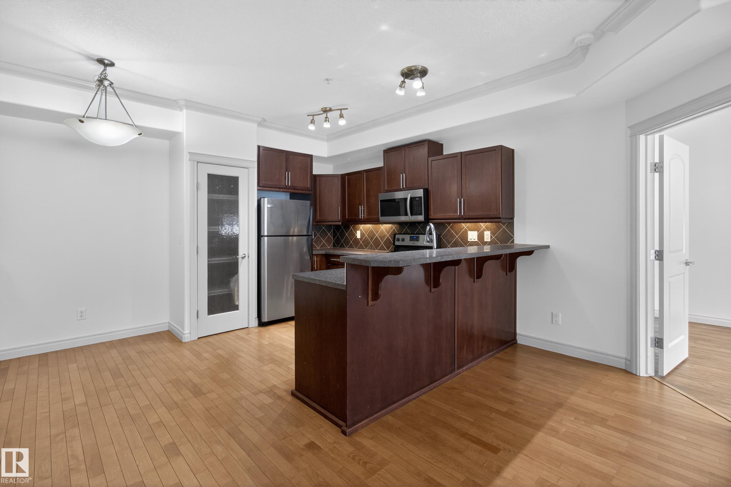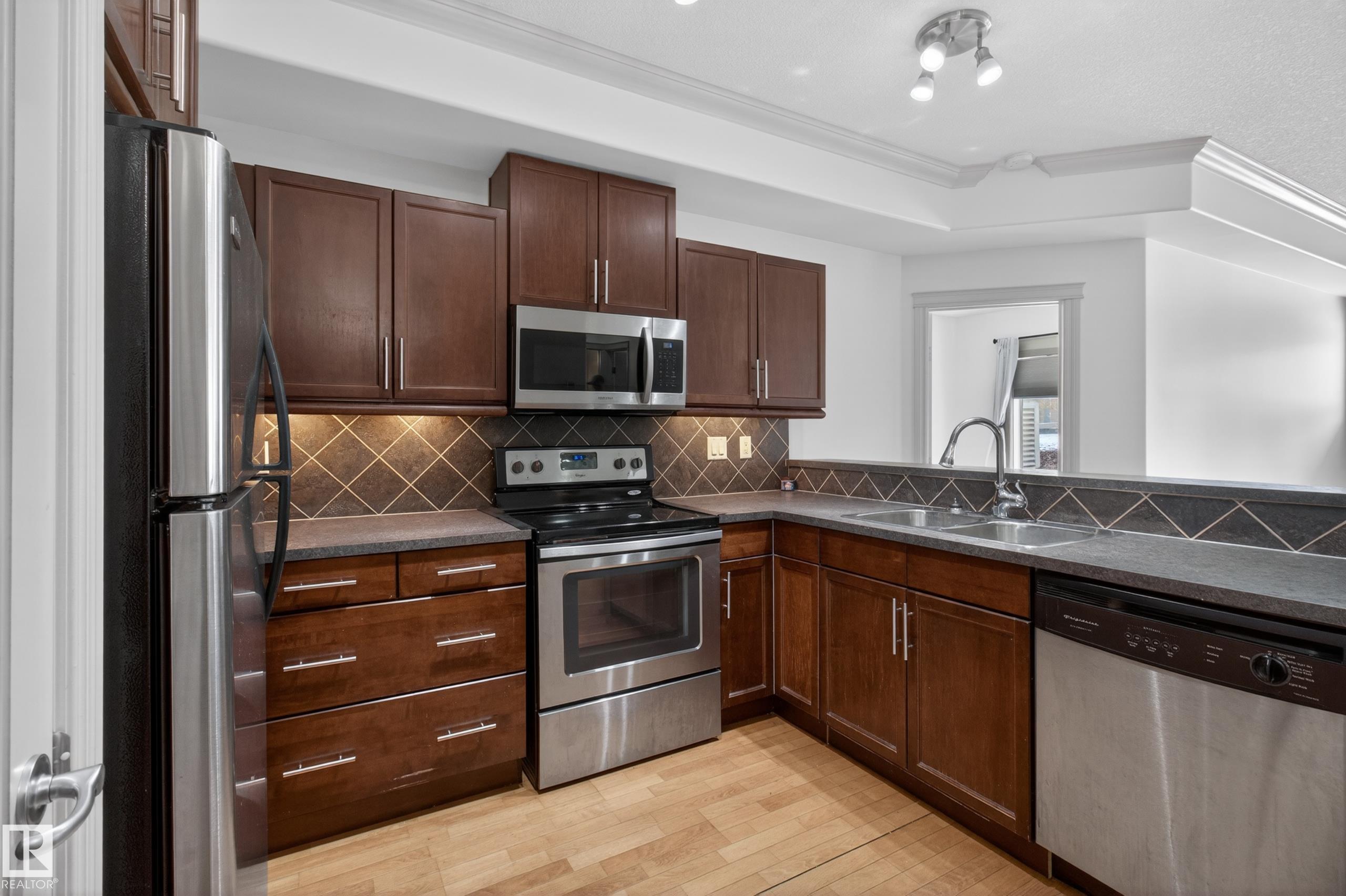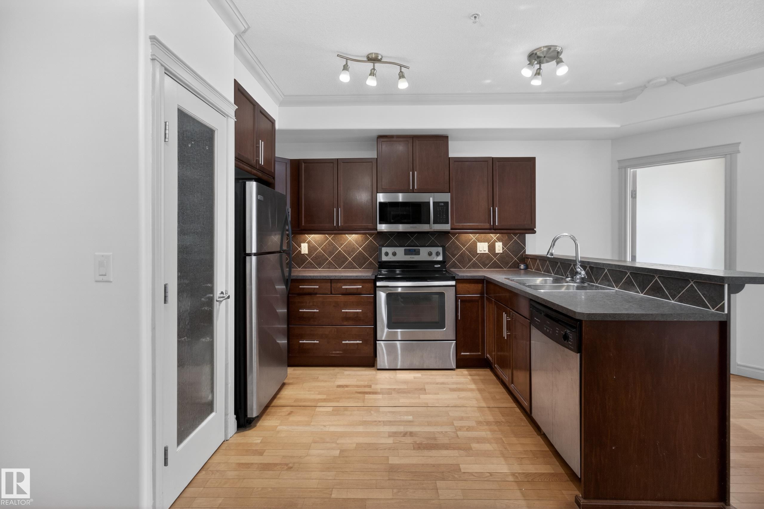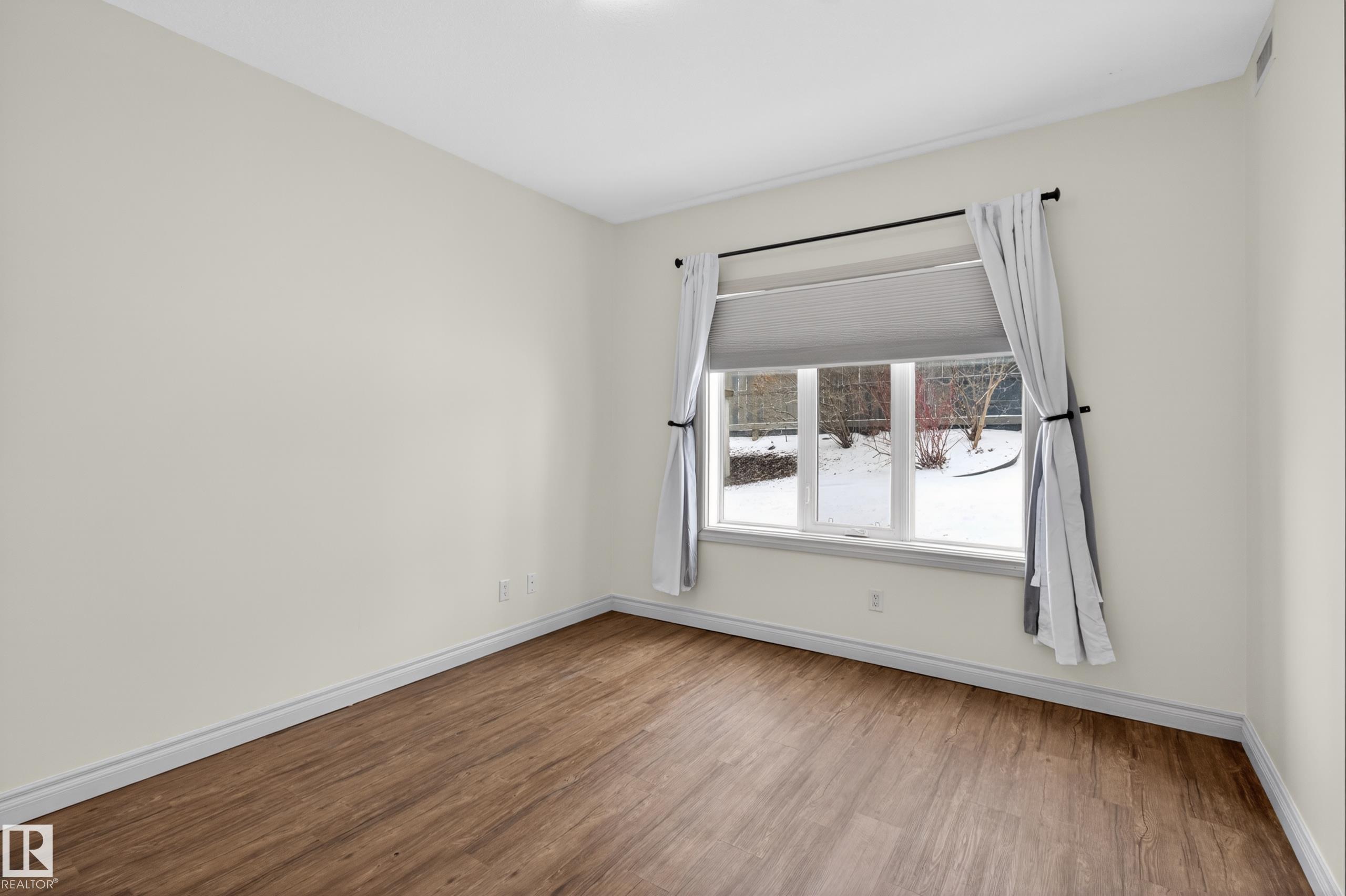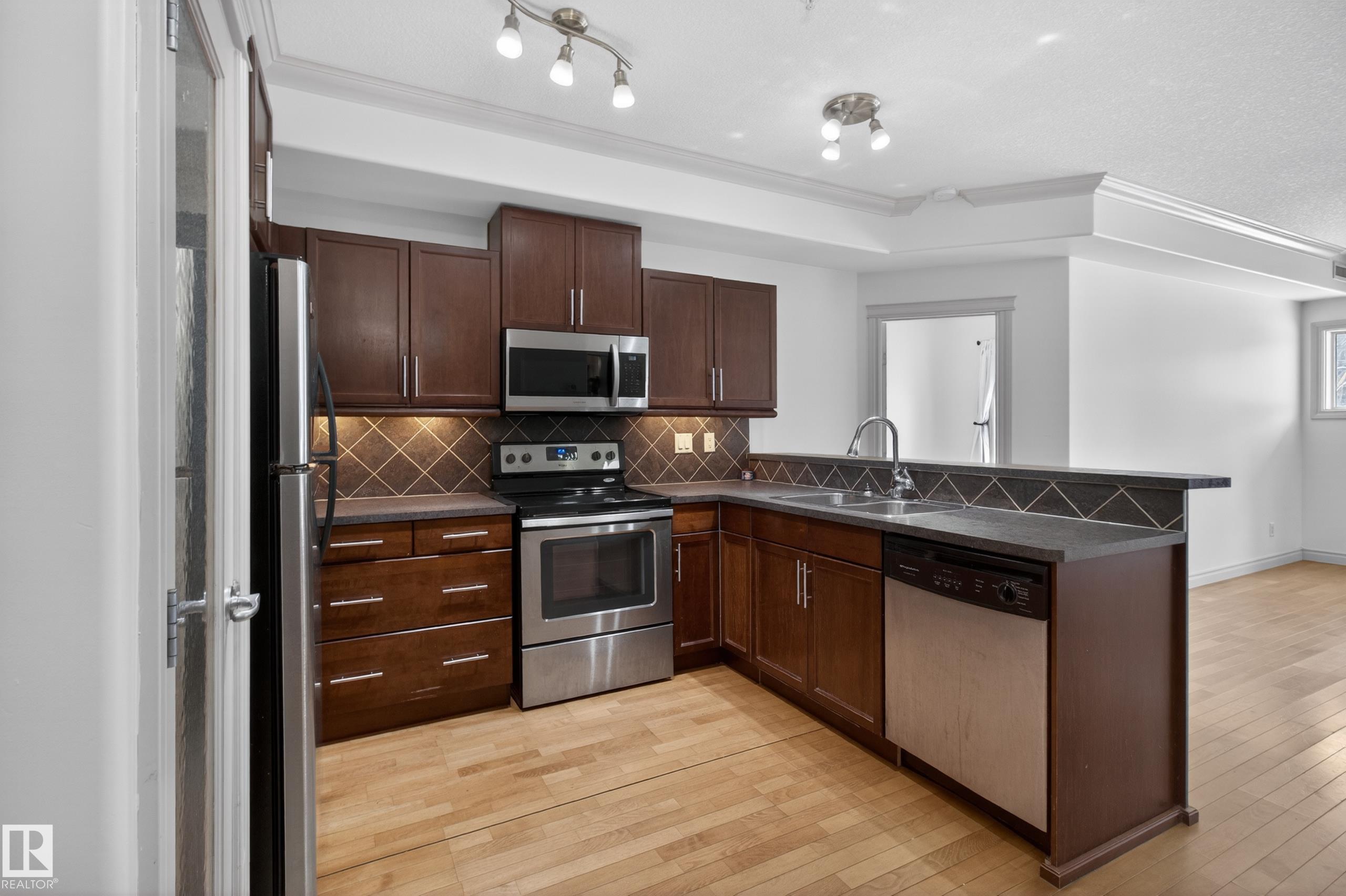 Bright, spacious, and one of the LARGEST layouts in Scona Gardens?this updated 2 BED/2 BATH condo offers exceptional value in a location that puts you right in the centre of it all. Freshly painted w/ hardwood floors through the main living areas and vinyl plank in the bedrooms, the open-concept design features a corner electric fireplace and a comfortable flow to your SOUTH-FACING PATIO backing a gated residents-only green space with natural gas BBQ hookup. The kitchen includes stainless steel appliances and ample counter space, while the primary bedroom offers a walk-in closet and full ensuite. Notable updates include a newer furnace (2026), stove (2025), washer & dryer (2025), microwave (2025), plus central A/C. Underground parking, in-suite laundry, and access to amenities such as a fitness room, guest suite, car wash, bike storage, and workshop add to the appeal. Steps to Whyte Avenue, the Old Strathcona Farmers? Market, the University of Alberta, 99 Street microbreweries, and Mill Creek Ravine.